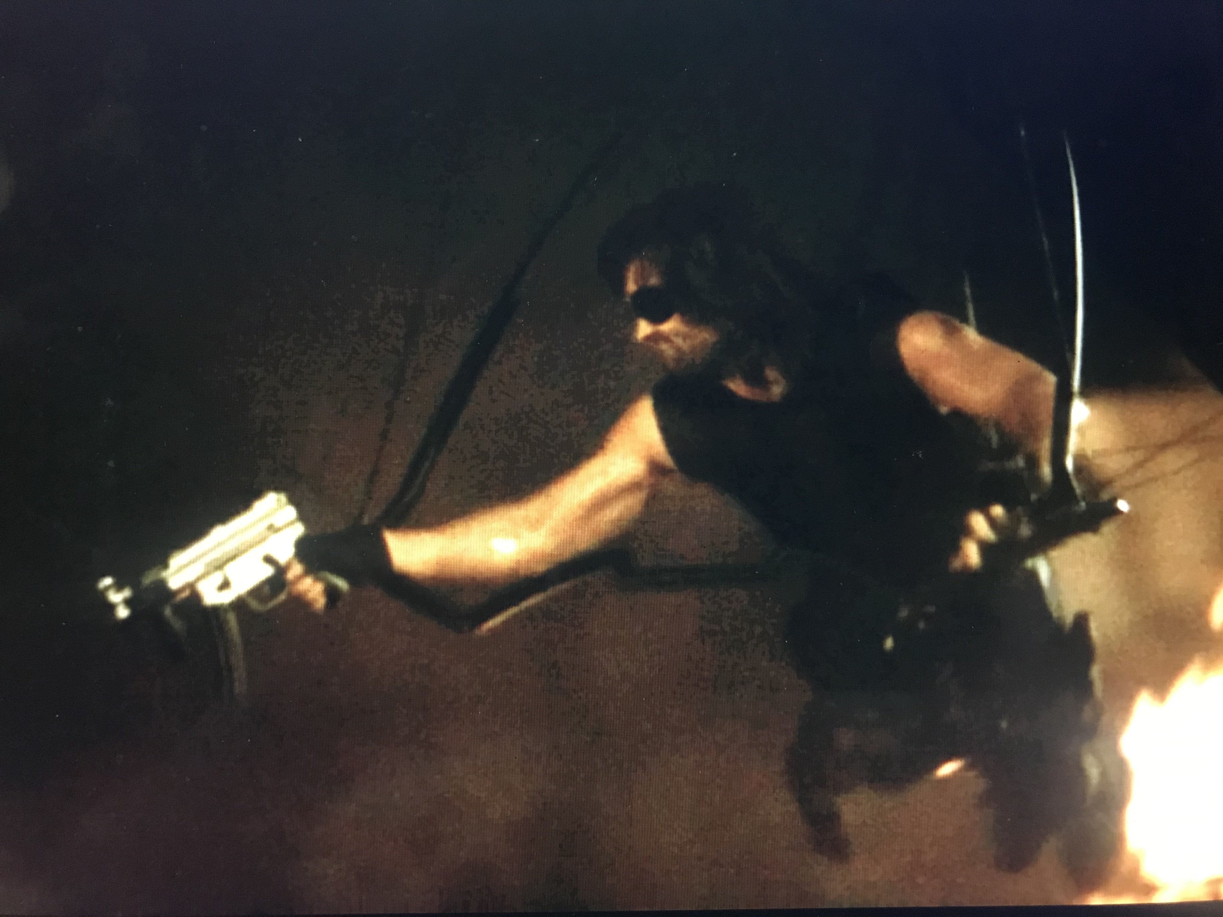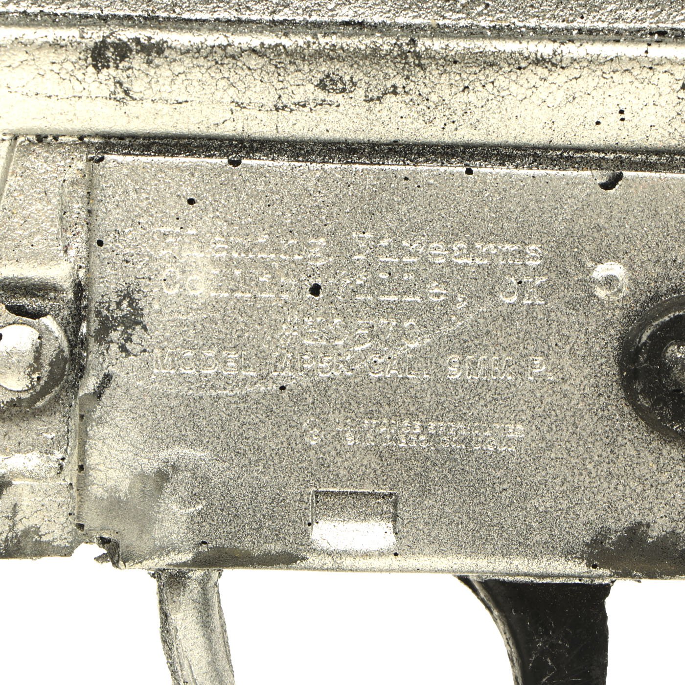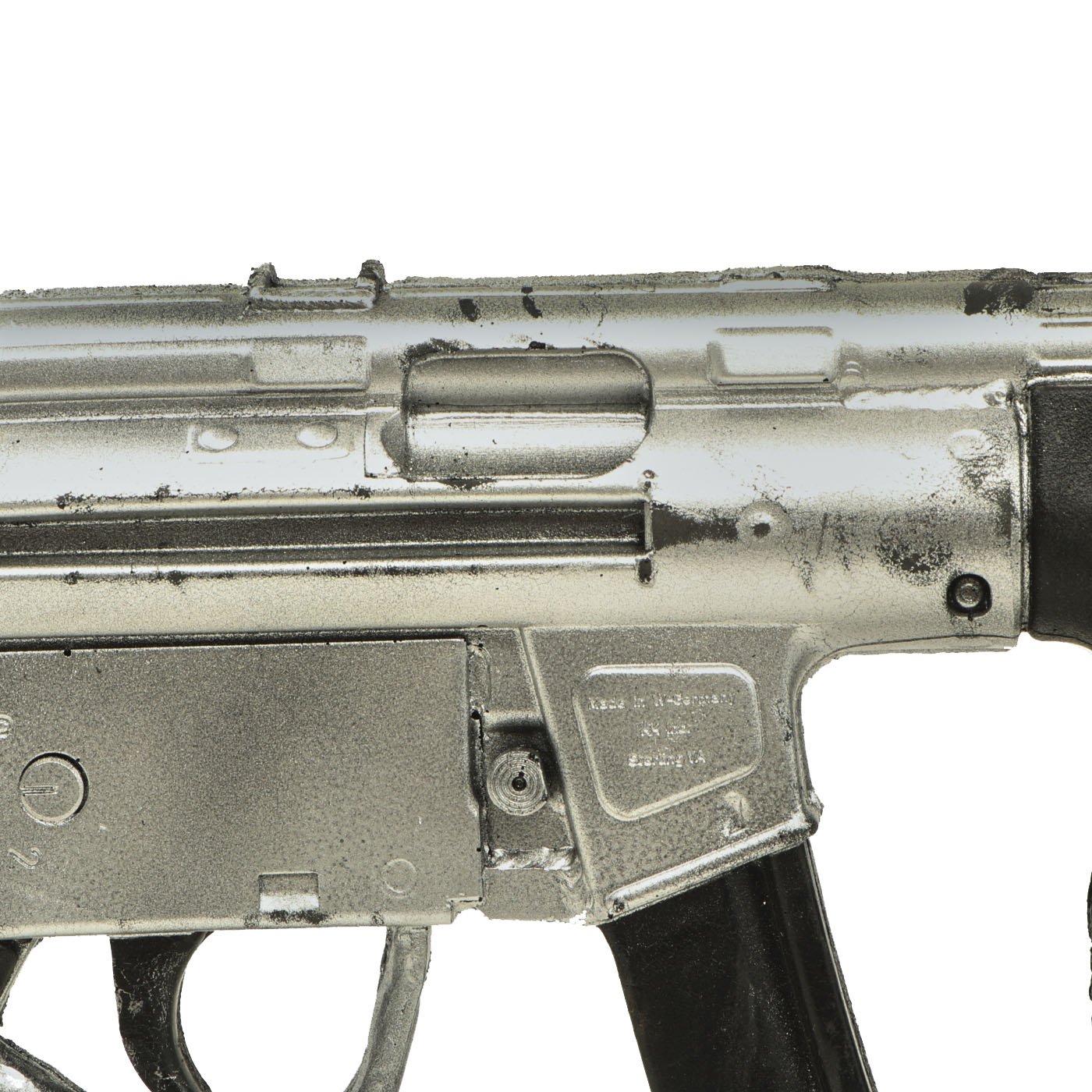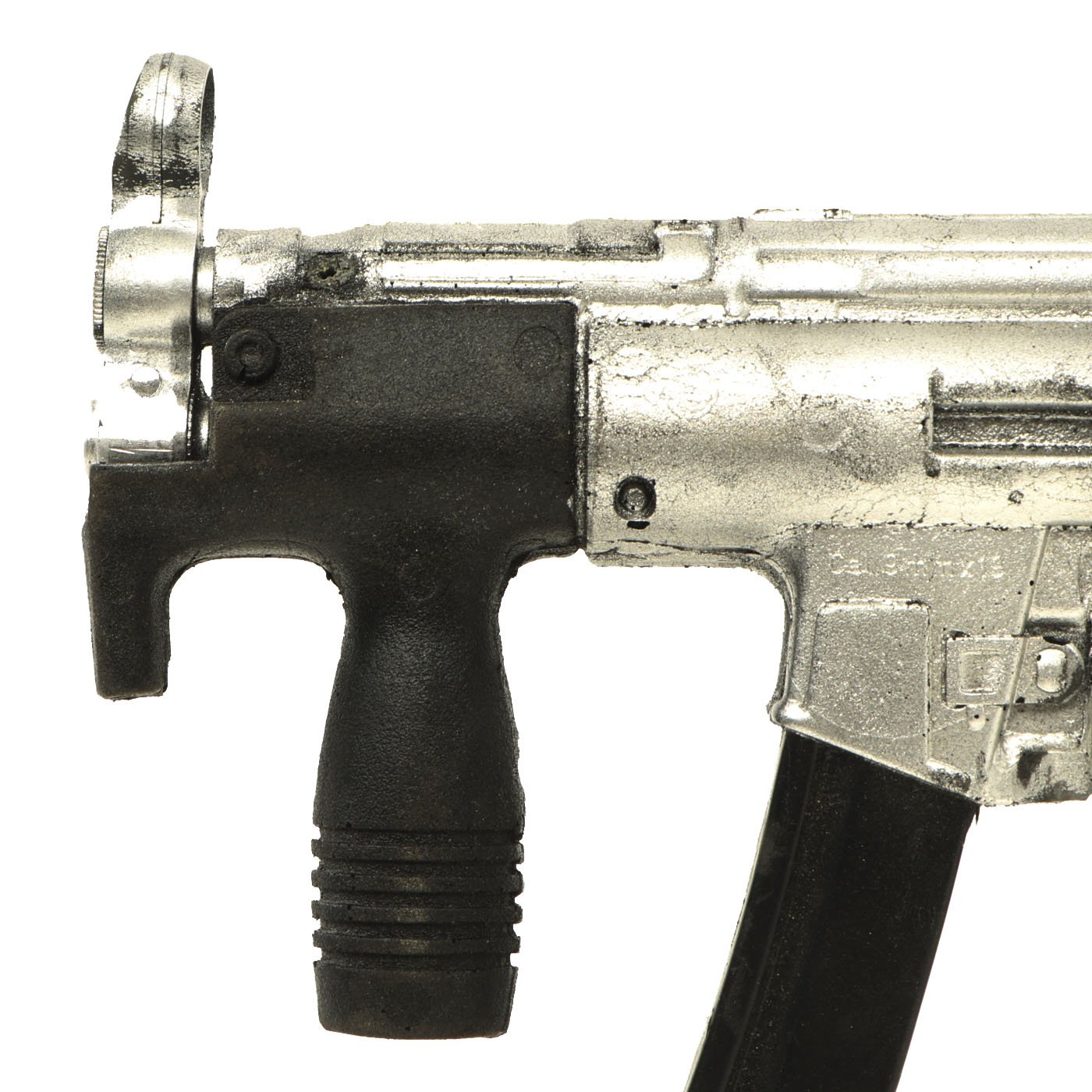 Howard Payne (Dennis Hopper) uses a nickel plated Heckler & Koch SP89 made to look like an MP5K by adding the MP5K foregrip and converting it to full-auto. It can be noted as an SP89 instead of an MP5K due to the lack of a paddle magazine release behind the magazine and lack of a push-pin lower receiver. According to the movie armorers, the filmmakers paid in advance for the armorers to send out the gun to be nickel plated. The weapon stayed Satin nickel until after 2001 when it was converted back to live fire.