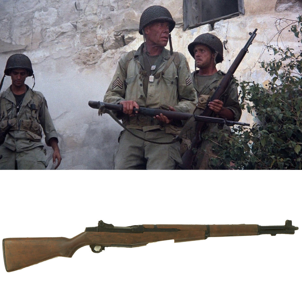 This would have been a "background" used prop gun and not a close up camera version. Dozens of background M1 Garand Rifles props were used in the making of The Big Red One and beyond this example appearing on a master list, we have no way to identify it being used in the film. Typically rubber guns are giving to actors when they are one vehicles and in faster motion. The M1 Garand is the chief weapon of the 1st Squad and is the weapon most frequently seen used by American forces in the film.