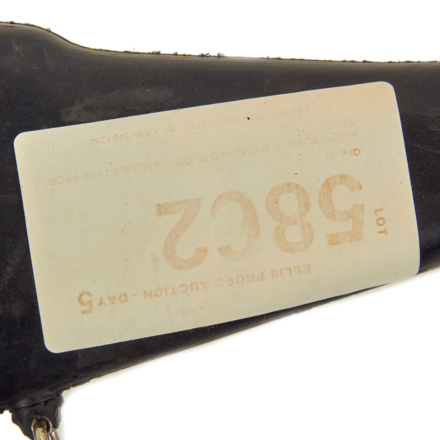 This all rubber example was acquired from the Ellis Props and Graphics liquidation auction. Ellis was the oldest and the largest Prop House in California until its liquidation auctions in late 1999 and early 2000. The original faded ELLIS AUCTION LABEL IS STILL ATTACHED to the butt stock of this prop gun and reads DAY 5, LOT 5862.