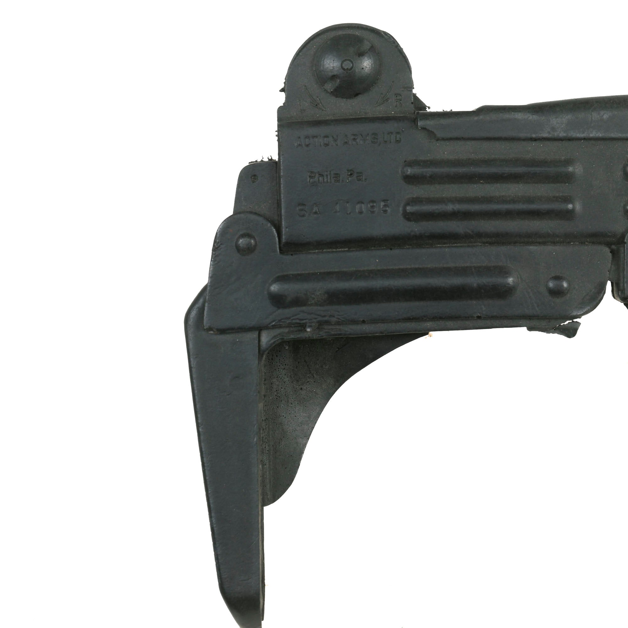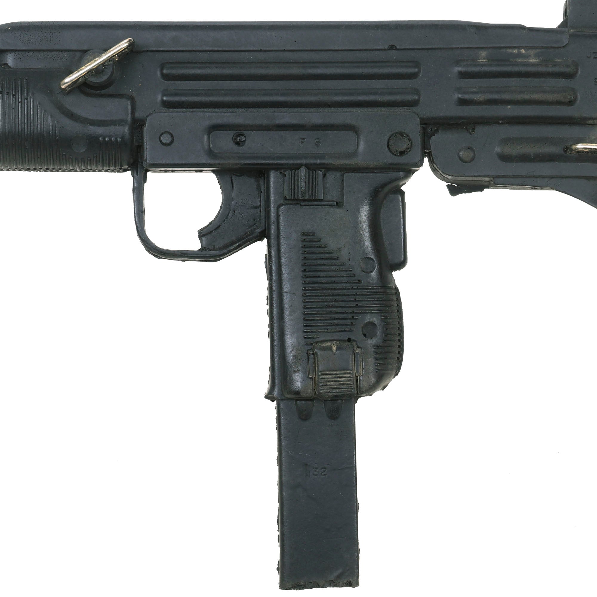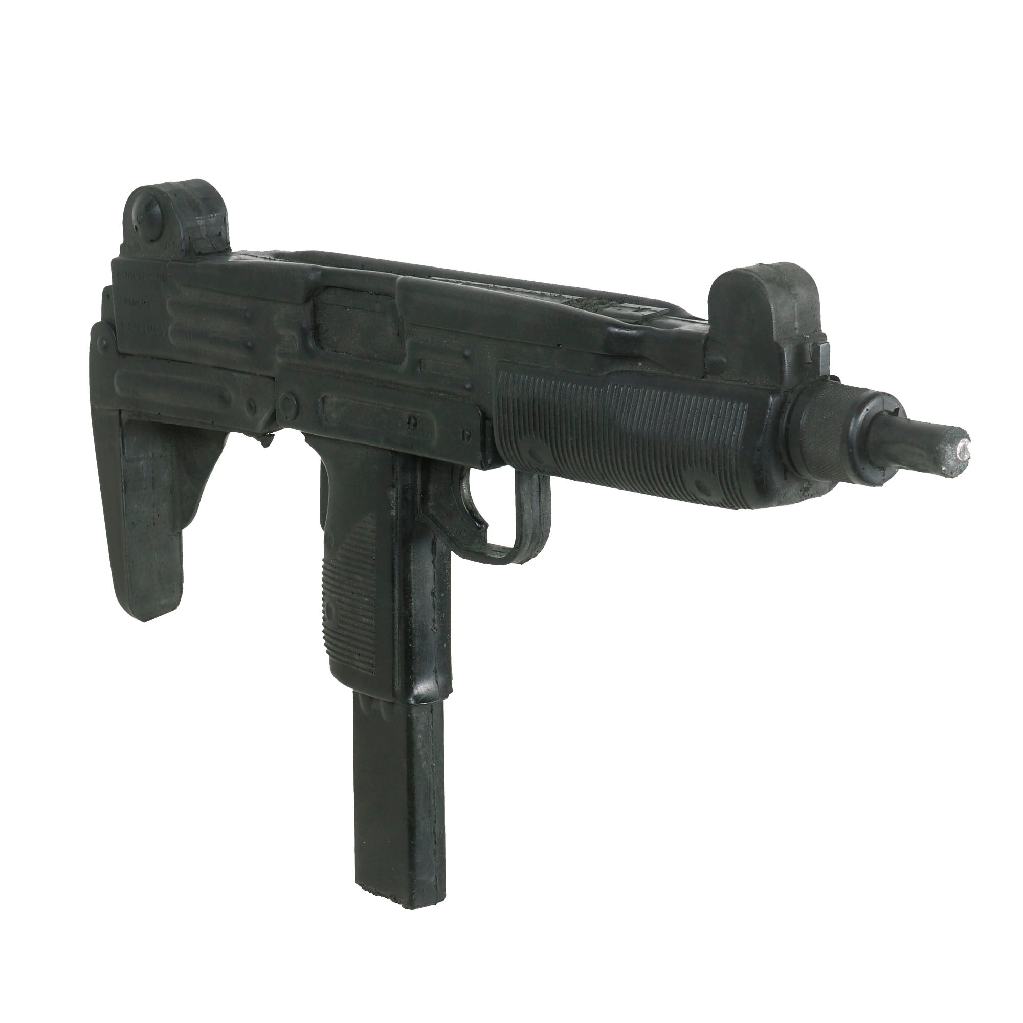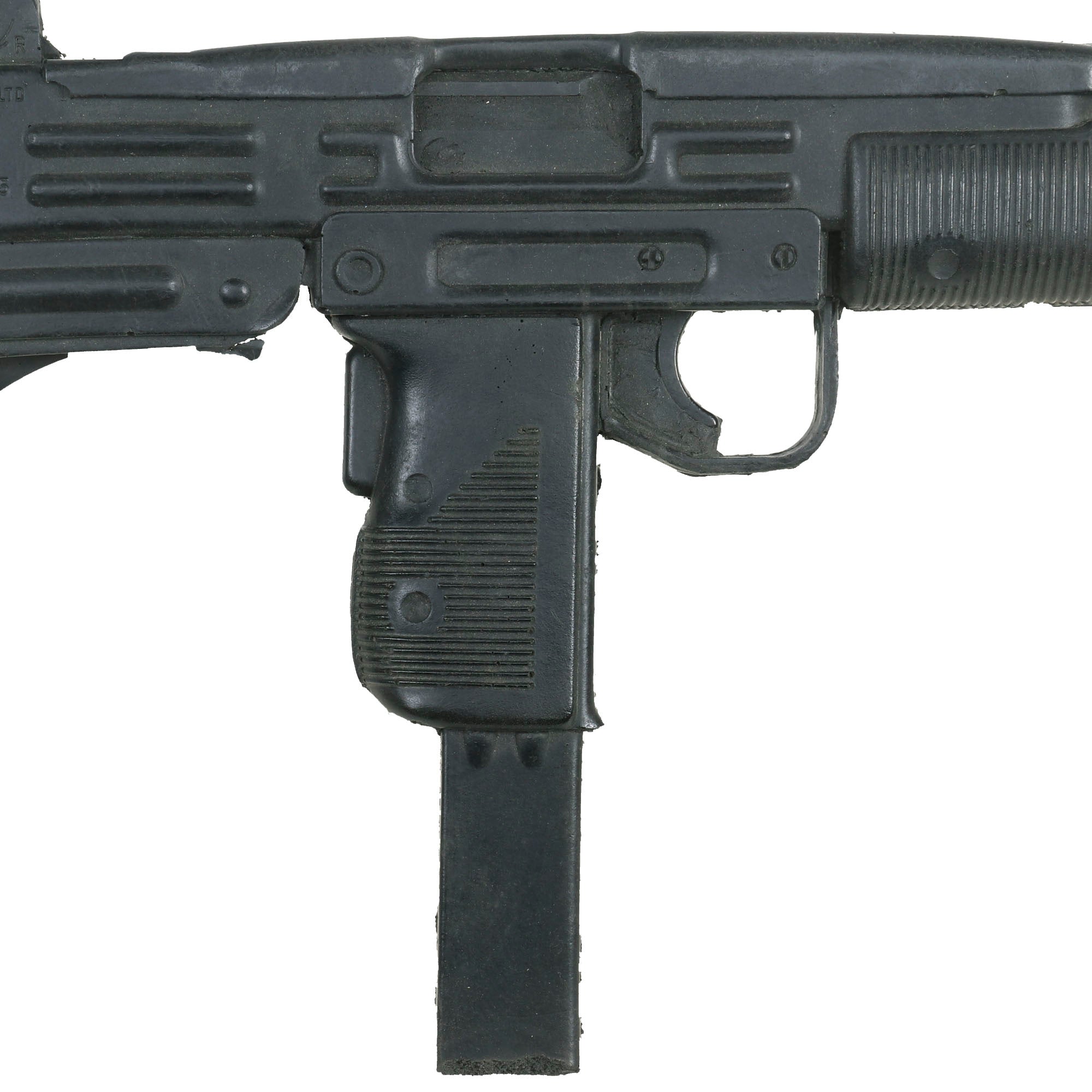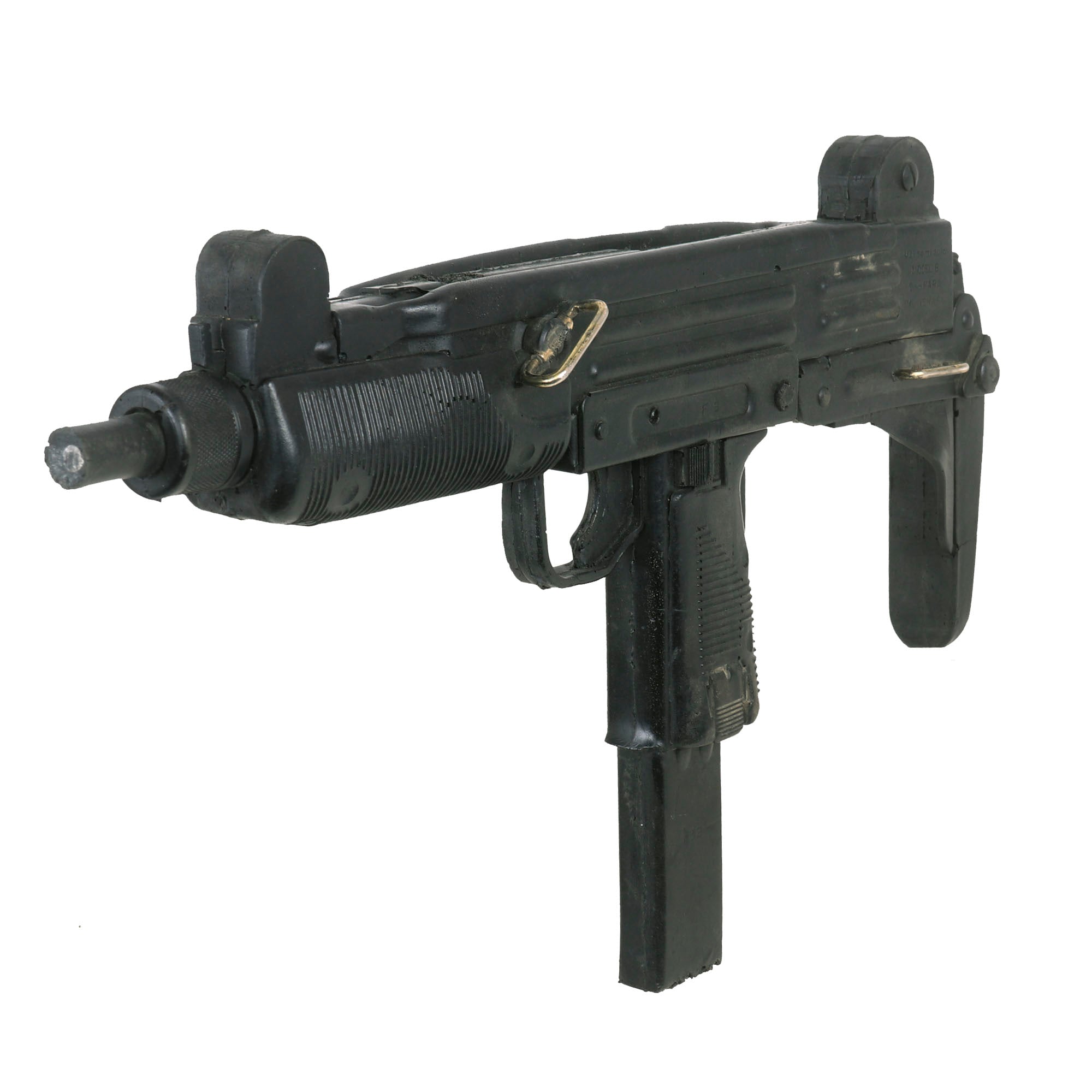 The Uzi is fully rubber minus two metal sling bars on the left side. It is made to exact specifications of the Model B 9mm PARA Uzi manufactured in Israel. It is marked on the left side “UZI semi auto MODEL B 9mm PARA IMI - ISRAEL”. On the right side, it’s marked “ACTION ARMS, LTD. Phila, PA. SA 41095”. It does not function as a firearm and has no moving parts. The Uzi is in overall good condition with some scuffs as shown. It measures about 17” long. Paul Sinacore is credited as "Uzi Gunman” on the imdb page.