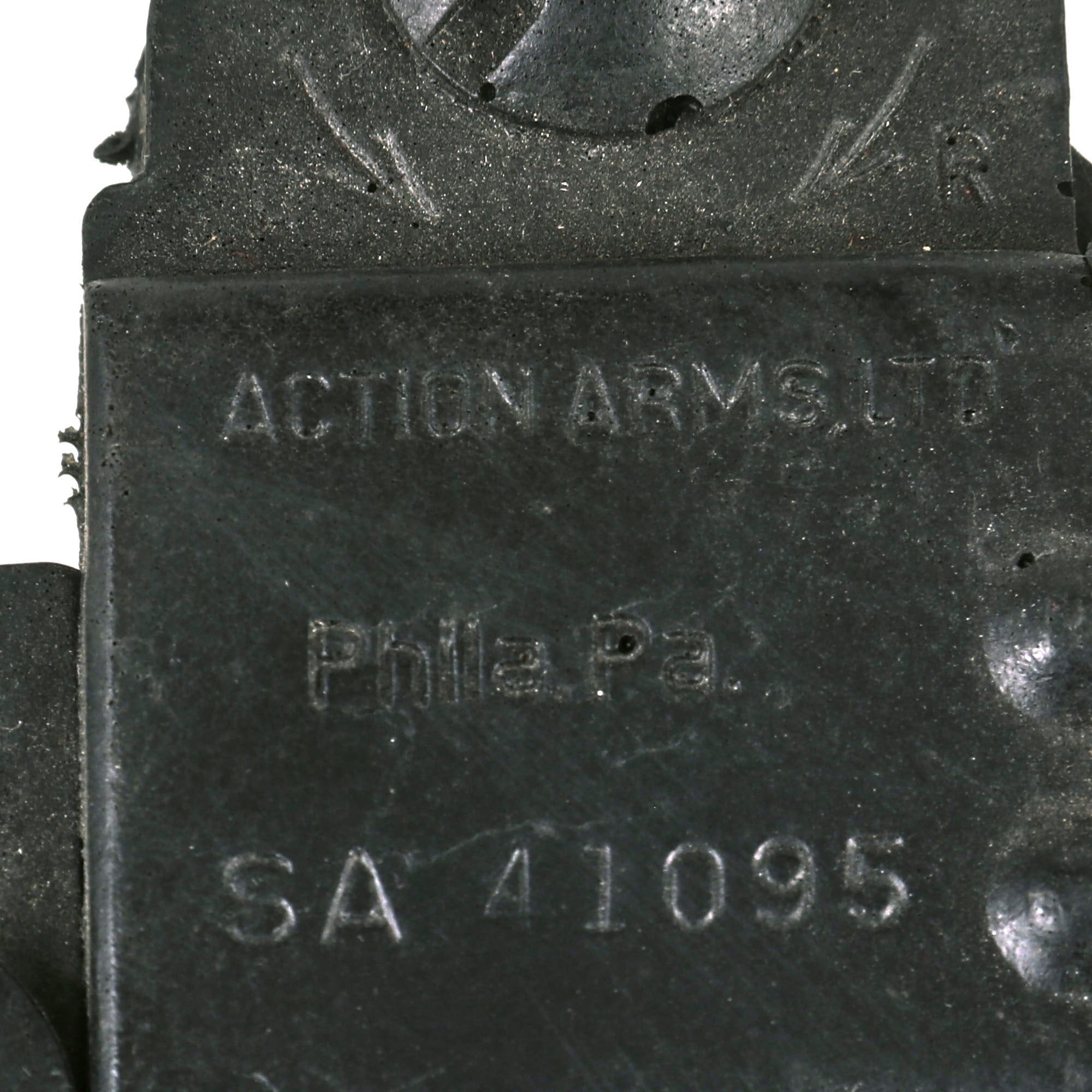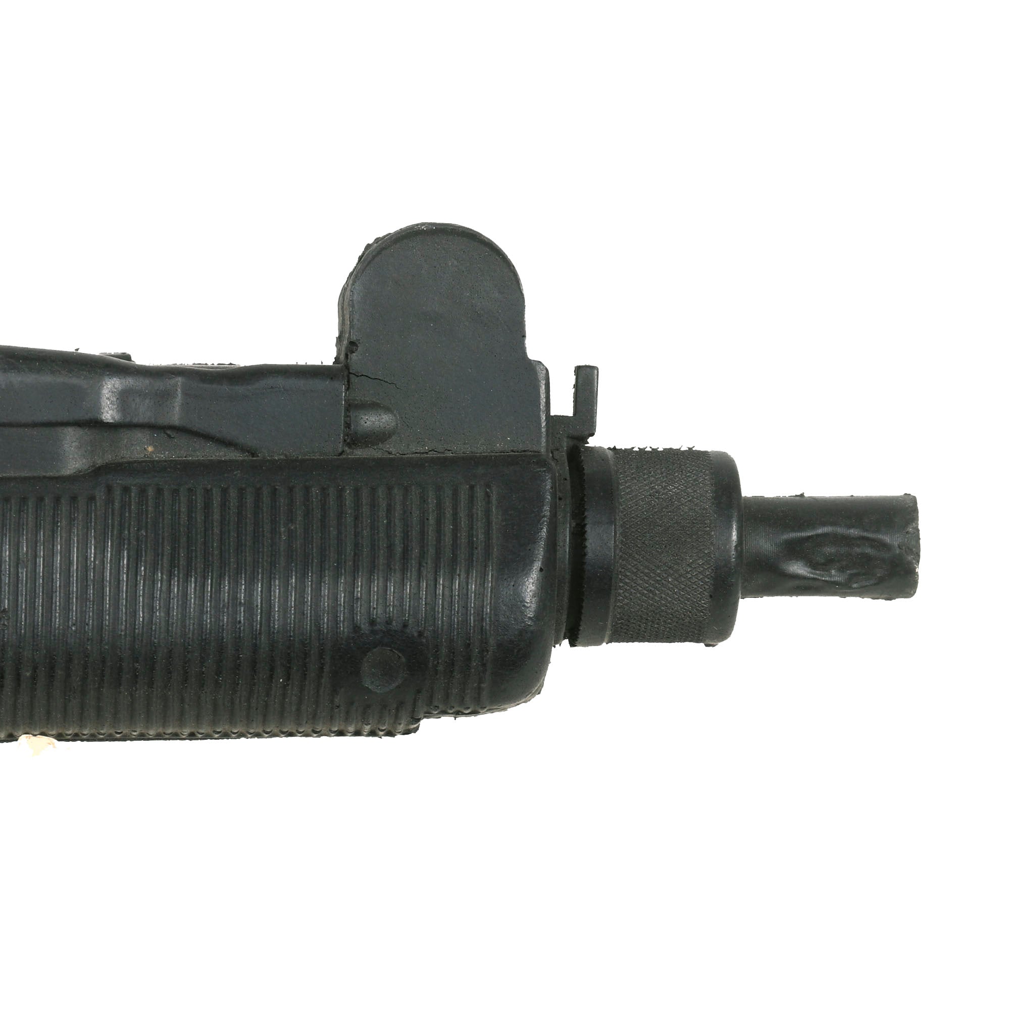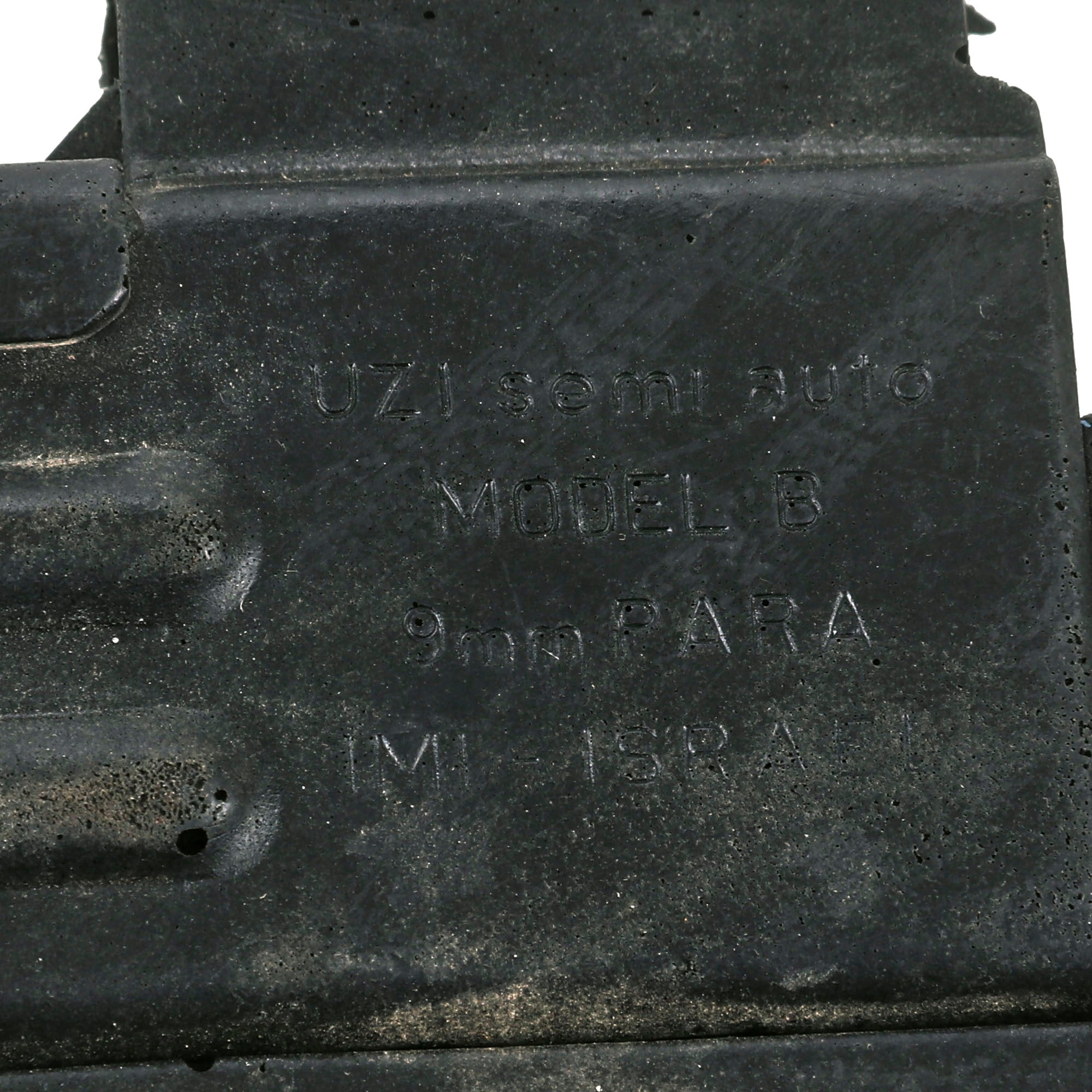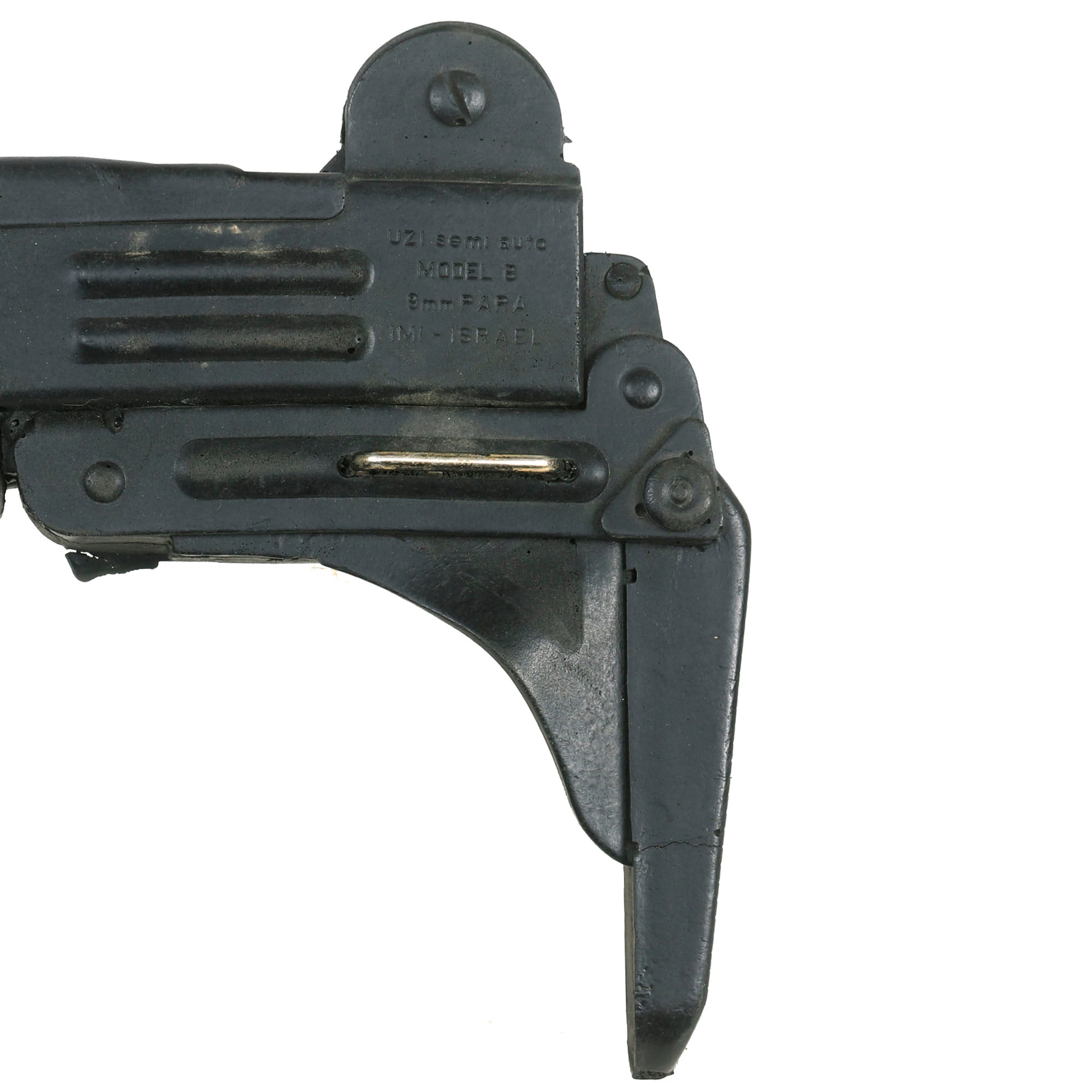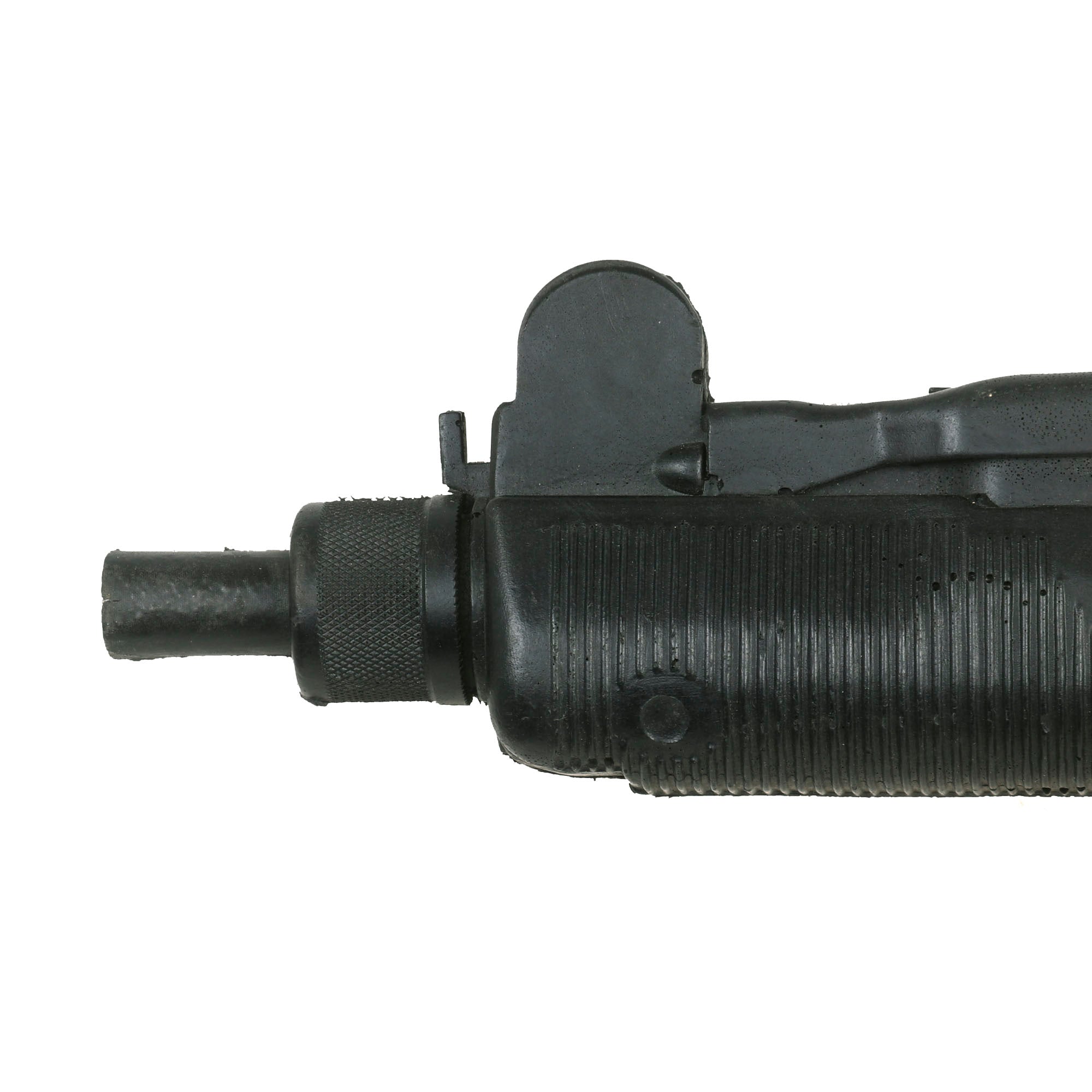 The Uzi is fully rubber minus two metal sling bars on the left side. It is made to exact specifications of the Model B 9mm PARA Uzi manufactured in Israel. It is marked on the left side “UZI semi auto MODEL B 9mm PARA IMI - ISRAEL”. On the right side, it’s marked “ACTION ARMS, LTD. Phila, PA. SA 41095”. It does not function as a firearm and has no moving parts. The Uzi is in overall good condition with some scuffs as shown. It measures about 17” long. Paul Sinacore is credited as "Uzi Gunman” on the imdb page.