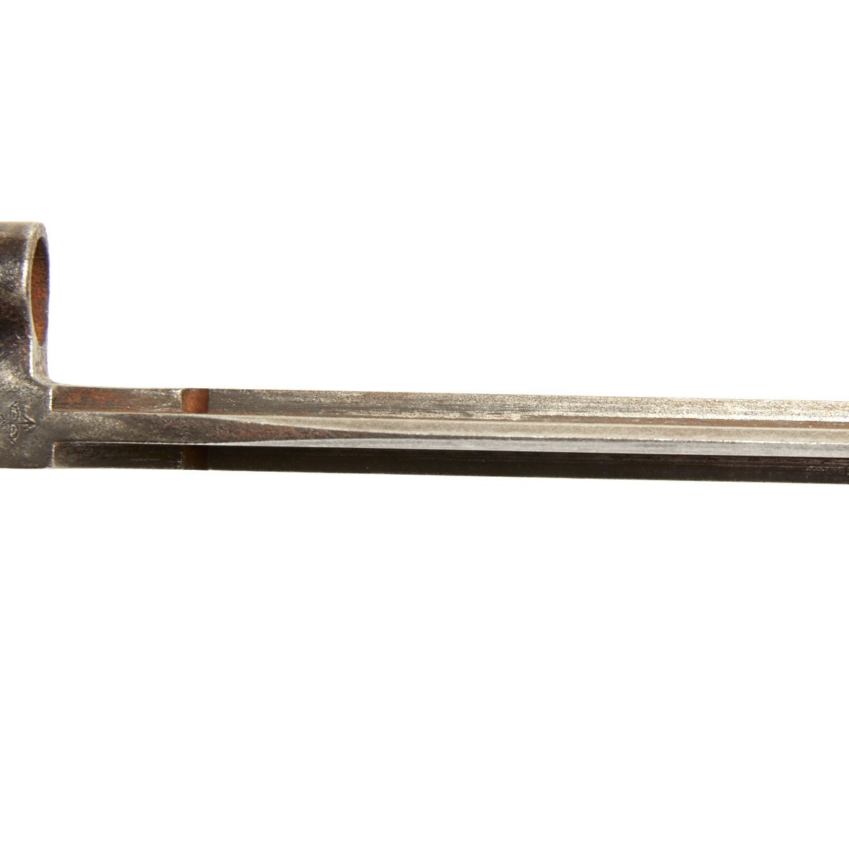 It measures 15" overall with a 12" blade. The underside of the rear of the blade bears correct Imperial Russian stampings and maker's logo. This bayonet was speculated for use by "Elite" or "Special" units as per KEISLING. Said to have originally been covered in a blued finish this example has largely returned to a dull steel finish with evidence of blue in the corners.