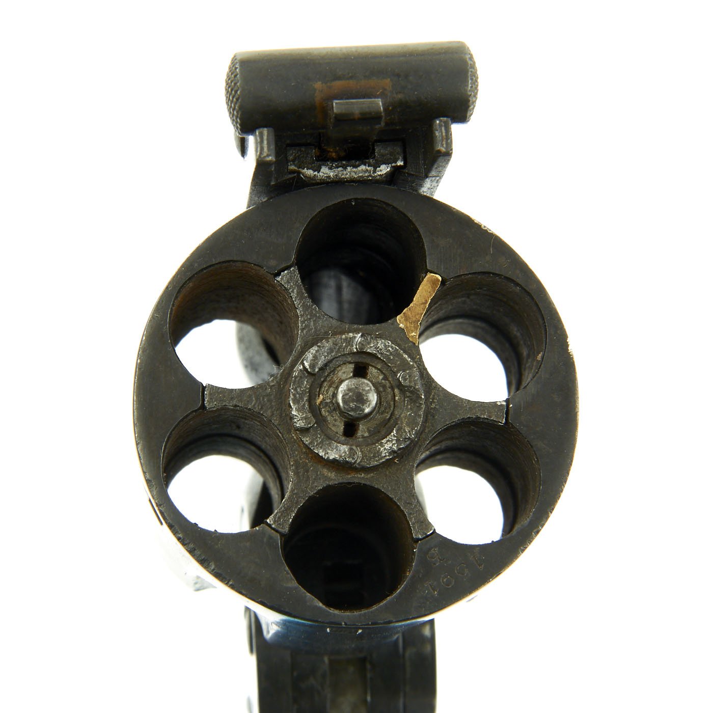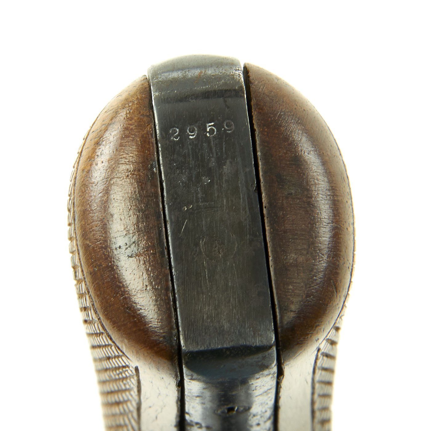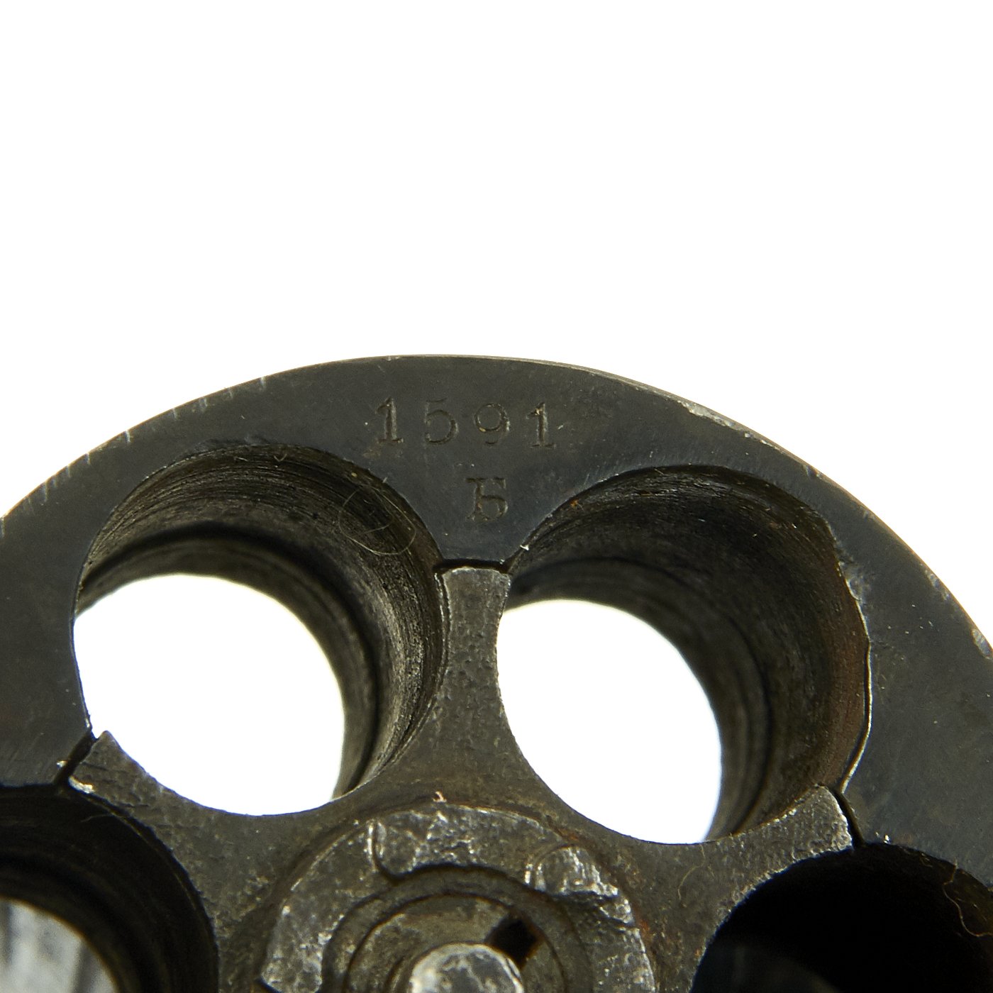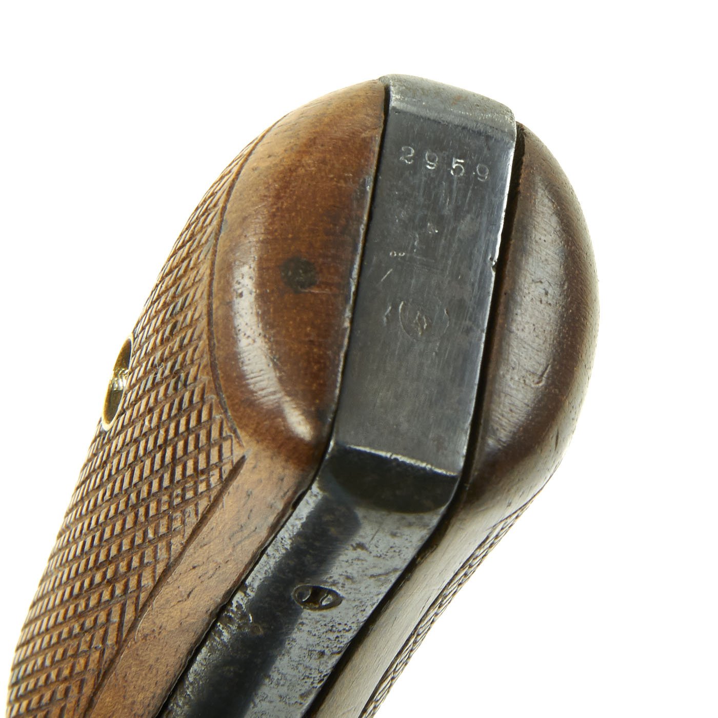 Most of the Russian Contract revolvers made by Loewe were marked in Cyrillic, so it's possible that this example was sold privately. The revolver has definitely been refinished, and has had the original smooth grips replaced with checkered grips. However the serial number 2959 is still visible on both the top strap (faint) and grip frame. The rear of the cylinder has a different serial number, so it was swapped out in Russian service. The revolver functions, but has significant wear on the internals, so it is quite finicky.