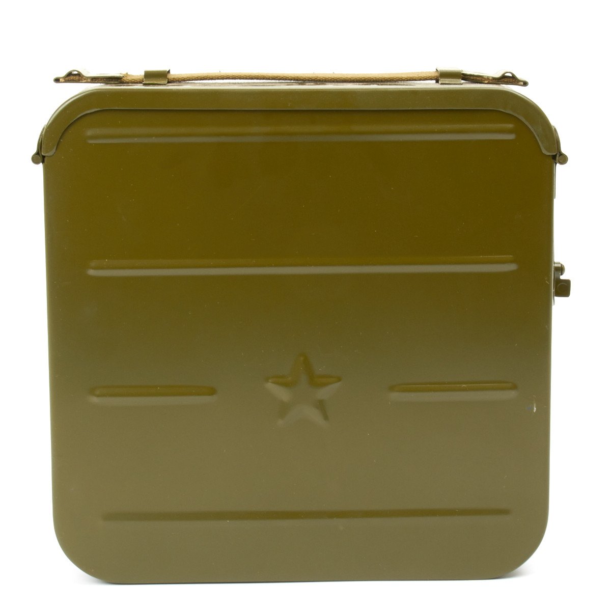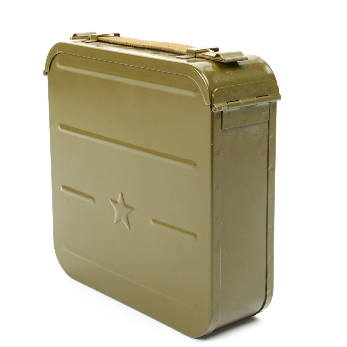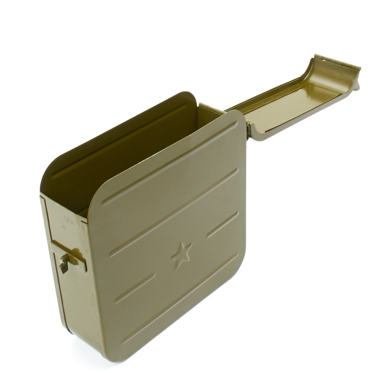 Original Item: Imported from Eastern Europe these are unissued Cold War Maxim Belt Cans in very good condition. Complete with impressed "Star" on each side of the body. Maxim belt cans are not rare, but this model with the impressed "Star" in is very hard to find. Offered empty (no belt).