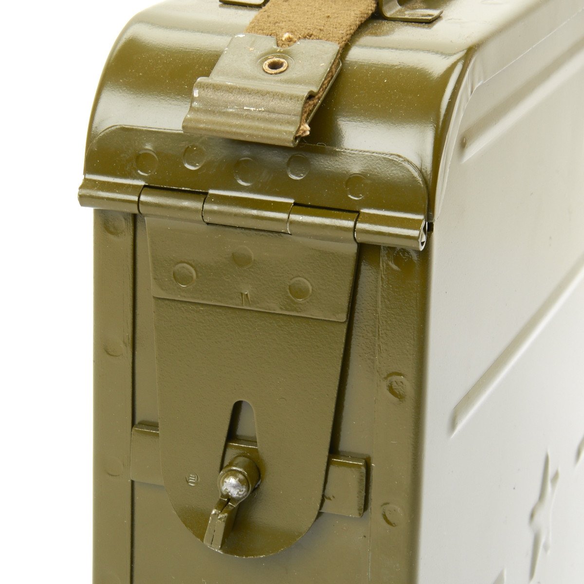Note: Some of these with the impressed "Bullet" on the closure lid to indicate in which direction the Ammunition Belt should be laid into the Can. Most do not have this marking.