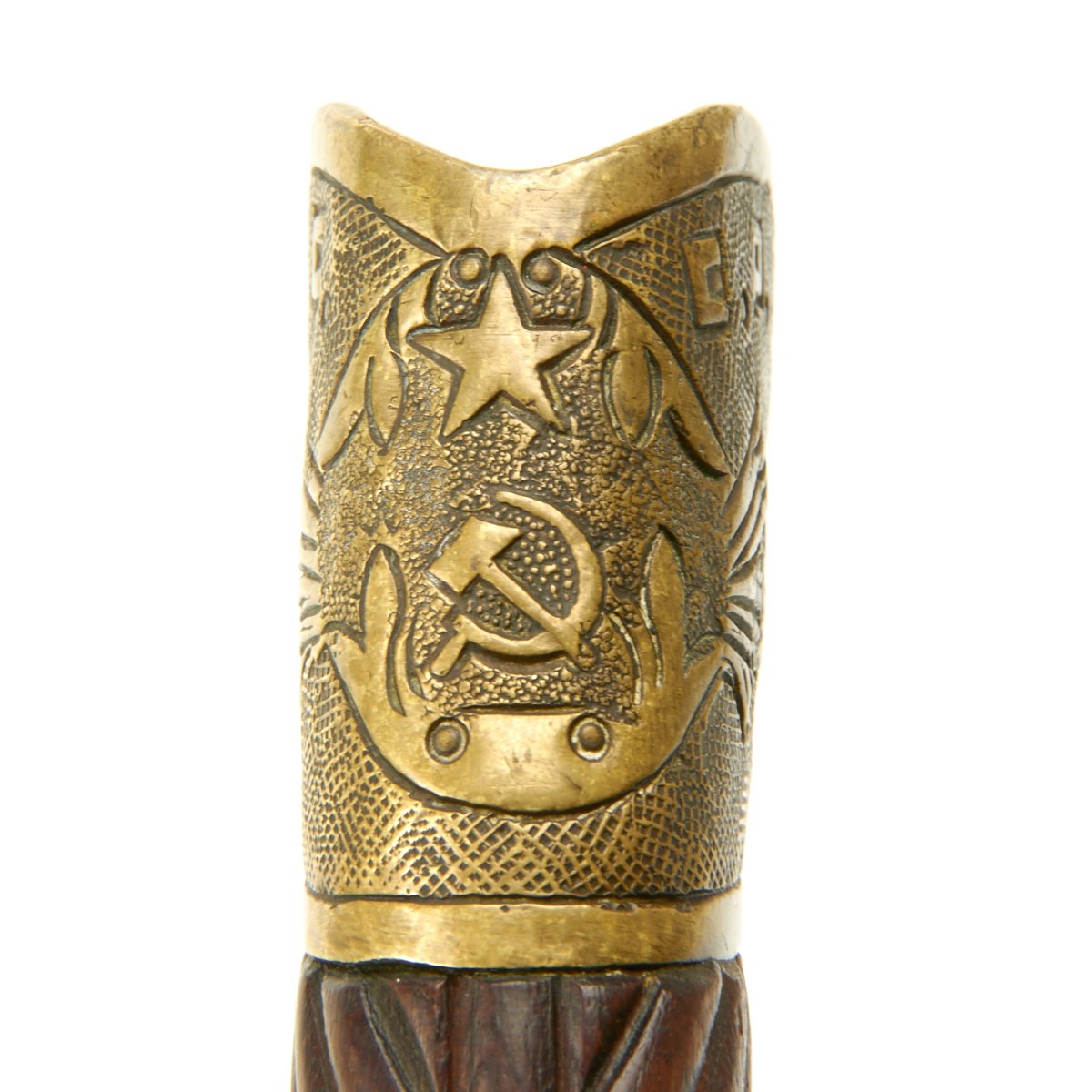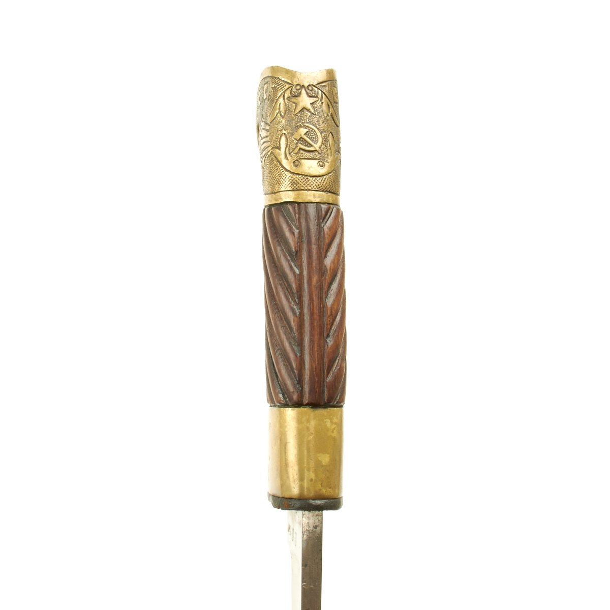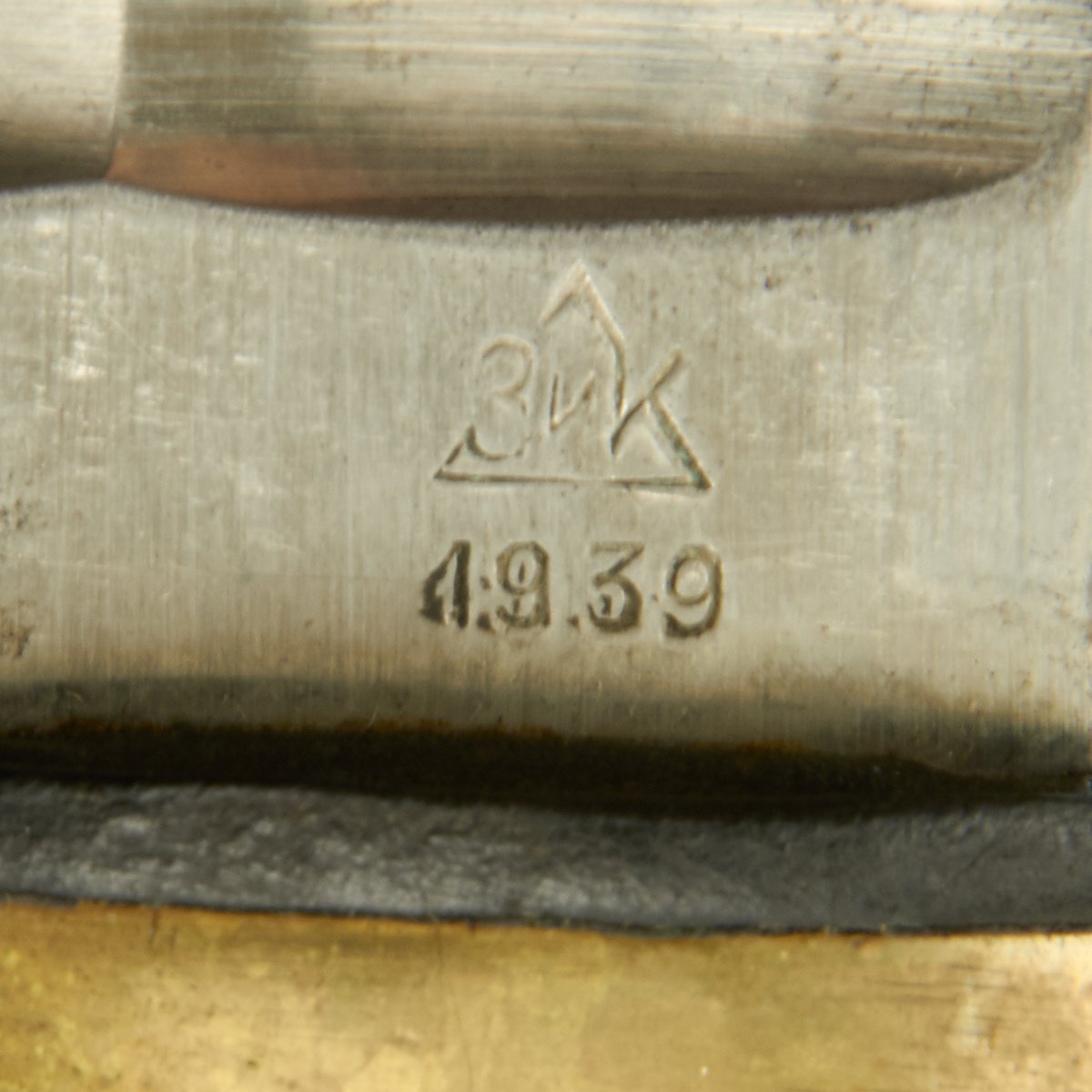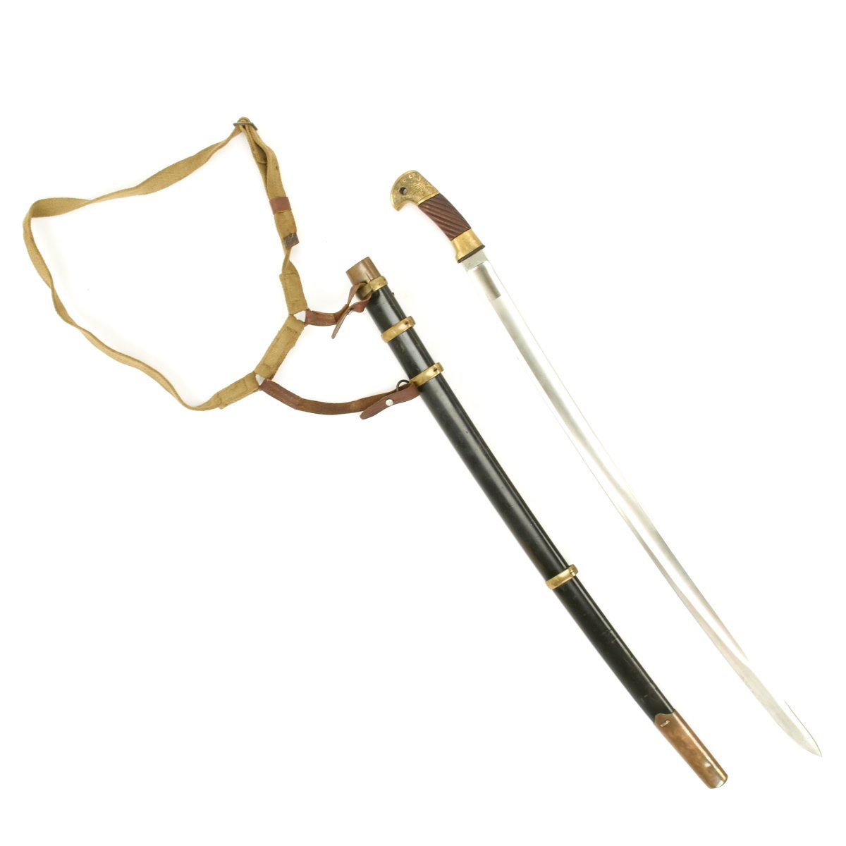 Our Cossack Shashqua is a Soviet issued weapon bearing "C.C.C.P." cast into the brass pommel around a Hammer and Sickle. The blade which is still highly polished has Soviet armorer markings and is dated 1939. The traditional Shashqua scabbard is constructed of a canvas covered wood body which is coated in a hard black wax like material supported by brass mounts. The scabbard also bears brass mounts to accommodate the M-1891 of M-1891/30 Mosin-Nagant Rifle socket bayonet (Not Included). Finally and most important the scabbard bears a magnificent nickel plated spread Eagle over Swas badge denoting the weapons use by the Don Cossacks. Additionally the Saber comes with its original webbing and leather over the shoulder body sling/harness allowing the saber to be correctly worn in an upside down position on the left side.
