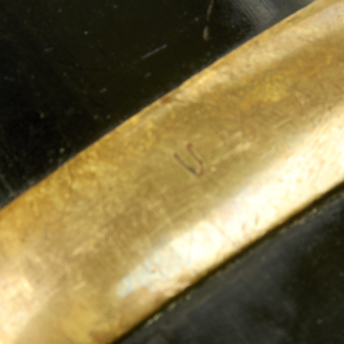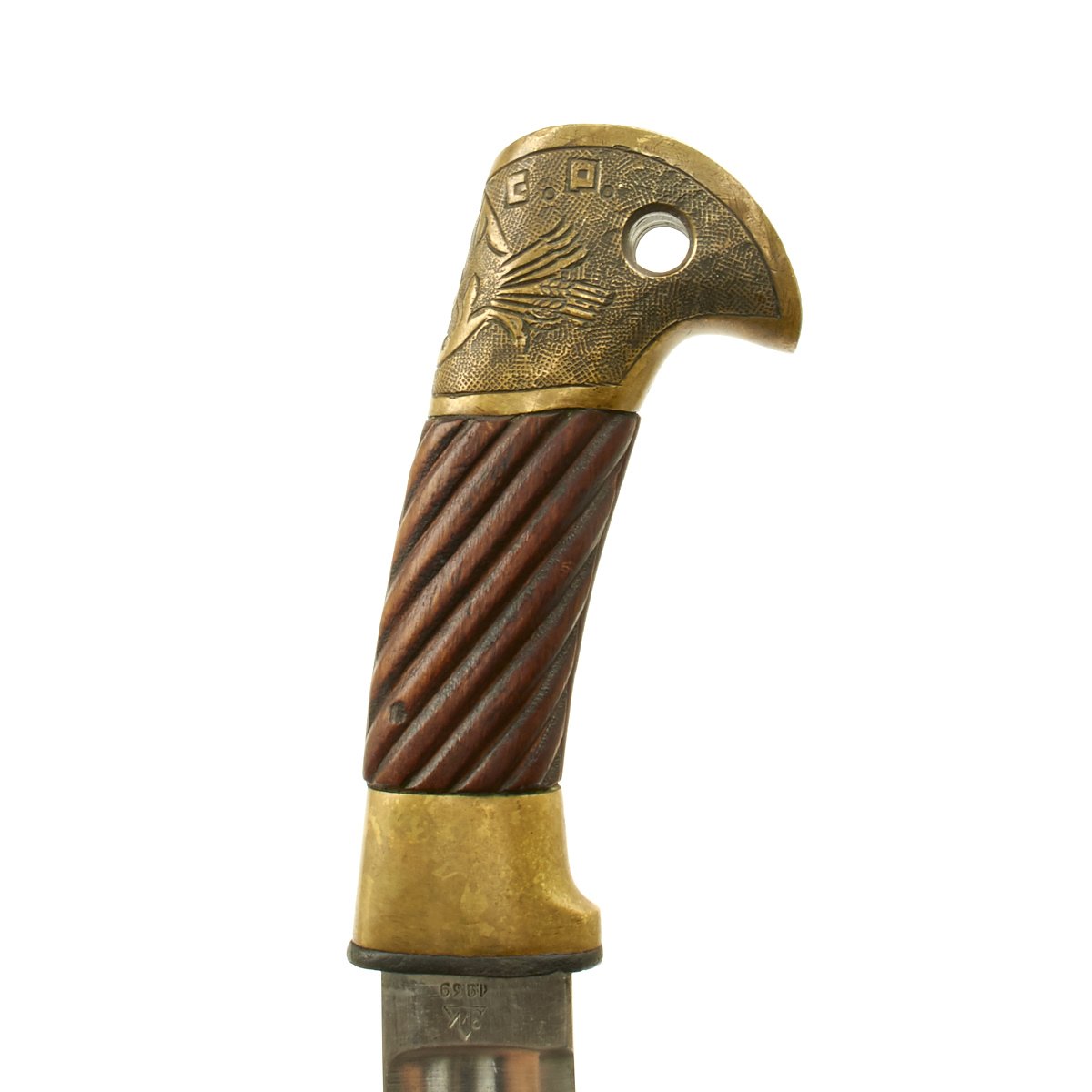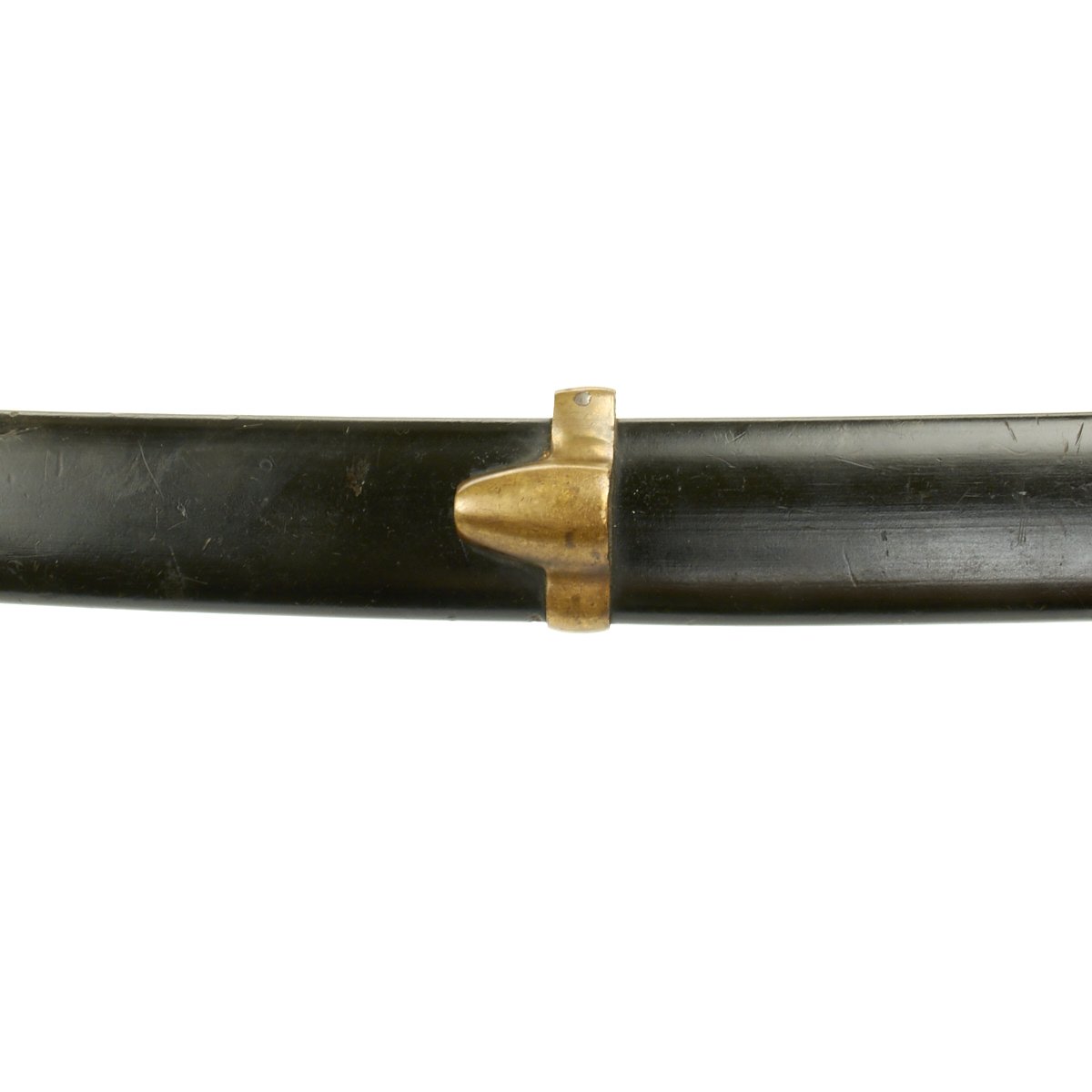 Our Cossack Shashqua is a Soviet issued weapon bearing "C.C.C.P." cast into the brass pommel around a Hammer and Sickle. The blade which is still highly polished has Soviet armorer markings and is dated 1939. The traditional Shashqua scabbard is constructed of a canvas covered wood body which is coated in a hard black wax like material supported by brass mounts. The scabbard also bears brass mounts to accommodate the M-1891 of M-1891/30 Mosin-Nagant Rifle socket bayonet (Not Included). Finally and most important the scabbard bears a magnificent nickel plated spread Eagle over Swas badge denoting the weapons use by the Don Cossacks. Additionally the Saber comes with its original webbing and leather over the shoulder body sling/harness allowing the saber to be correctly worn in an upside down position on the left side.