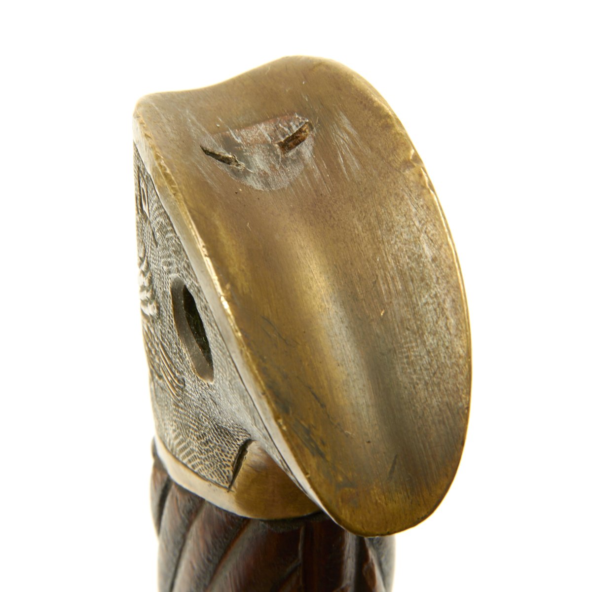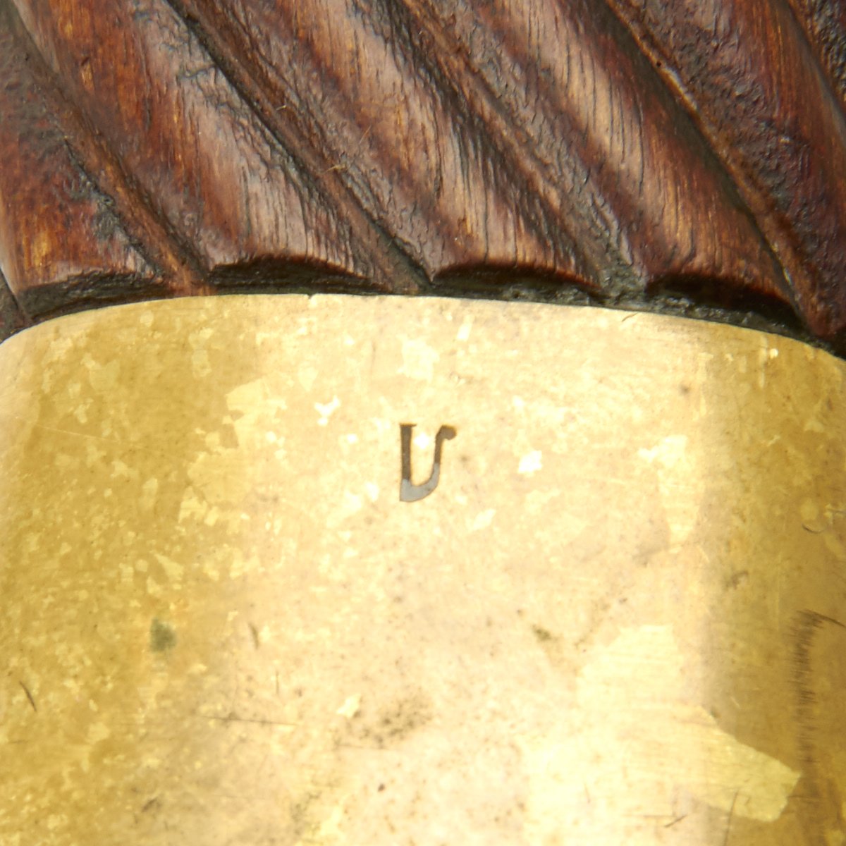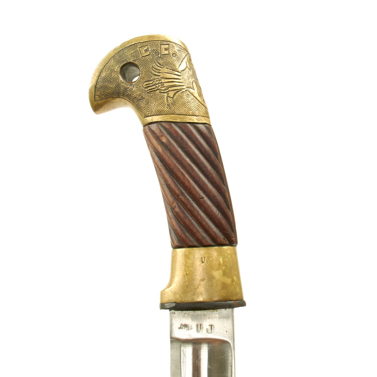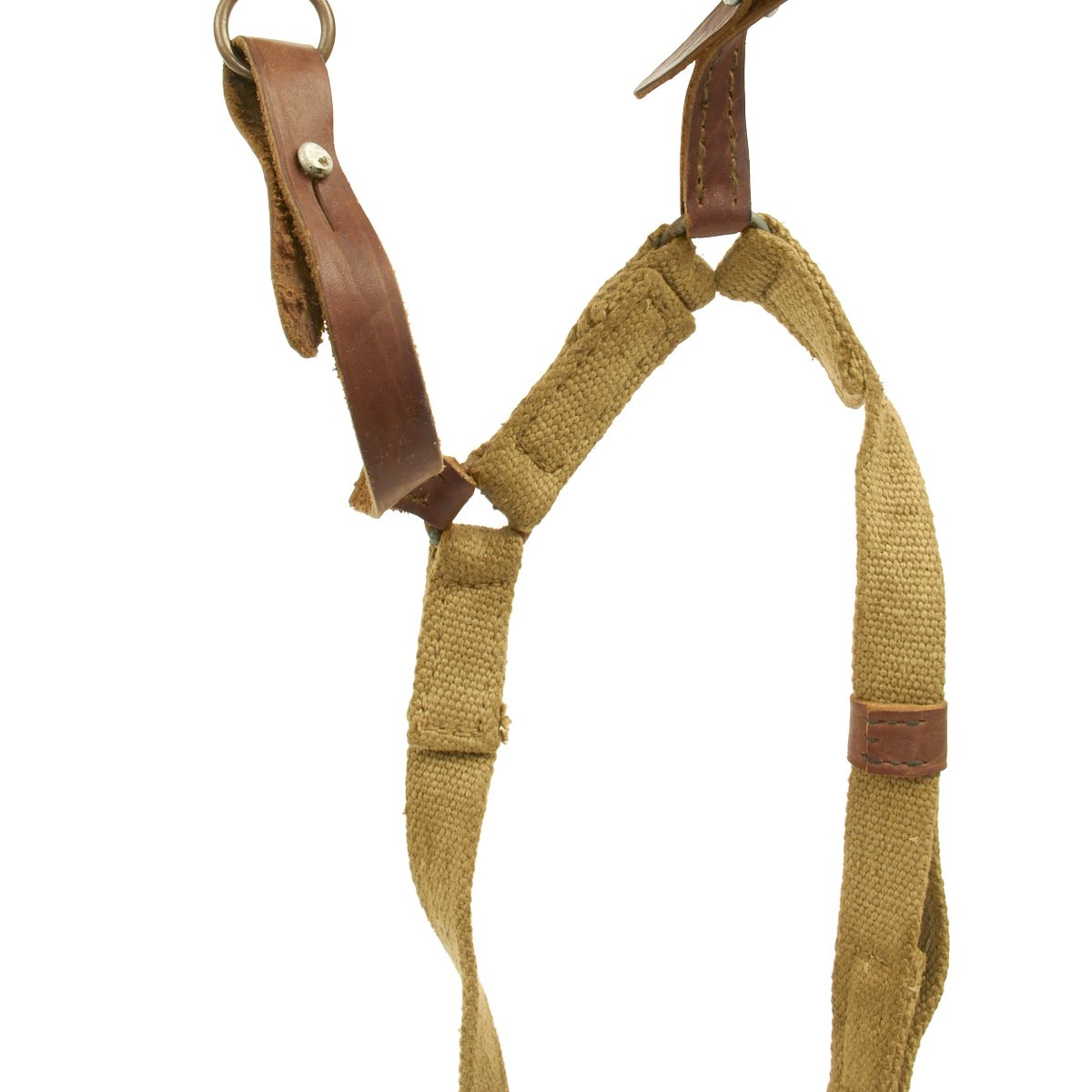 Our Cossack Shashqua is a Soviet issued weapon bearing "C.C.C.P." cast into the brass pommel around a Hammer and Sickle. The blade which is still highly polished has Soviet armorer markings and is dated 1939. The traditional Shashqua scabbard is constructed of a canvas covered wood body which is coated in a hard black wax like material supported by brass mounts. The scabbard also bears brass mounts to accommodate the M-1891 of M-1891/30 Mosin-Nagant Rifle socket bayonet (Not Included). Finally and most important the scabbard bears a magnificent nickel plated spread Eagle over Swas badge denoting the weapons use by the Don Cossacks. Additionally the Saber comes with its original webbing and leather over the shoulder body sling/harness allowing the saber to be correctly worn in an upside down position on the left side.