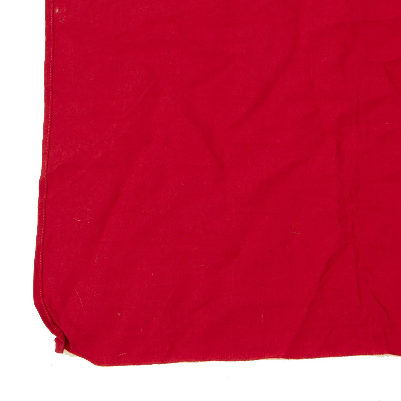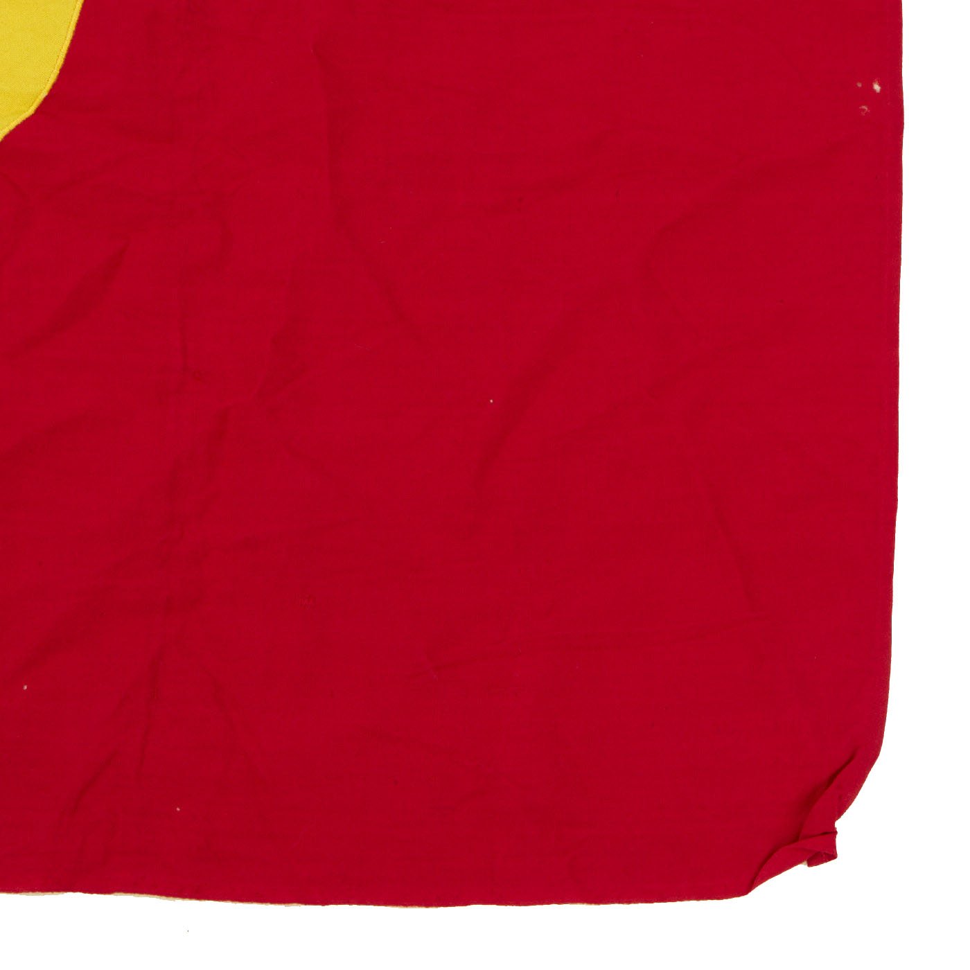This nice example measures 24"H x 36"W, the perfect size for a wall display. It looks to be made of light canvas, and is of multi-piece construction, made of a single large piece of red fabric wit yellow emblems sewn into the flag. The small size of this flag is typical for what would be used at a Soviet Army camp behind the lines.