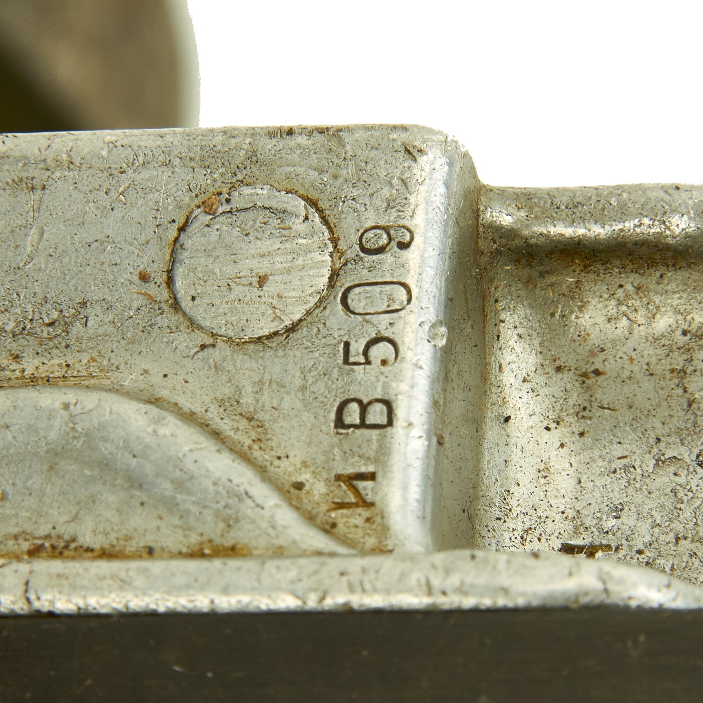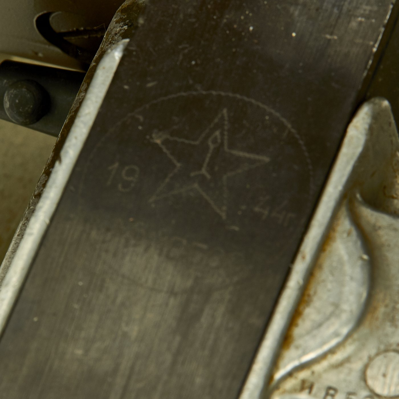 The top cover of this example is marked with a circle on the top cover, which has a Star inside with an Arrow, for the Izhevsk Mechanical Plant (Russian: Ижевский Механический Завод, Izhevsky Mekhancheskiy Zavod). This plant was founded in 1942 to manufacture small arms. Around this logo is the date 1944г (г is short for год - god, the Russian word for year), and below this is serial number ИВ509, which is also marked on the Feed Block and on other components of the top cover. The rest of the display gun is unmatching, but does have lots of markings.