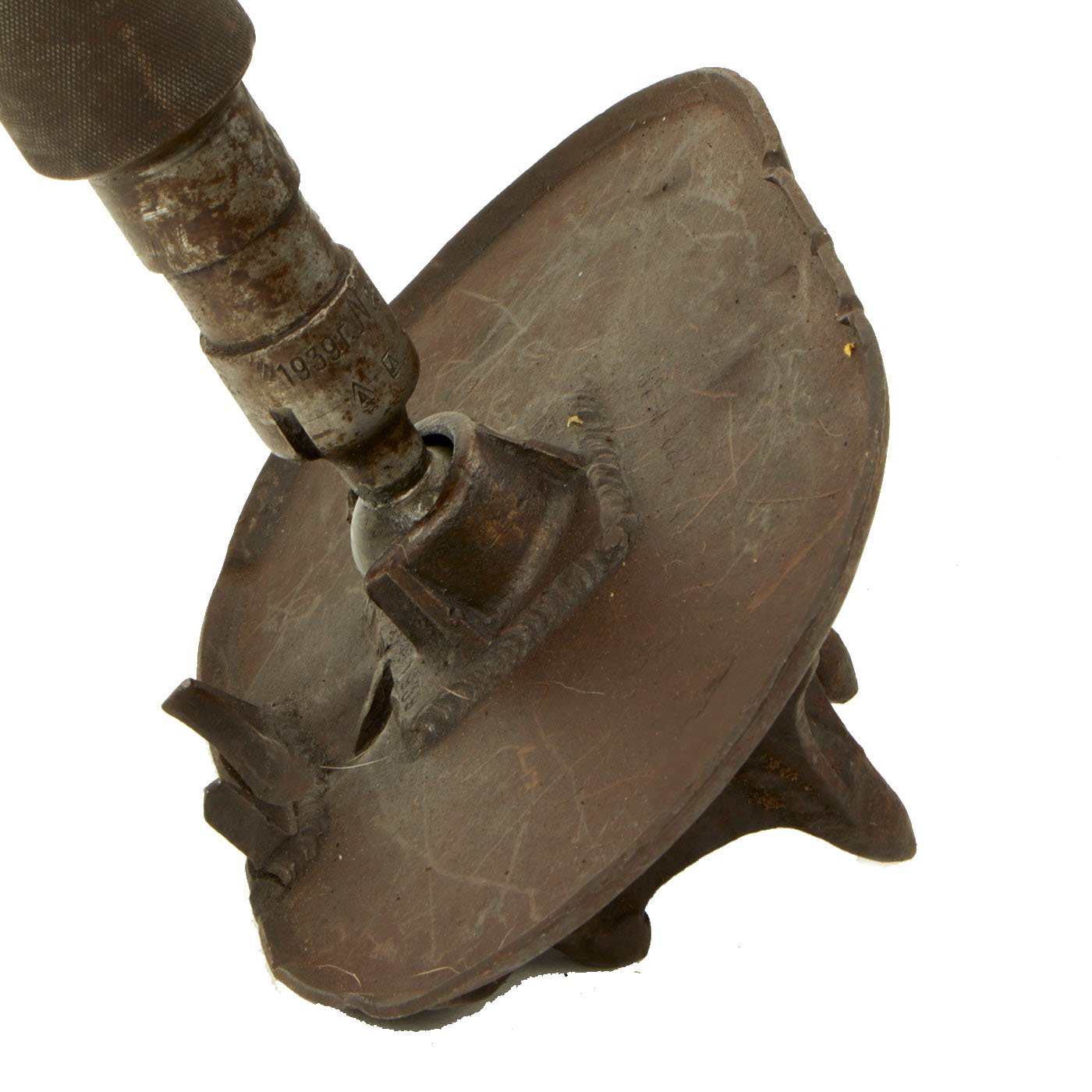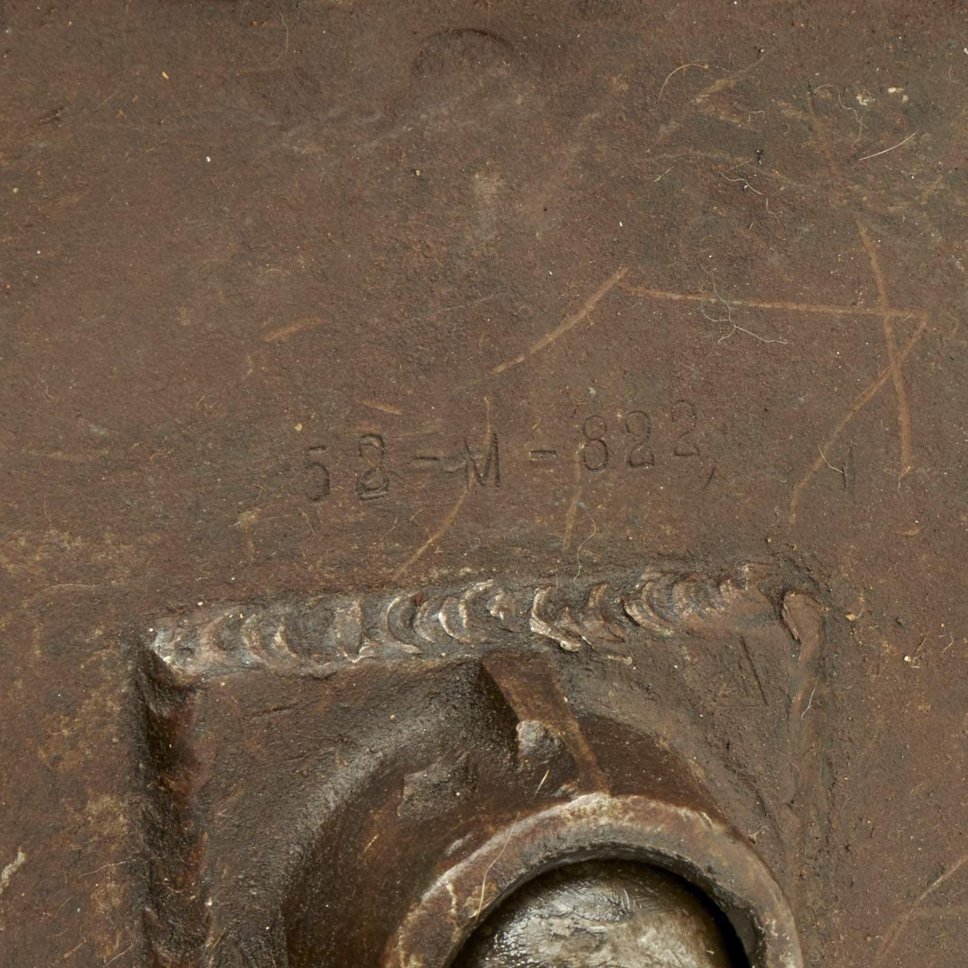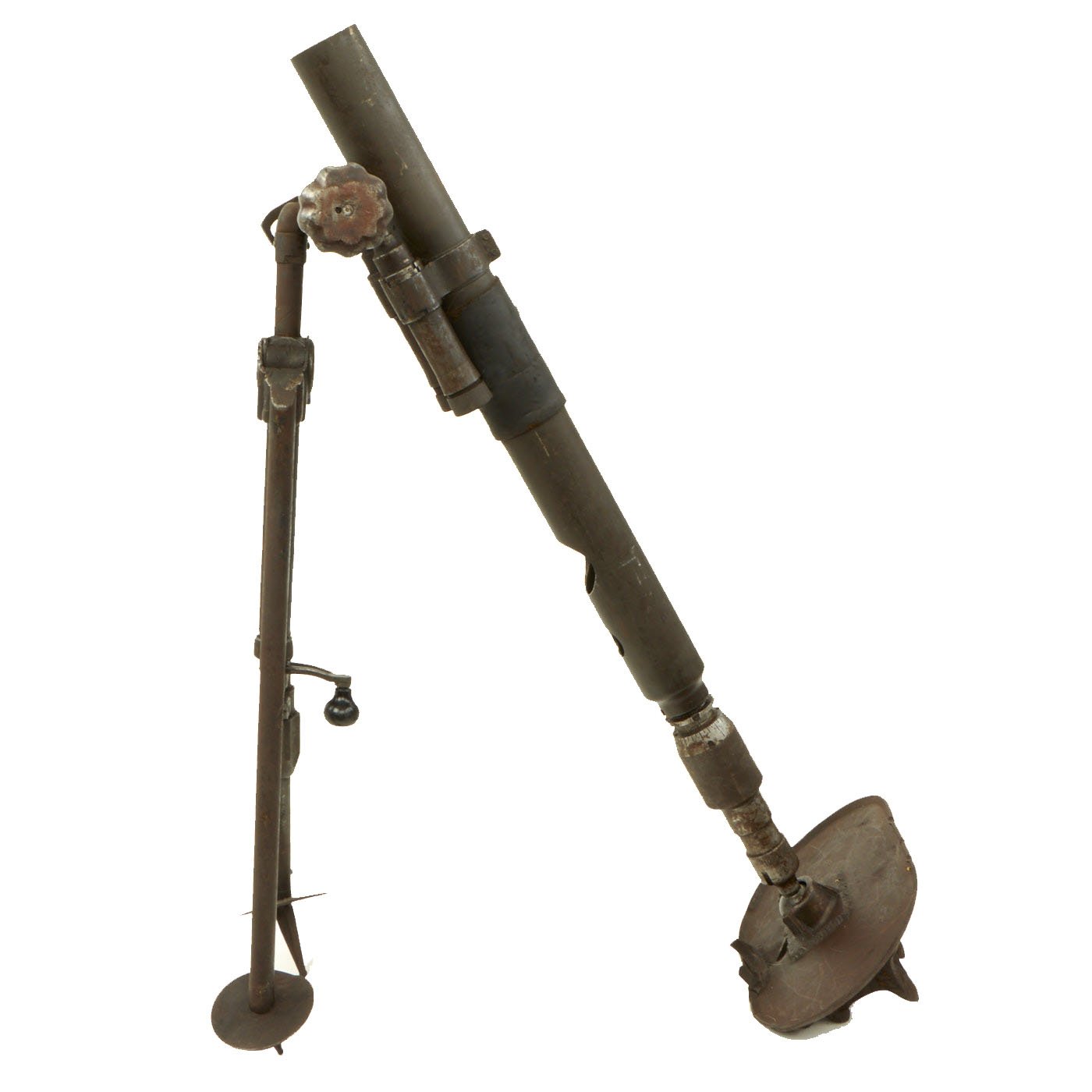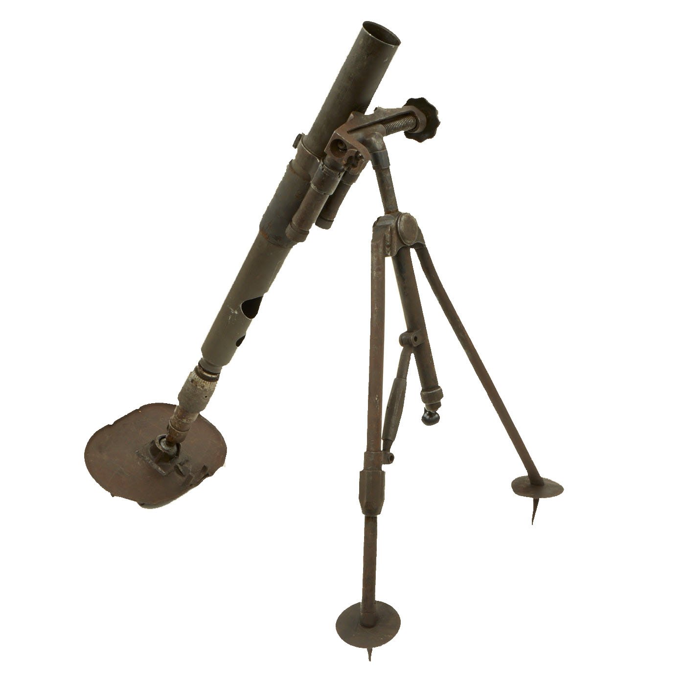 This example has serial number N26, and date 1939 on both the base plate and the deactivated base cup of the tube. The upper portion of the tube has a different serial number, and is dated 1940. The included original adjustable bipod and base plate are also both marked 52 - M - 822.