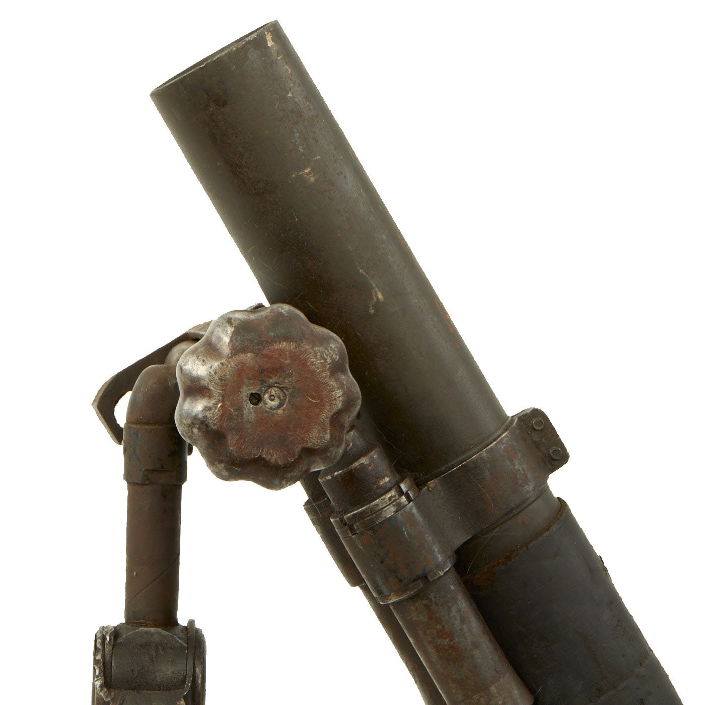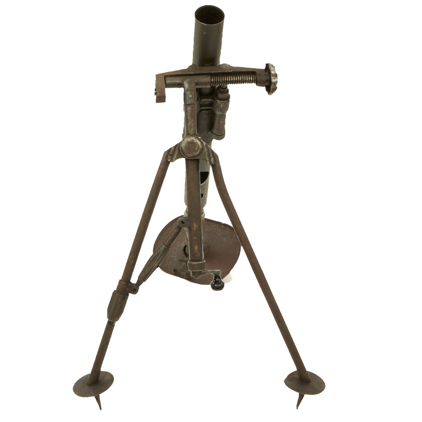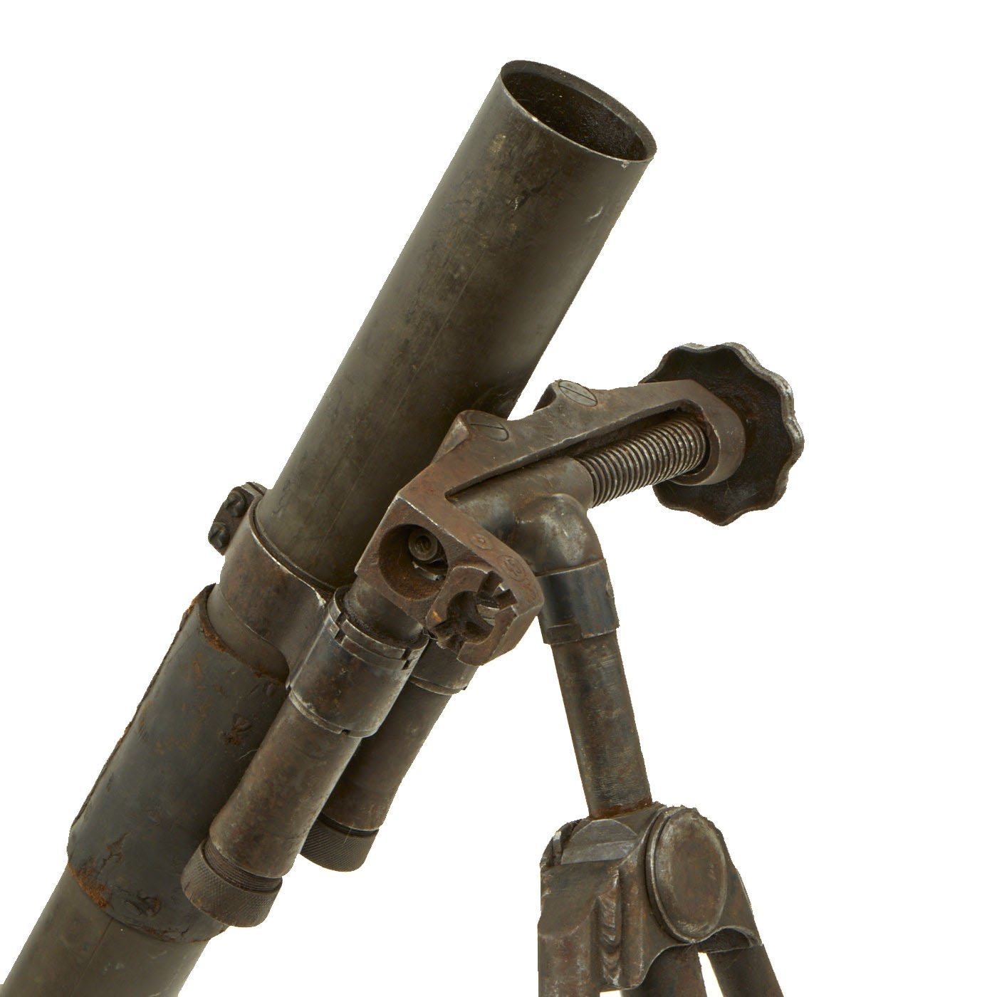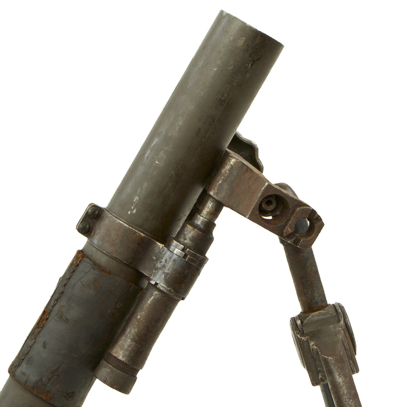 The tube and base plate are in very good condition, however the bipod is currently only able to adjust up and town. The bolt that holds the end of the traverse bar is missing, so the traverse is stuck far to one side. This could most likely be repaired, however as a display piece that isn't really necessary.