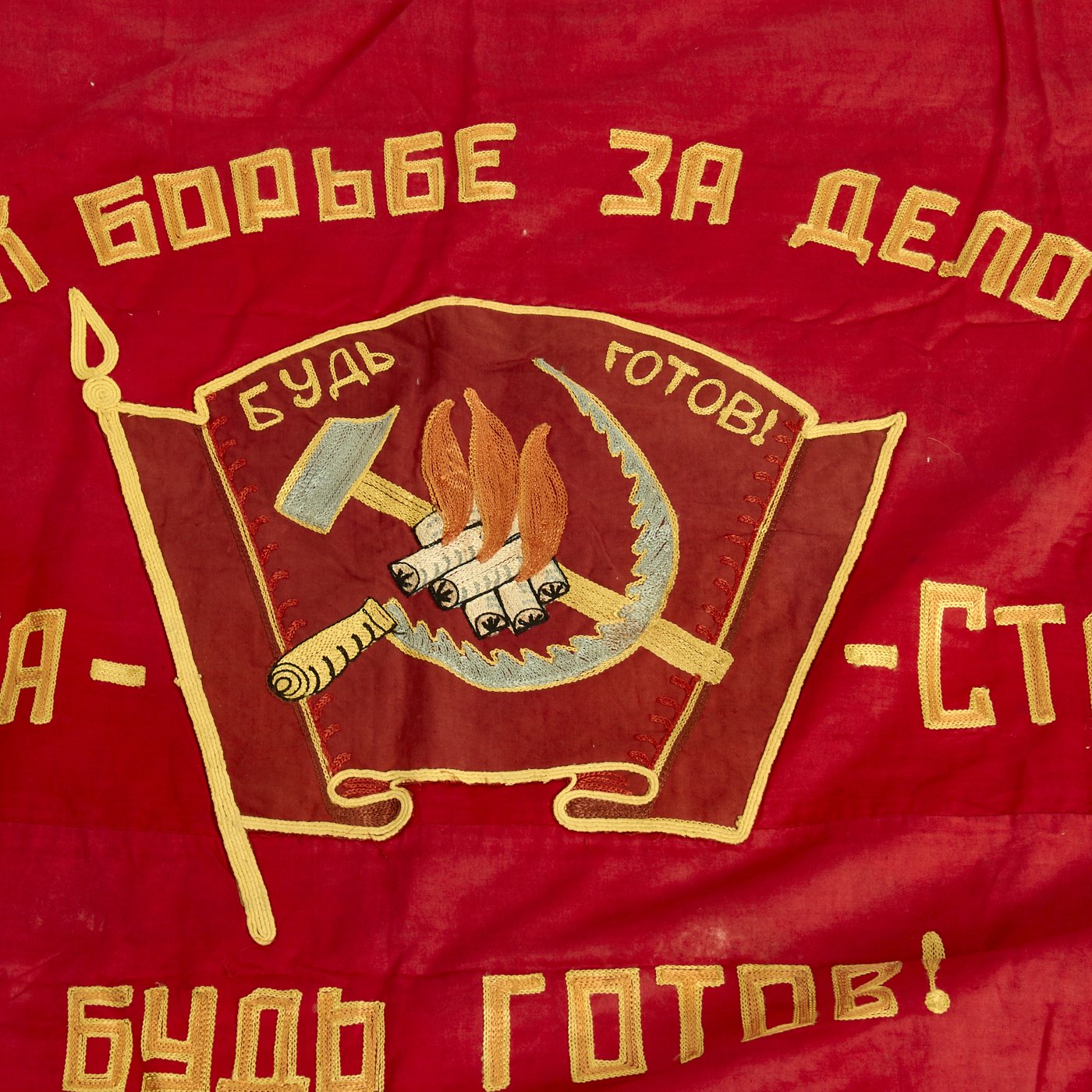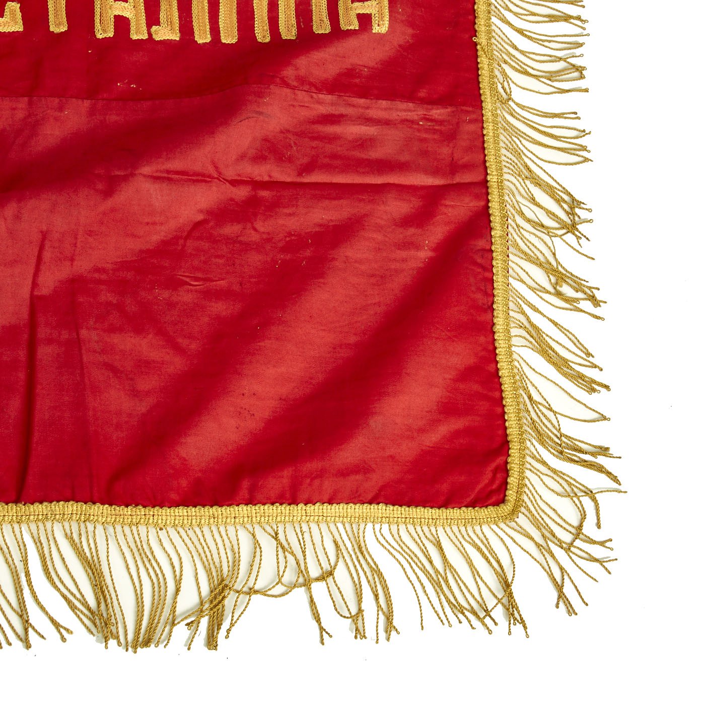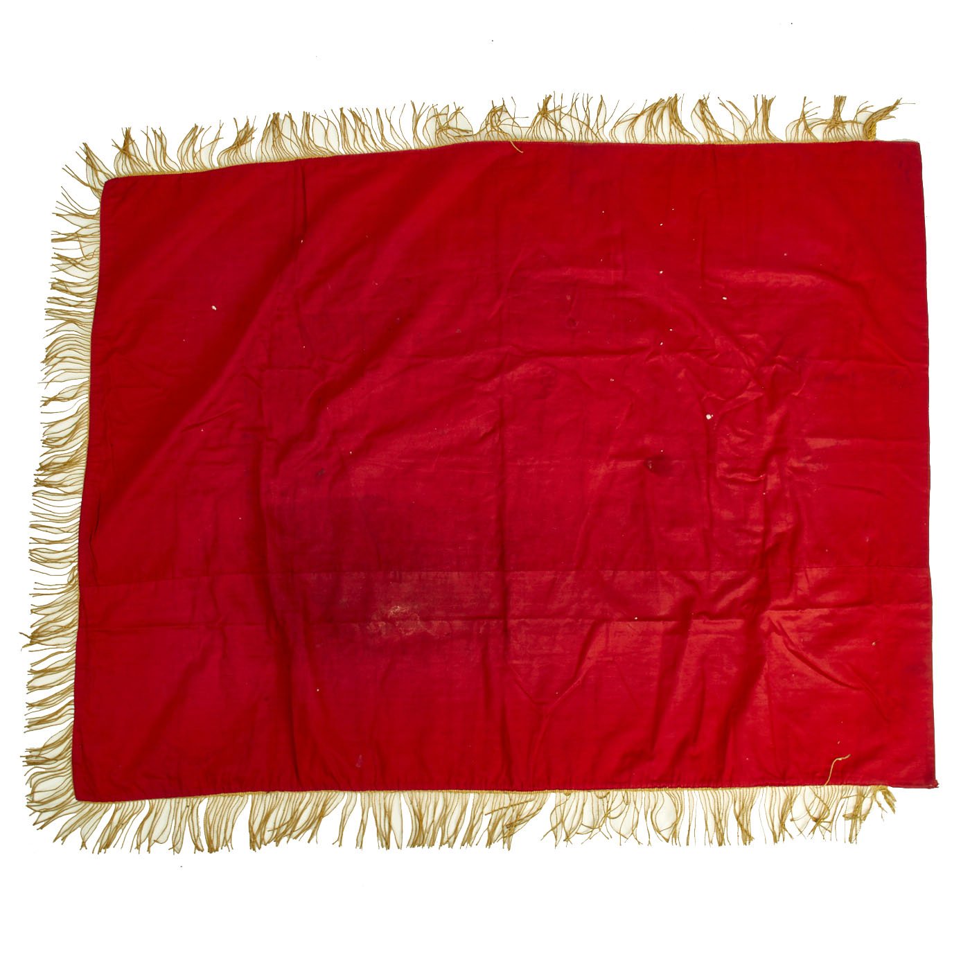 Original Item: Only One Available. We have had Flags from the Soviet Union before, but most are from the Collapse era. This however is a high quality embroidered fringed banner or flag, which is a type specifically used during the 2nd World War. Tt measures approximately 36"H x 48"W and is made of multiple pieces of cotton fabric sewn together, with lovely embroidered slogans, as well as the central "flag" insignia, which features a wood fire on top of the Soviet "Hammer & Sickle". This is a campfire, such as used by 'Pioneers', and above this is the statement БУДЬ ГОТОВ!, pronounced "BUD' GOTOV!", Russian for "Be prepared!"