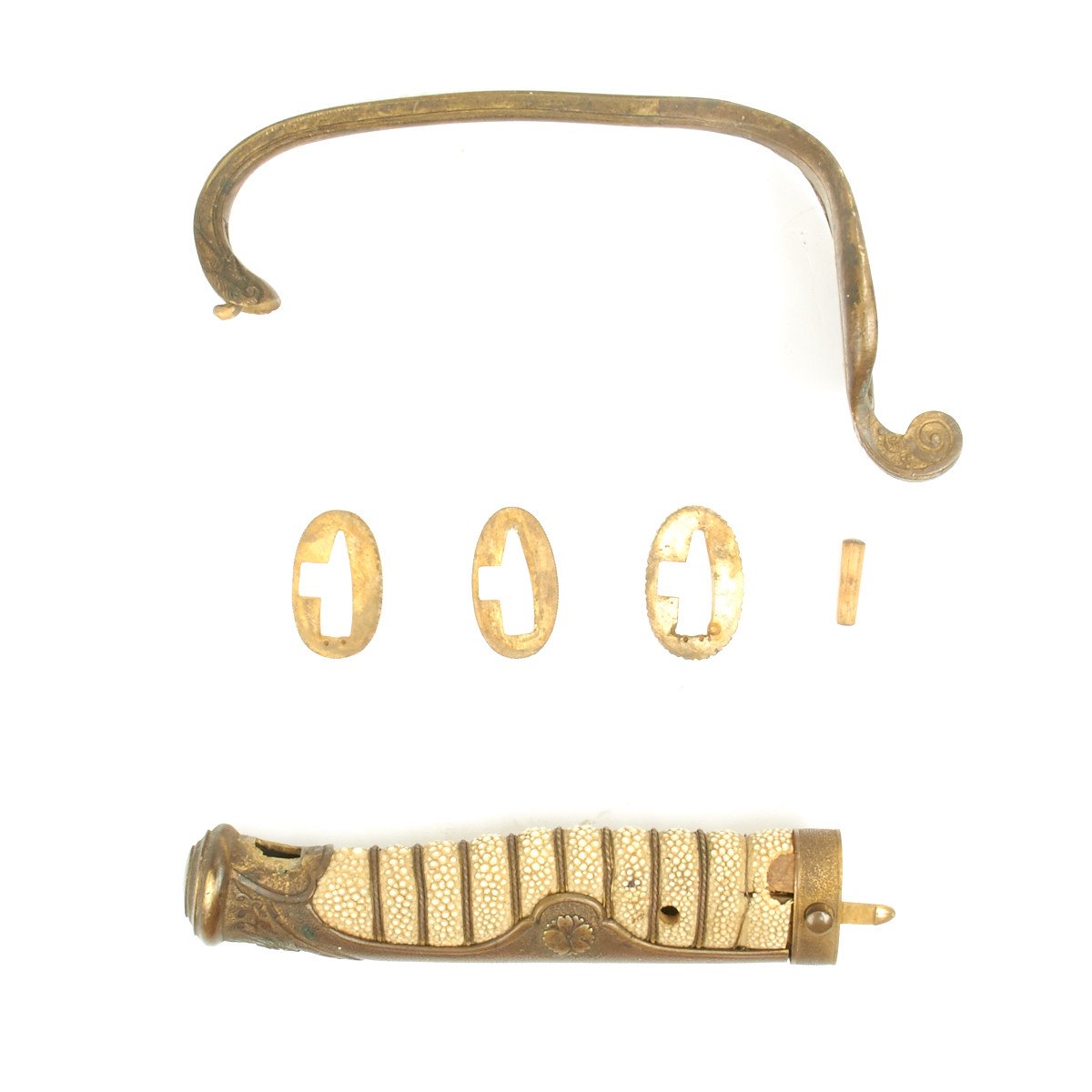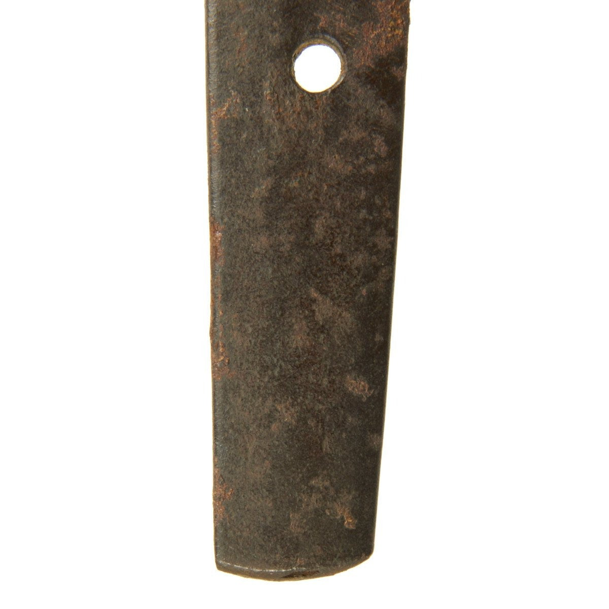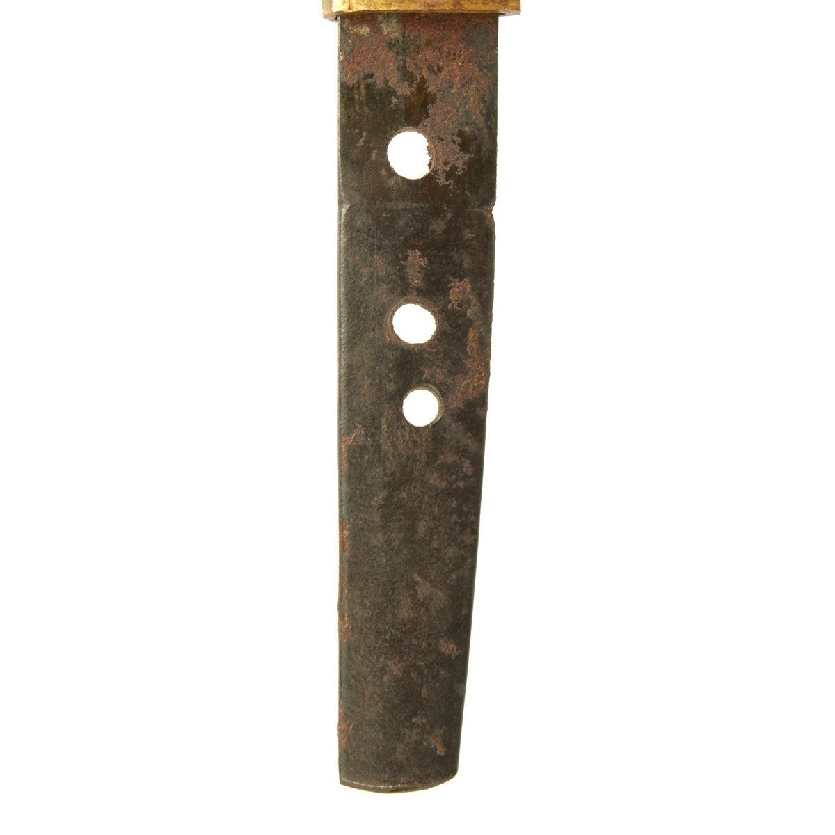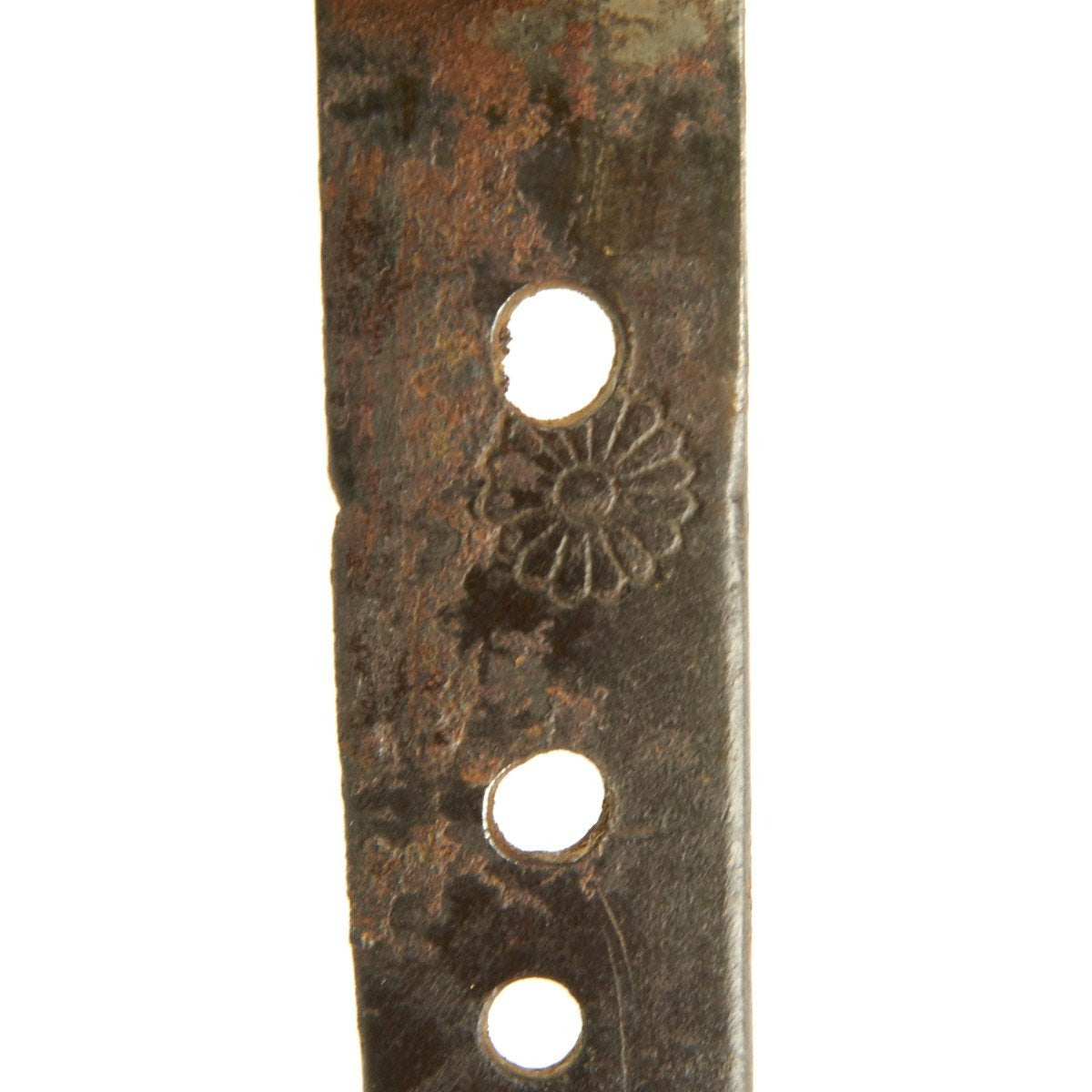 This is a very fine example with an ancient hand-forged blade with a signed tang and Chrysanthemum (added later) and mekugi (peg for holding blade into hilt). The blade length measures 21 1/4" with a width of 1". The blade is in very good condition, and is extremely old. The tang (nakago) has three holes (mekugi-ana), indicating that the blade has been fitted to a hilt setting at least three times. The tang signature (mei) on the tang is partly missing due to the tang being shorted as part of the process of suriage, or blade shortening.