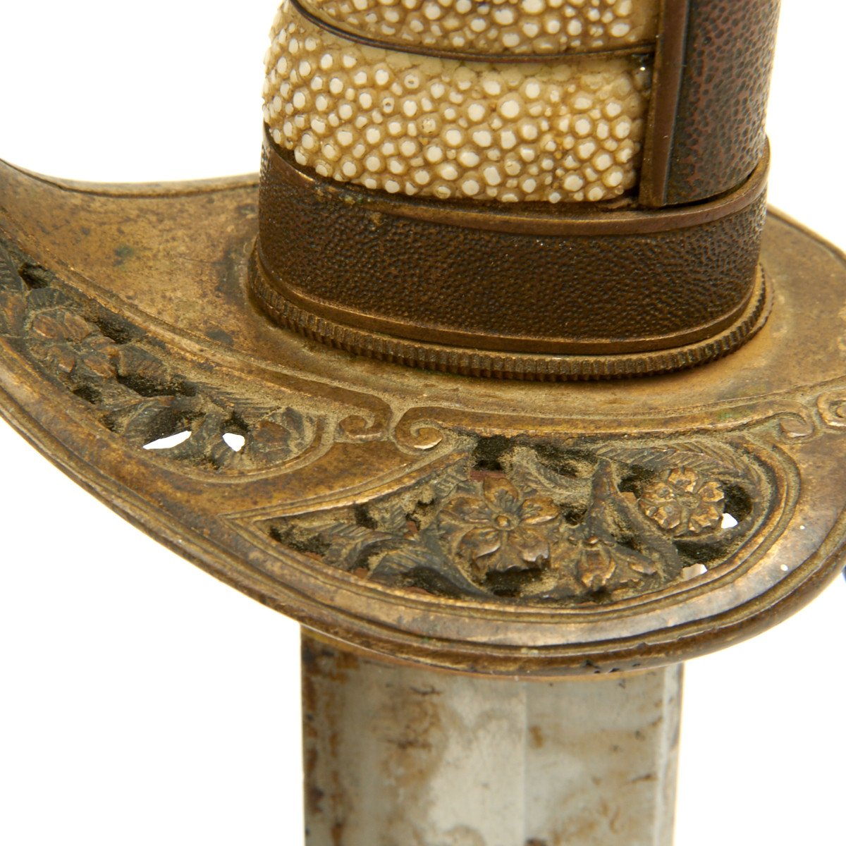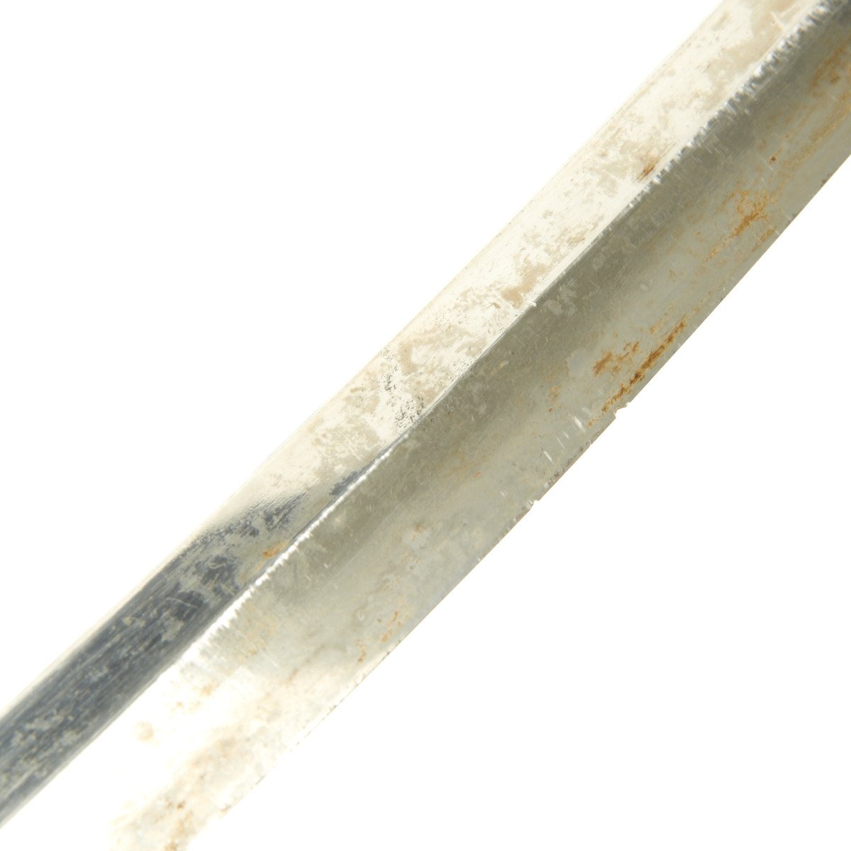 Still, clear grain is visible in the body of the blade, along with a wonderful temper line (hamon) extending the full length of the blade. The grip is excellent and while the scabbard is dent free, it has lost much of its chrome finish. A wonderful ancient blade made into an Army officer’s sword for a young soldier with his first commission.