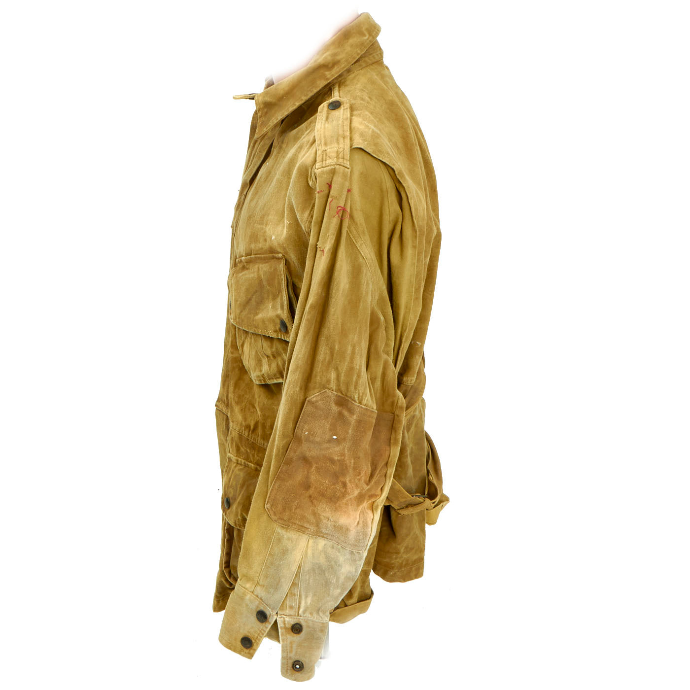 Original Item: Only One Available. This is a M42 Paratrooper Jump Jacket costume piece or prop that was used by an actor during the filming of Stephen Spielberg's epic WW2 film, Saving Private Ryan. It is in a size 42R, has red thread on the left shoulder, an indication of a possible 82nd Airborne prop and is ink stamped U.S. SPR on the interior back right.