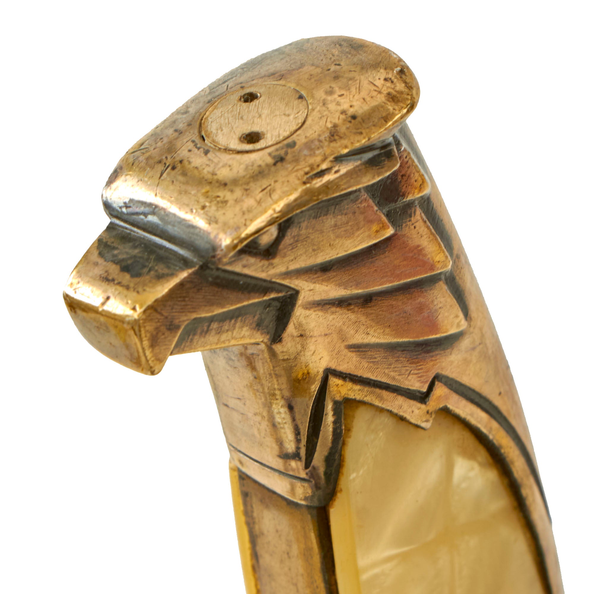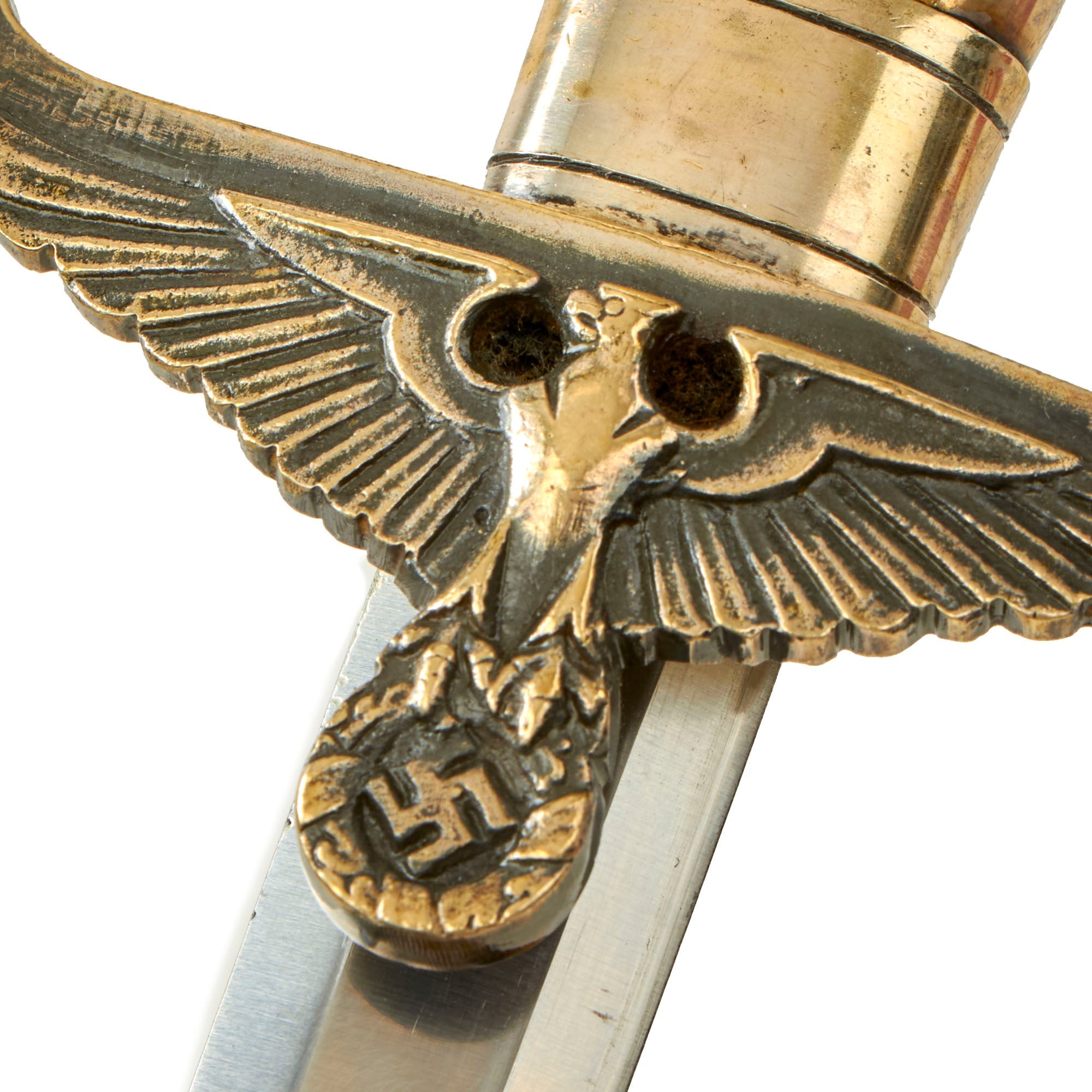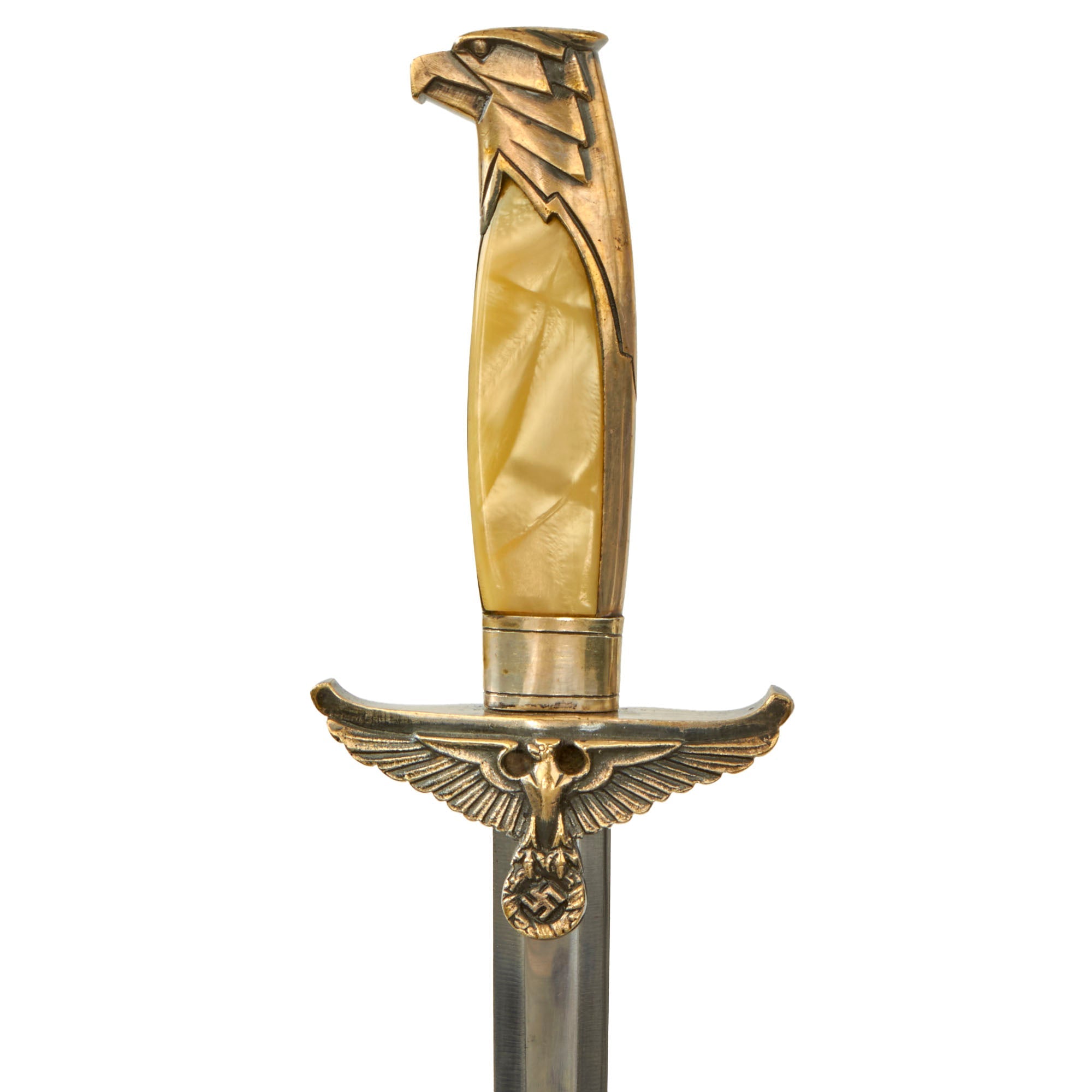 These were not produced in large numbers, with only daggers like the very similar Diplomat's dagger are harder to find. It features a hilt fit with silver plated brass or tombac alloy, which was originally antiqued to give it a great look. The pommel is a lovely Art Deco style eagles head, and the cross guard shows a Reichsadler Eagle with upturned wing ends and a head facing to the viewers LEFT. If it was facing right, it would be a diplomat's dagger, which is the only difference between the two. The grip scales look to be acrylic or celluloid pearloid material, and are in fantastic condition, The hilt as a whole has much of the silver plating retained, with some wear through to the base material, and is just a bit loose on the tang.