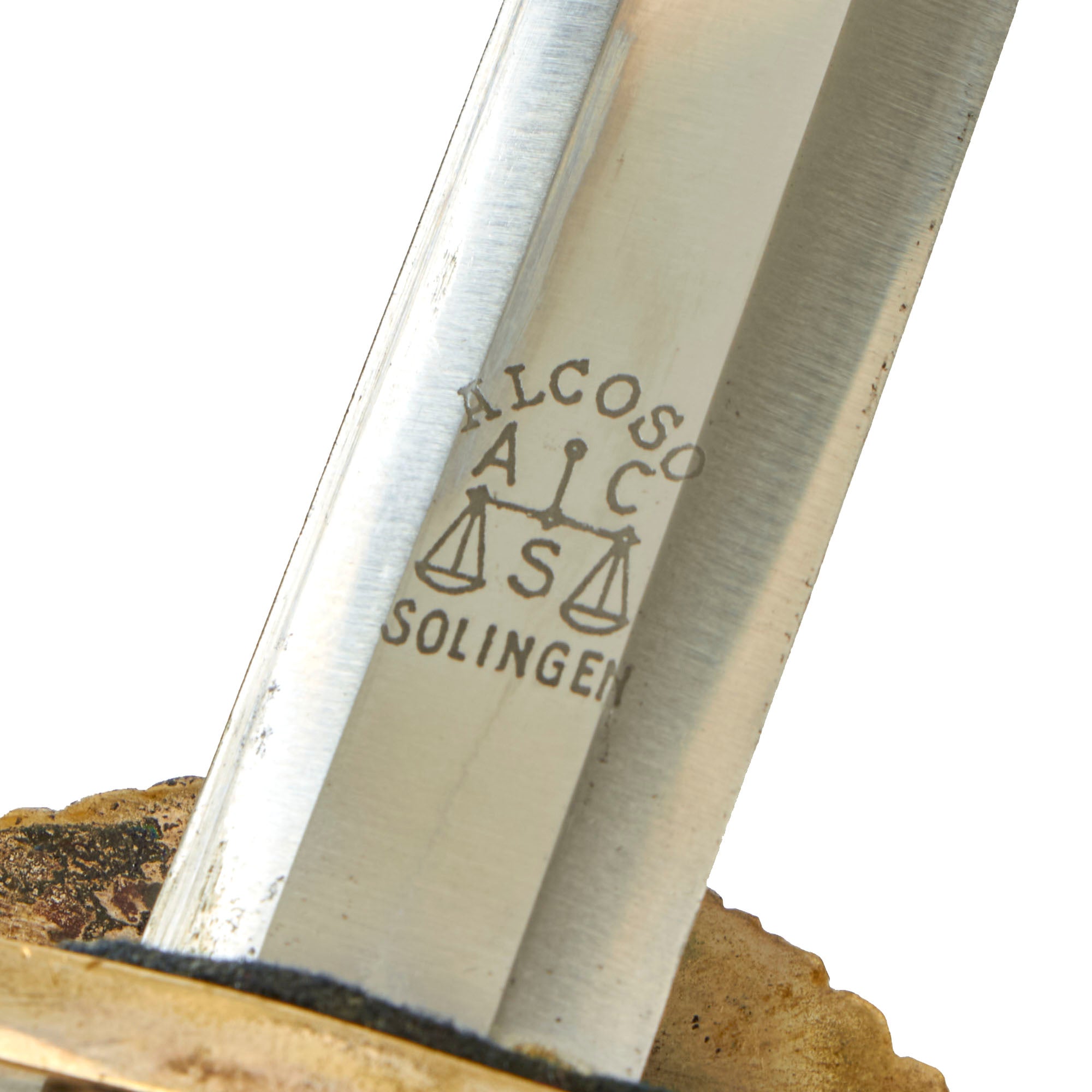 The reverse ricasso is etched with the trademark Alcoso used in 1939-1940. It depicts the scales with the firm's initials, ACS interspersed. Above is the firm's name, ALCOSO, and below the town of business, SOLINGEN, the legendary "City of Blades" in Western Germany.