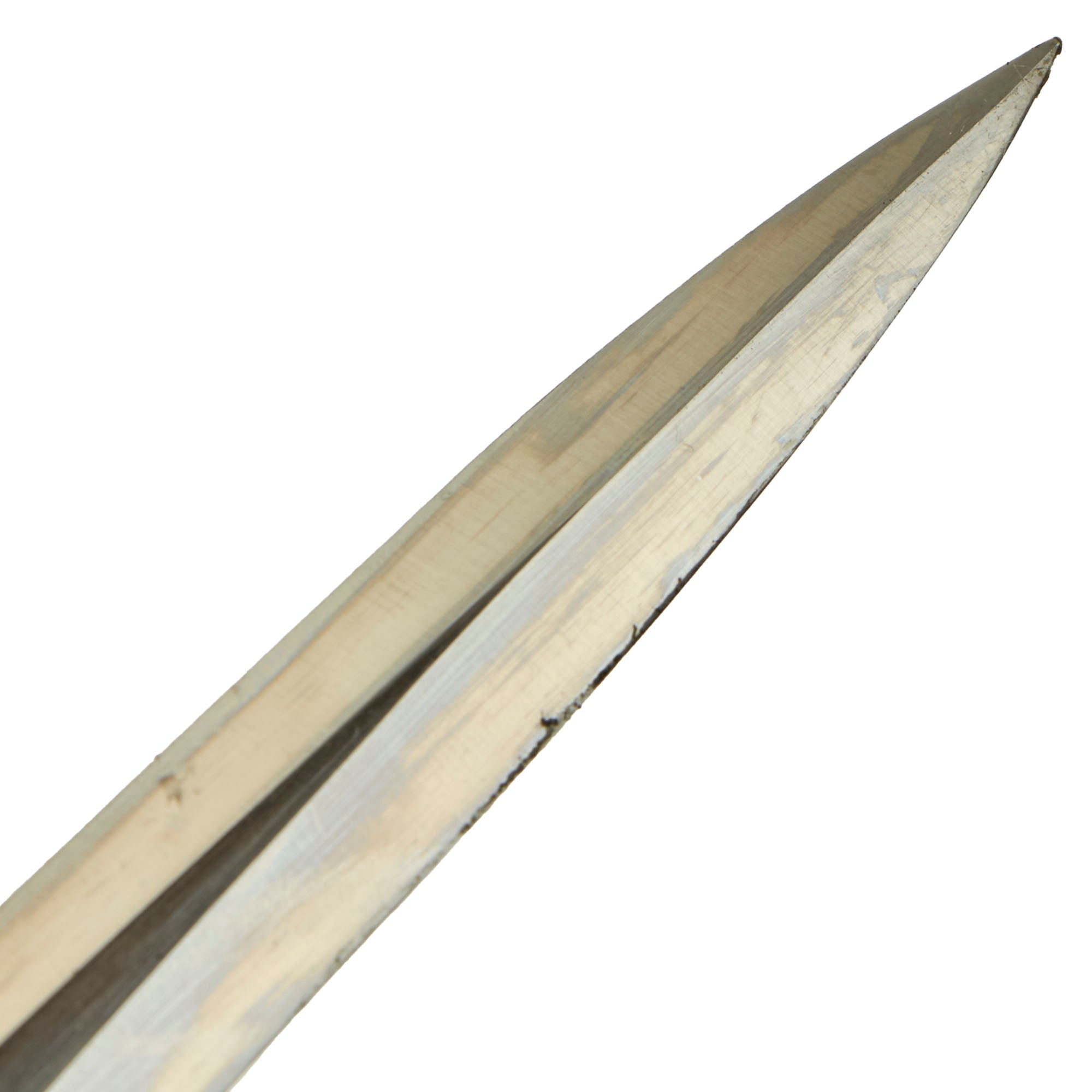 The excellent condition blade is bright throughout, showing the original cross grain throughout the blade surface. This texture is iconic, and is the definitive identifying characteristic for a real WWII German Blade. The needle-like tip is intact and unbent, and the edges have correctly not been sharpened. There is the usual runner wear on the blade surface, however this is present on just about every dagger out there, and this is all that keeps it from being truly MINT! This is really a great blade! The felt blade washer is still intact and in place inside the cross guard.