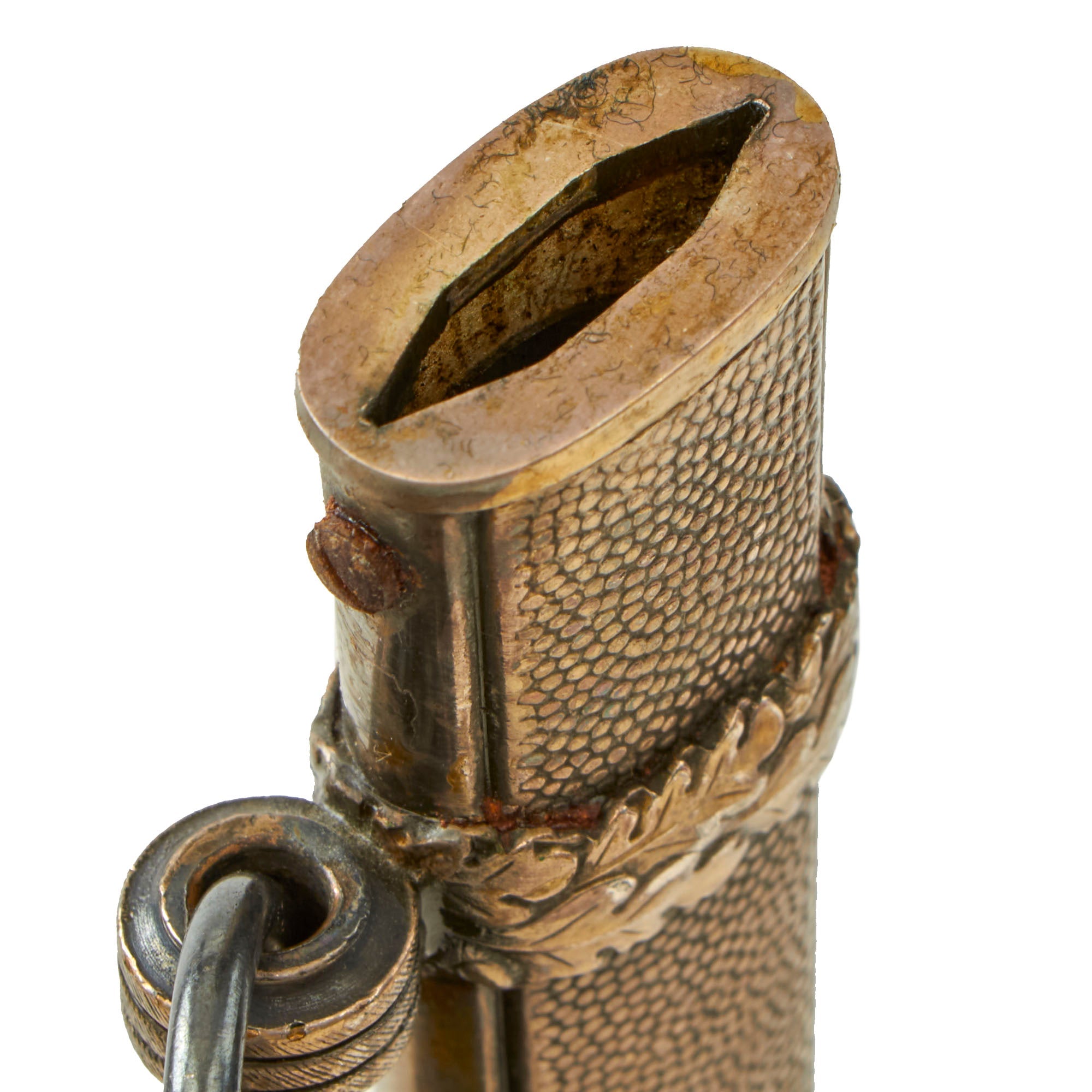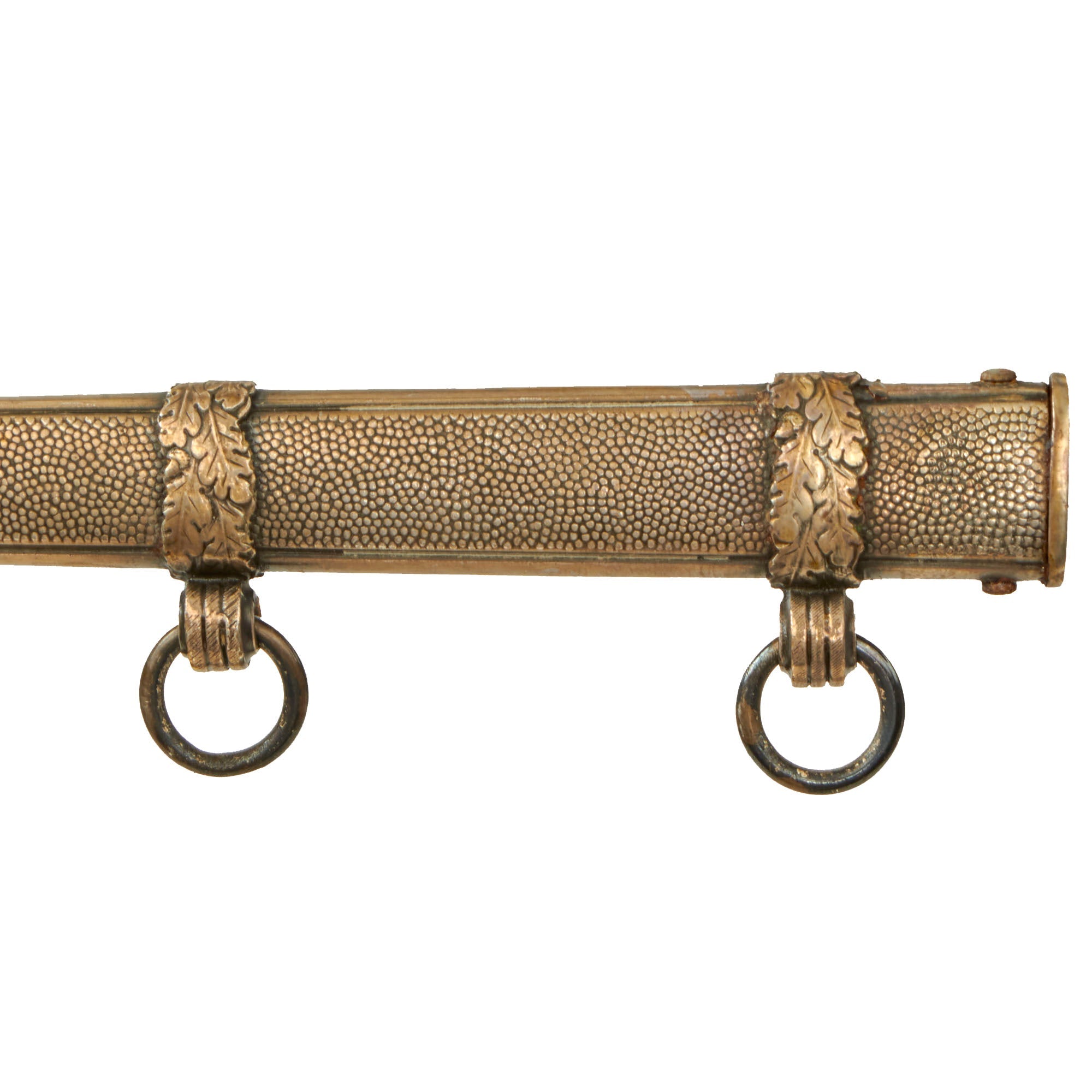 The scabbard is a fine dent-free plated steel example, and still retains almost all of the plating, and even some of the original antiquing. The sides have very crisp, finely pebble-grained panels. The alloy carrying bands have an excellent pattern of overlapping oak leaves and acorns, with hand enhancing evident on each of the leaves. The ring ferrules are the triple serrated type, and the rings are still present. The throat is the narrow style, retained by "cheese head" screws on the narrow sides of the scabbard.