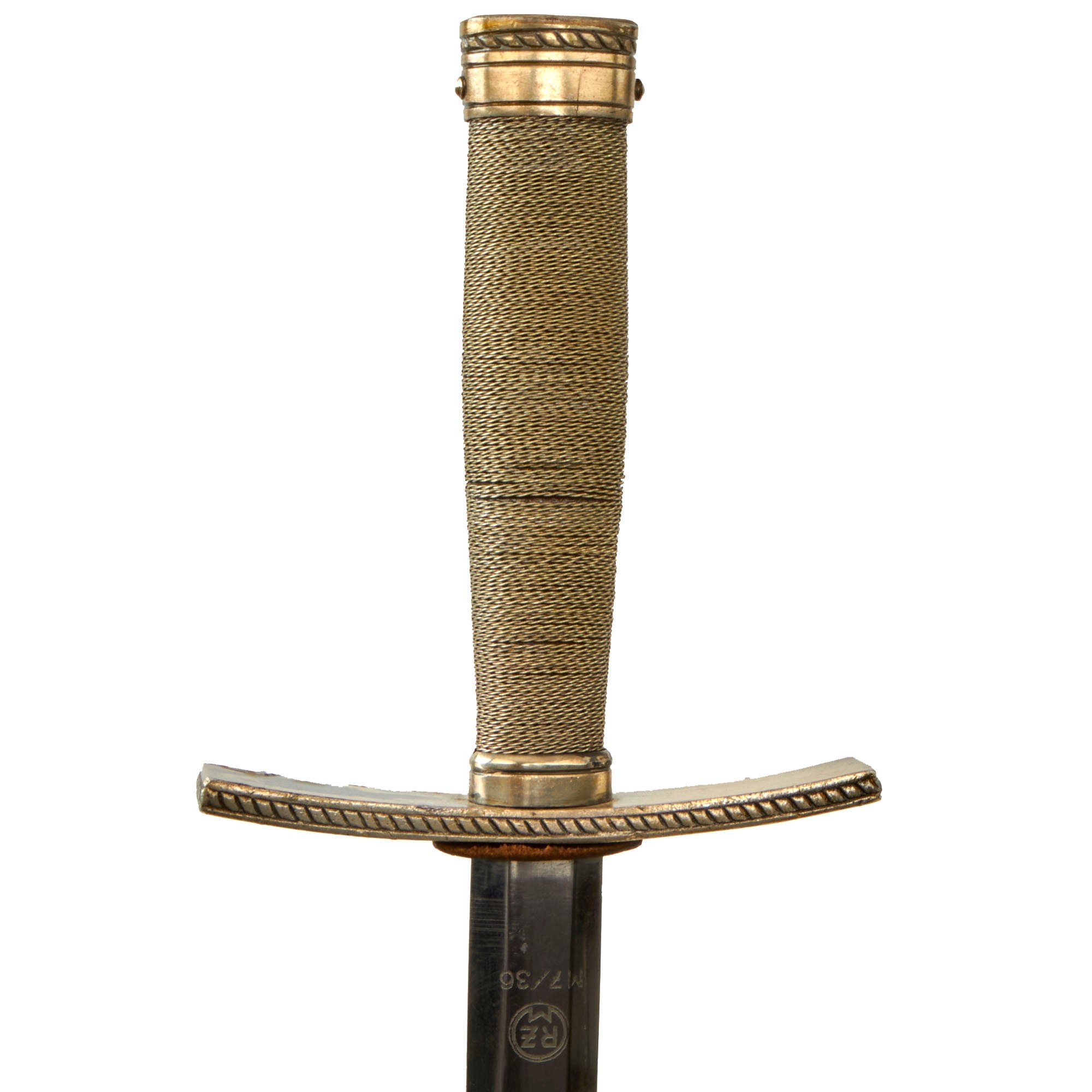 The Reichszeugmeisterei, or RZM, was based at the Brown house in Munich and NSDAP party headquarters in Berlin. The RZM ensured that the manufacturers of military items were consistent in design, quality of materials and other characteristics of the items. It also defined standards of design, manufacturing and quality and published an authoritative color chart for textiles. The M7 in the code stands for knives/daggers, with E. & F. Hörster of Solingen of Solingen being contractor number 36.