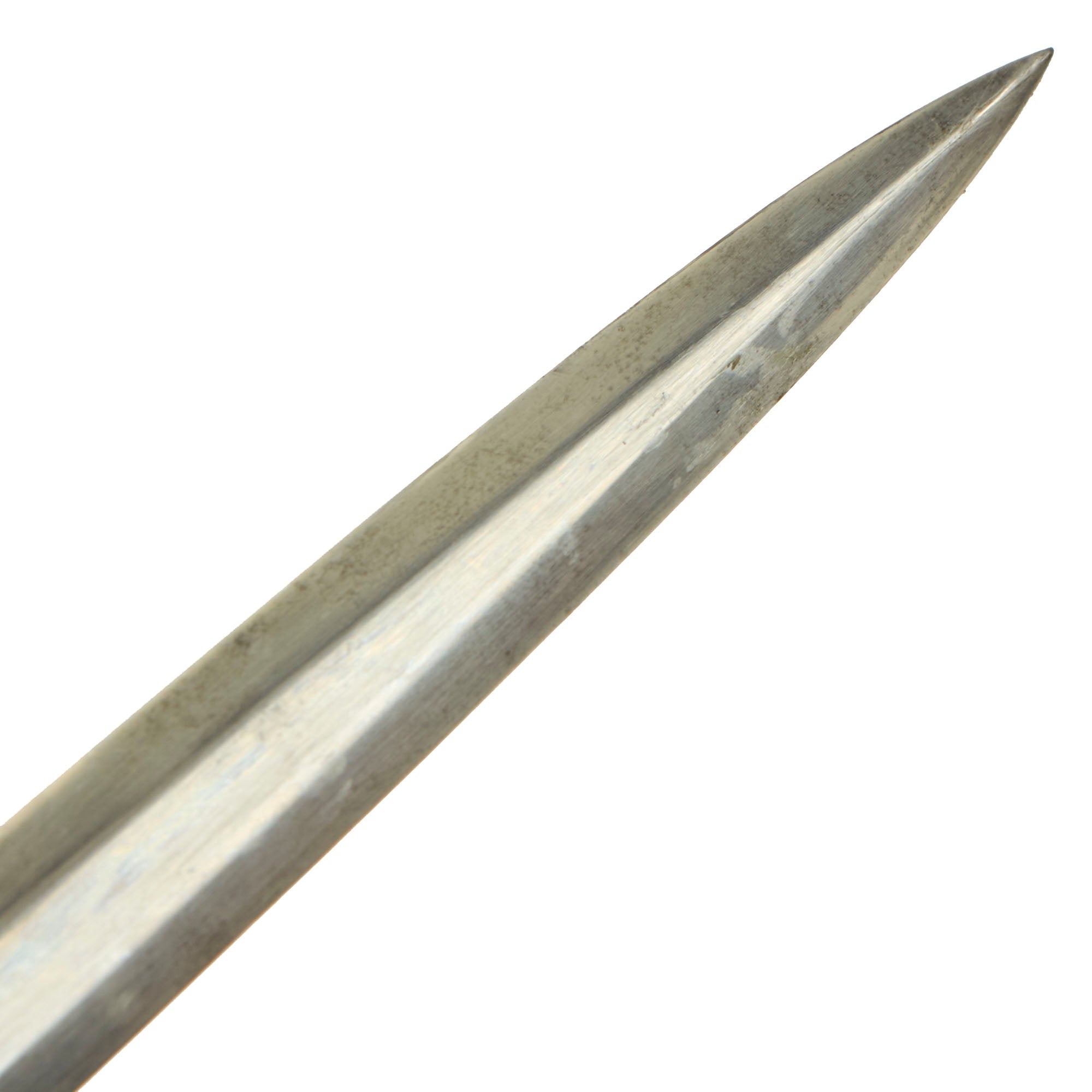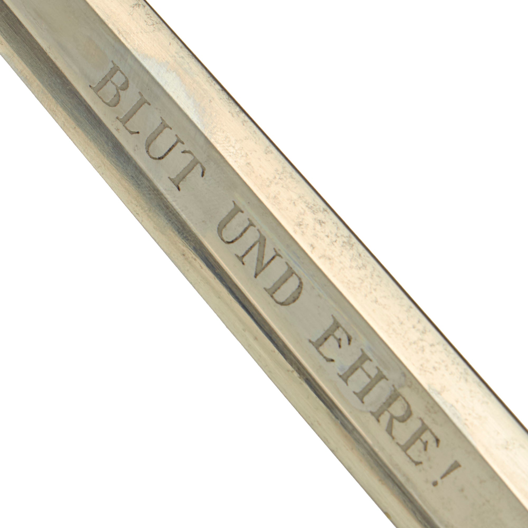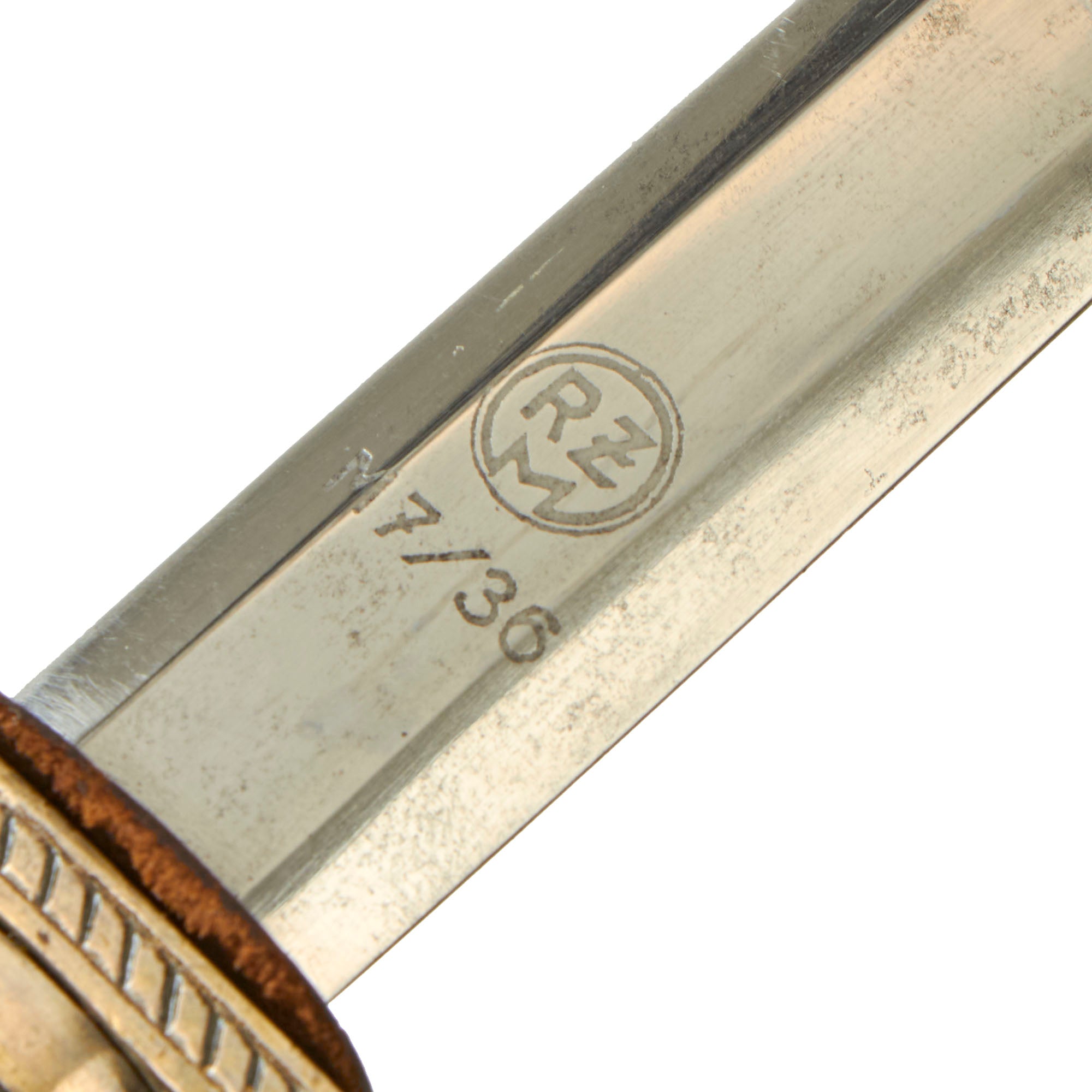 The plated blade of this example is in very good condition, showing light runner marks and some oxidation speckling, but no pitting or nicks to cutting edge. There is no damage or bending to the edge or tip, and the original leather blade buffer is still in place against the cross guard. The acid-etched motto BLUT UND EHRE! (Blood and Honor!) is present and retains most of the factory gray finish. The reverse of the blade is clearly etched with an ((RZM)) circle next to code M7 / 36.