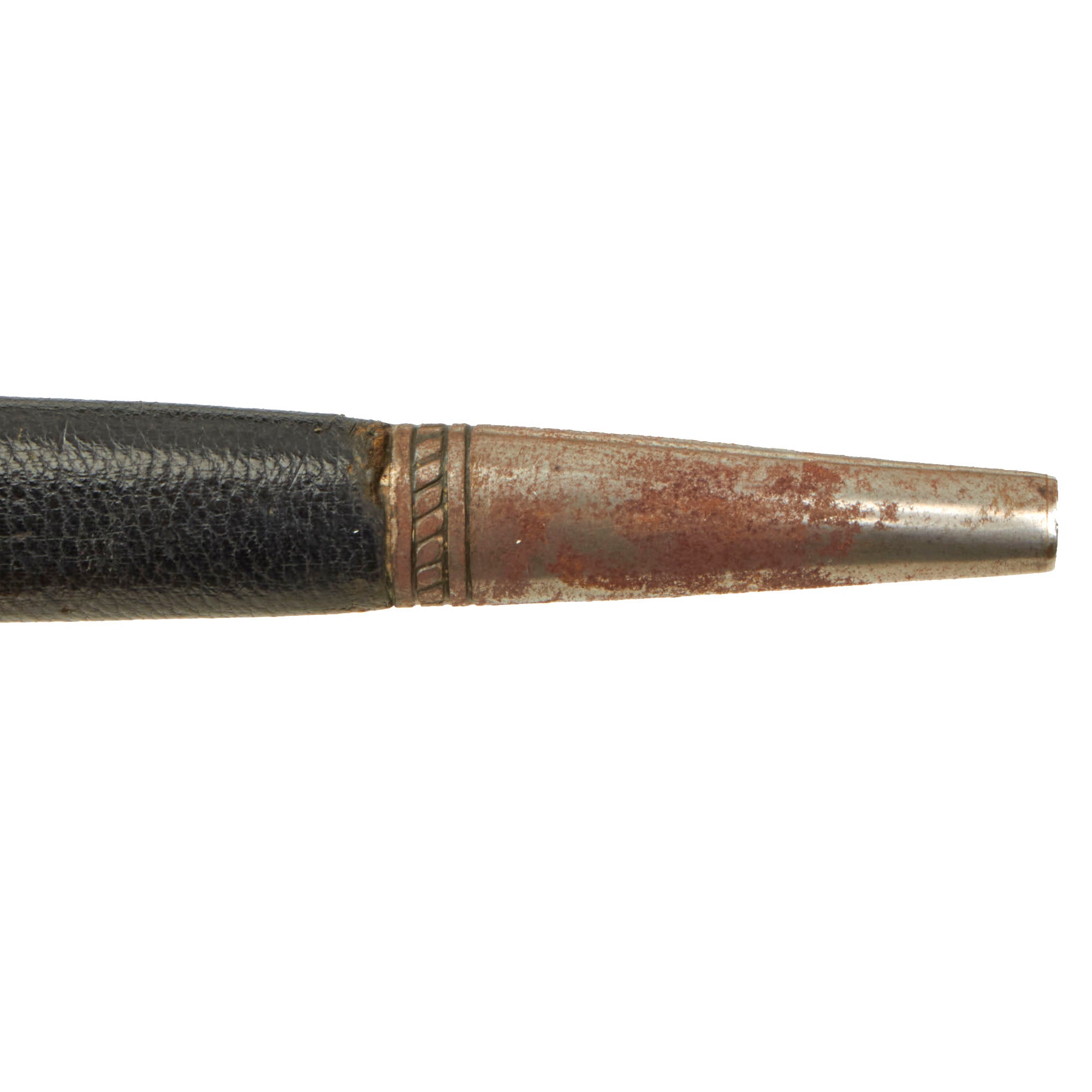 The scabbard for this dagger is in very good condition, with the sheet steel body free of bends or dents. It is fit with steel mountings, which were originally plated, and much of the body is covered with black "Moroccan" grained leather. The throat fitting at the top front features the HJ Eagle insignia, holding a sword and hammer, with a rope border underneath. The middle band and drag have the same rope border, and both carrying bands are present. The fittings have however lost most of their plating, now displaying a lightly oxidized steel patina.