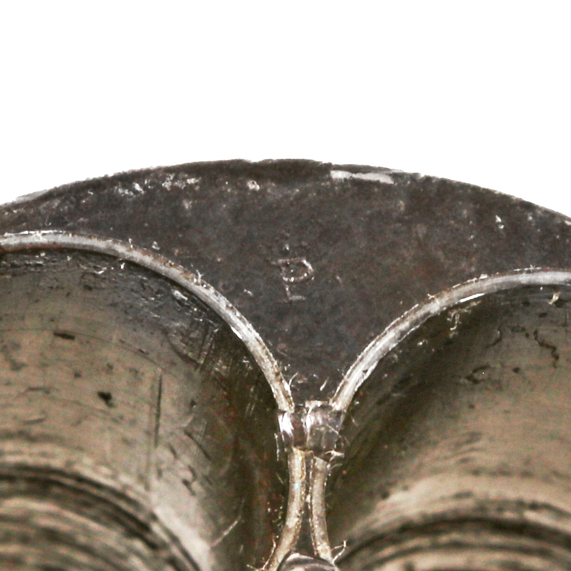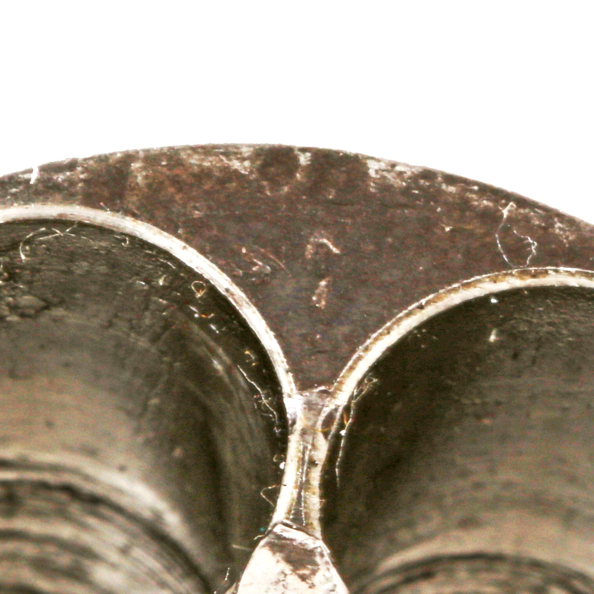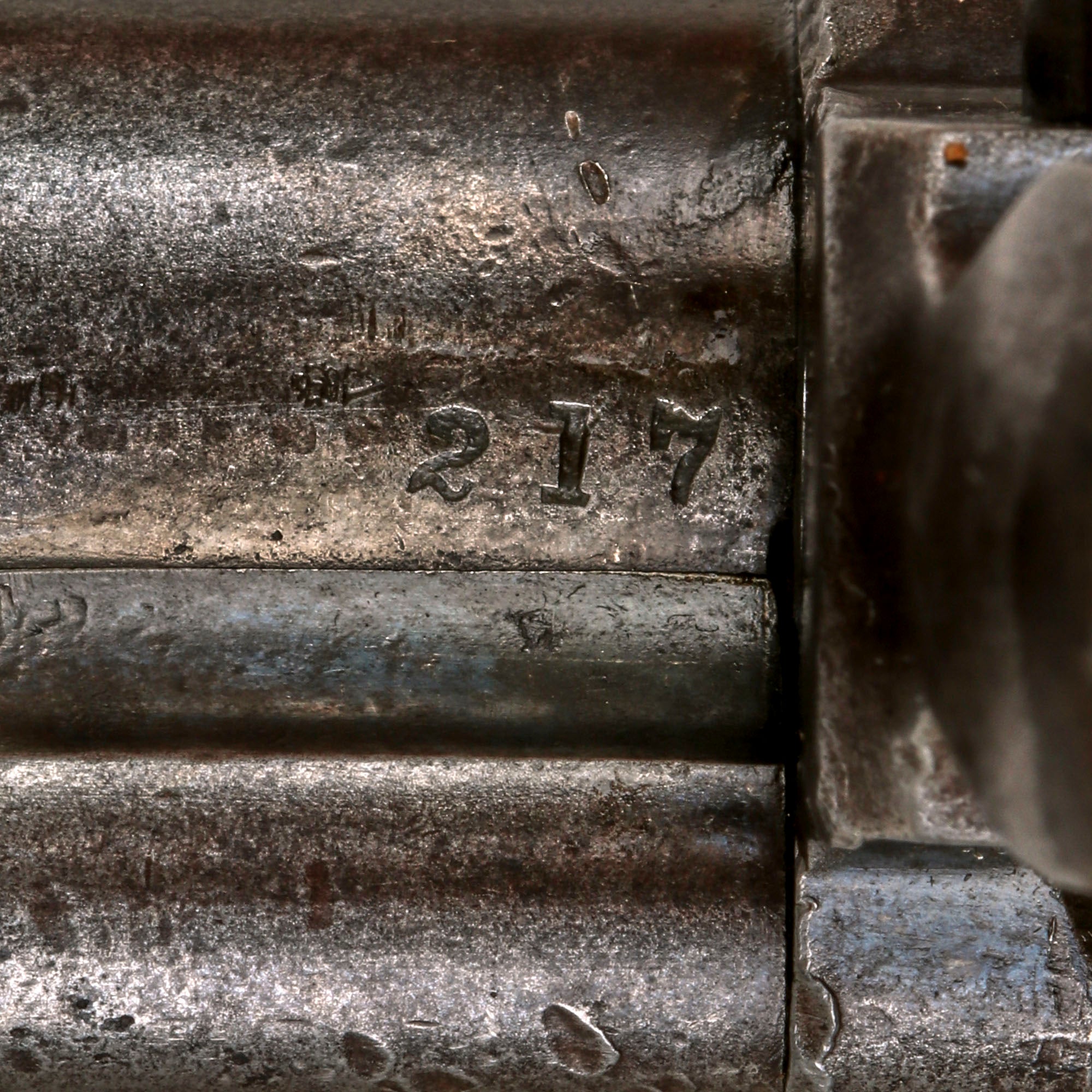 There is no Colt "Prancing Pony" logo stamped into the frame, as this revolver was made before they started using that marking in 1891, and there is also no caliber marking stamped onto the barrel. The trigger guard is marked on the left side with a small 45 CAL / B, indicating that it was made for the early .45 "Boxer cartridge, also known as .450 Adams. We can however see that the cylinder chambers may have been lengthened and/or sleeved, possibly to take some other British cartridge like .455 Webley / Eley. Unfortunately we were not able to determine the exact changes made to the cylinder.