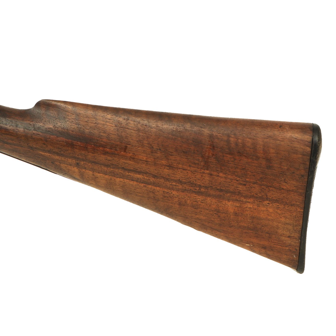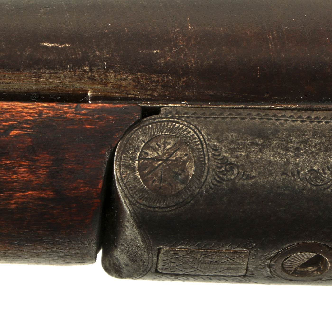 This example has definitely seen long use, and overall the metalwork is quite worn. There is a inset steel repair on the wrist, and the forestock has been completely replaced. It is unfortunately now glued in place, so the barrel cannot be removed, however we can see British Birmingham proofs on both sides the barrel joint when it is open.