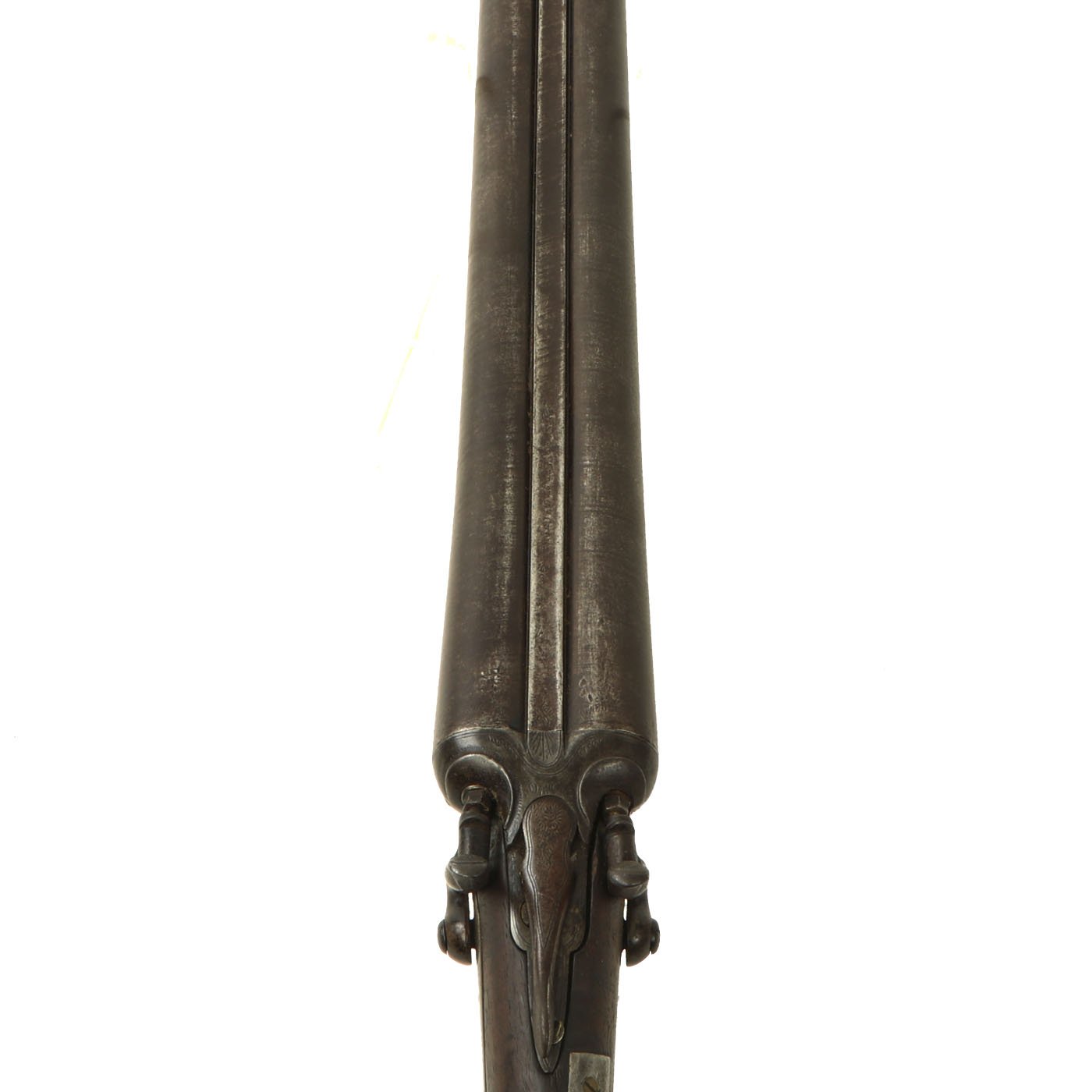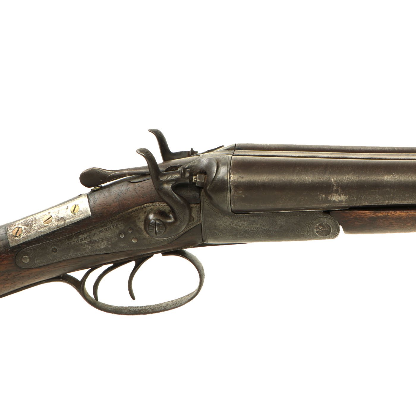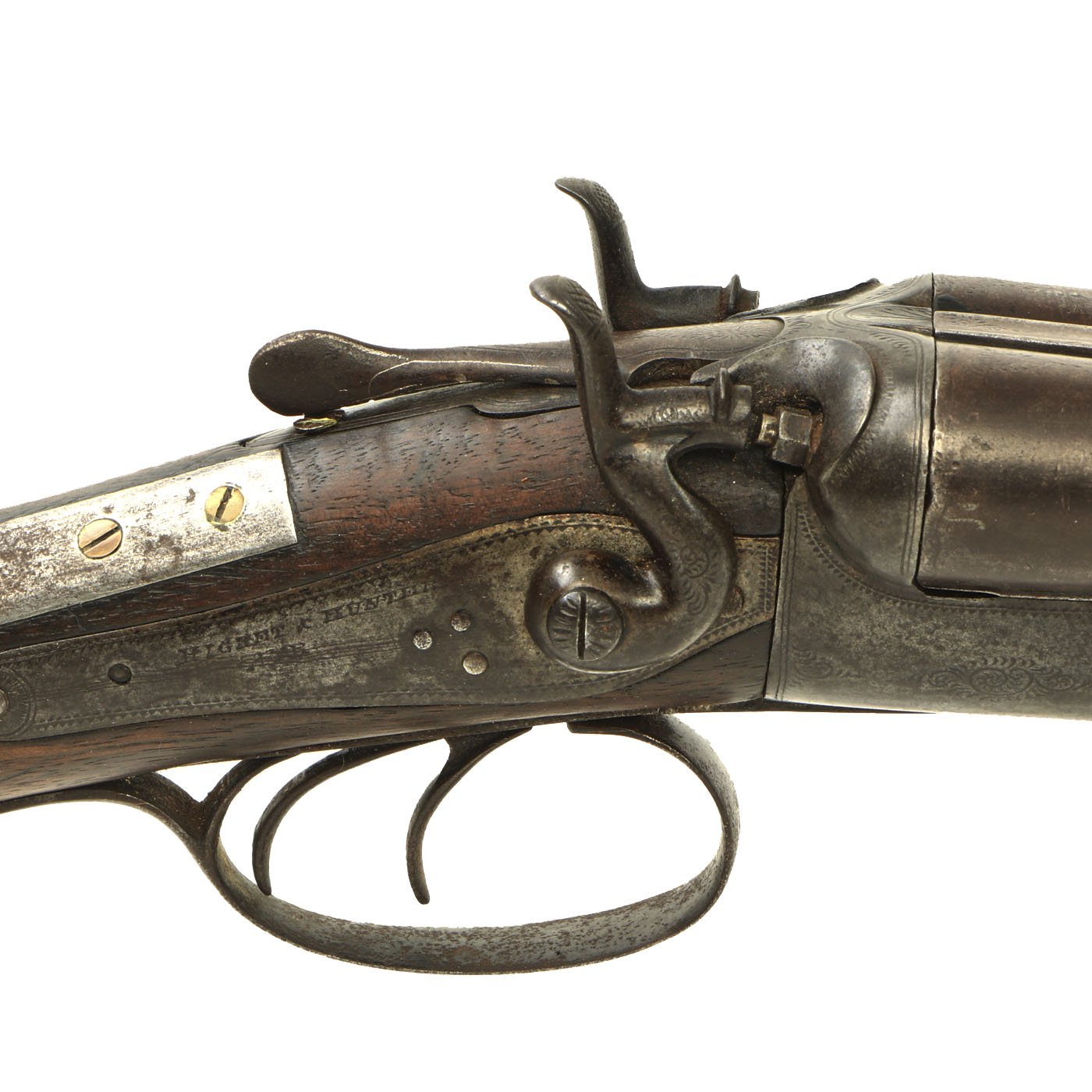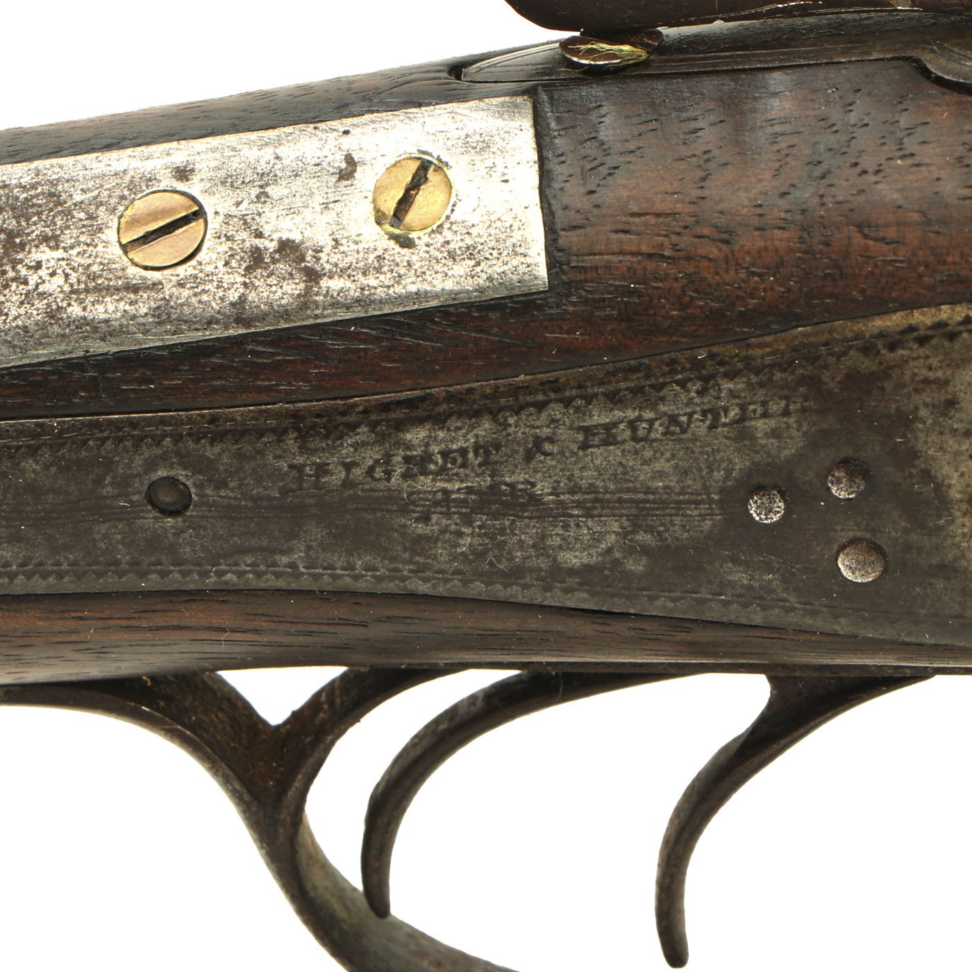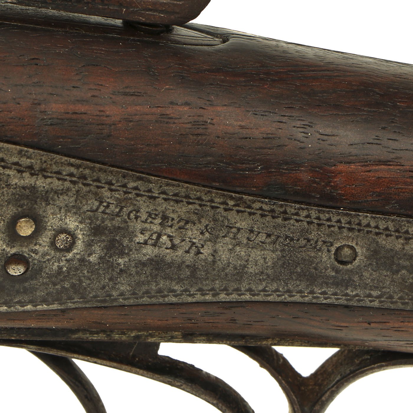 Original Item: Only One Available. Here we have a typical British-made Double Barreled Hammer shotgun, intended for the large U.S. import market. It is marked on both lock plates with HIGHET & HUNTER over what looks to be AYR, a maker that we have not been able to find much about. Ayr is a city on the Southwest coast of Scotland. This was most likely the retailer or assembler, who marked the gun by hand before assembling and selling it. The barrel strap looks to be marked STUB TWIST LT CHOKE, but it is hard to read. It indicates that the barrel is spiral "damascus" forged, and the twist marks can still be seen on the barrel surface.
