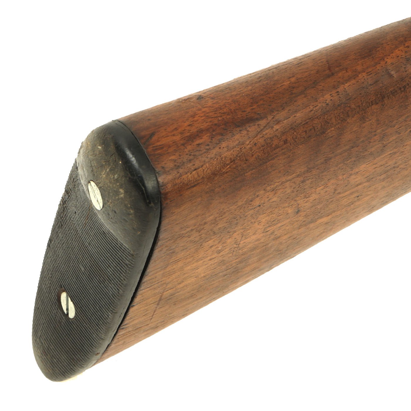 The action still functions correctly, with ejection and dry firing. The rear stock has some lovely curl, and has a very nice gutta percha butt stock pad. The screws used look to be replacements however, as do other screws on the shotgun. The trigger guard is currently only loosely attached, as at least one of the screws has stripped out of the wood.