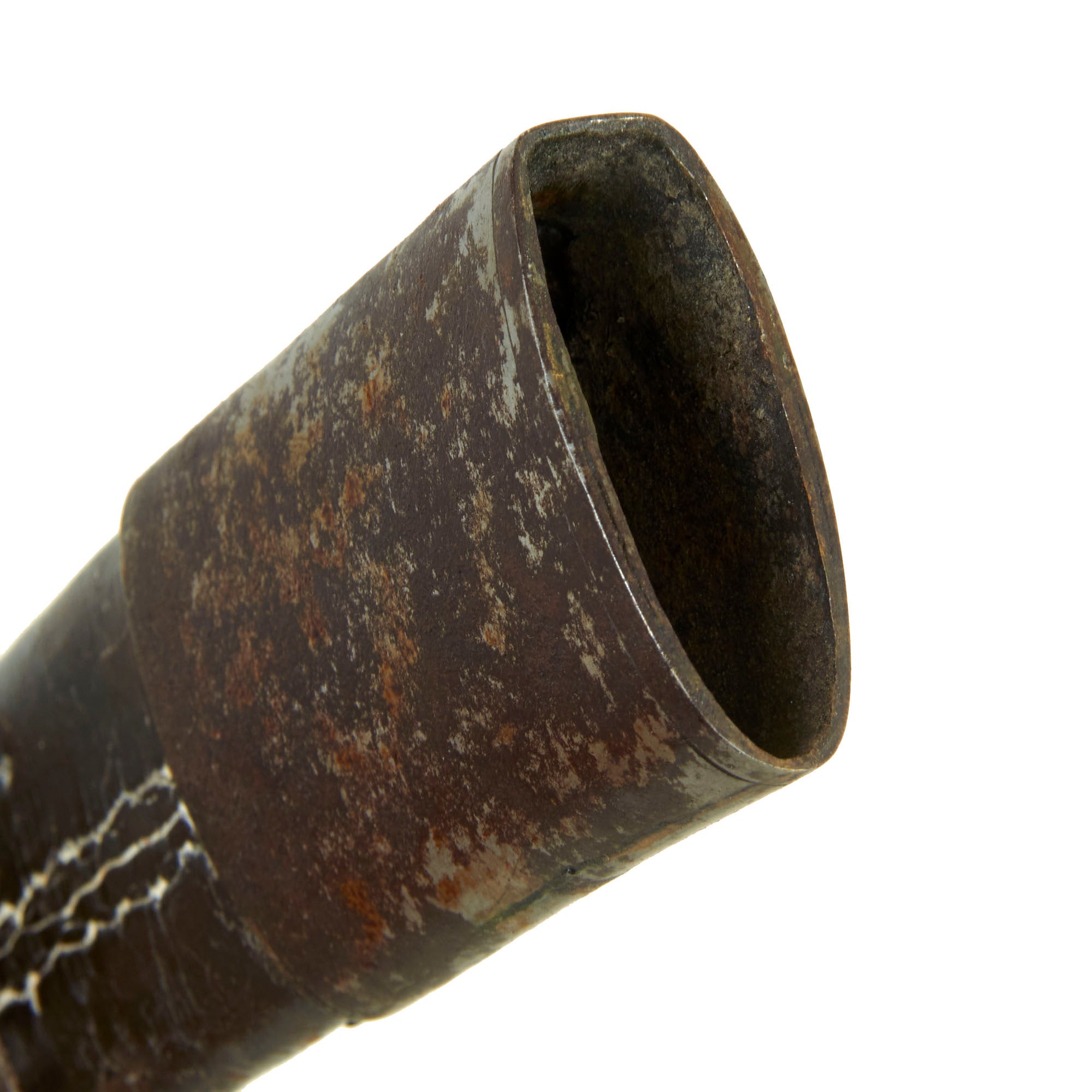 The 32⅛” scabbard is in phenomenal shape for its age, as the vast majority of basket-hilted broadswords from this period are without their original scabbards, many being given replacements in the 20th century. In some ways, the original scabbards have become rarer than the swords themselves! The leather face of the scabbard is still embossed with X & I patterning, with an X followed by six I’s repeating. There is loss to the leather as shown, but the majority is intact, and the stitching on the back of the scabbard appears to be intact as well. The throat is intact and its decorative engravings are still in good order, but there is heavy rusting as is expected from iron of this era. The throat has a long “hidden” strip of metal which folds over through the leather to keep the throat in place. The original drag is intact as well, but is also covered with areas of oxidation. The patina & wear of the sword is matched by the scabbard, making this a set that has been together for at least 275 years.