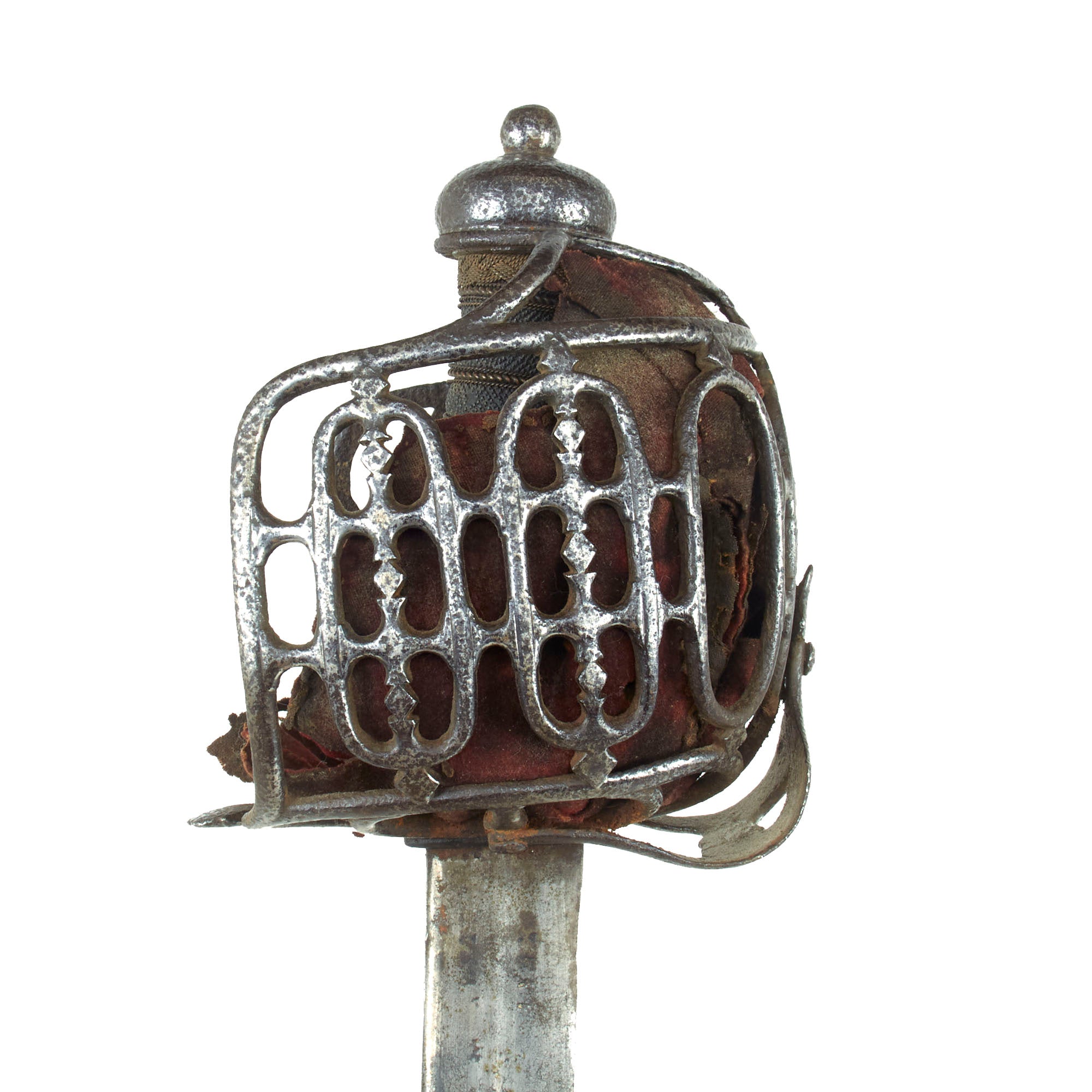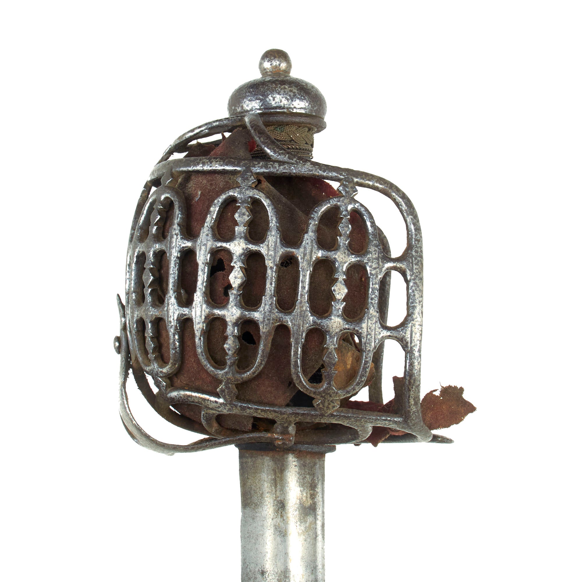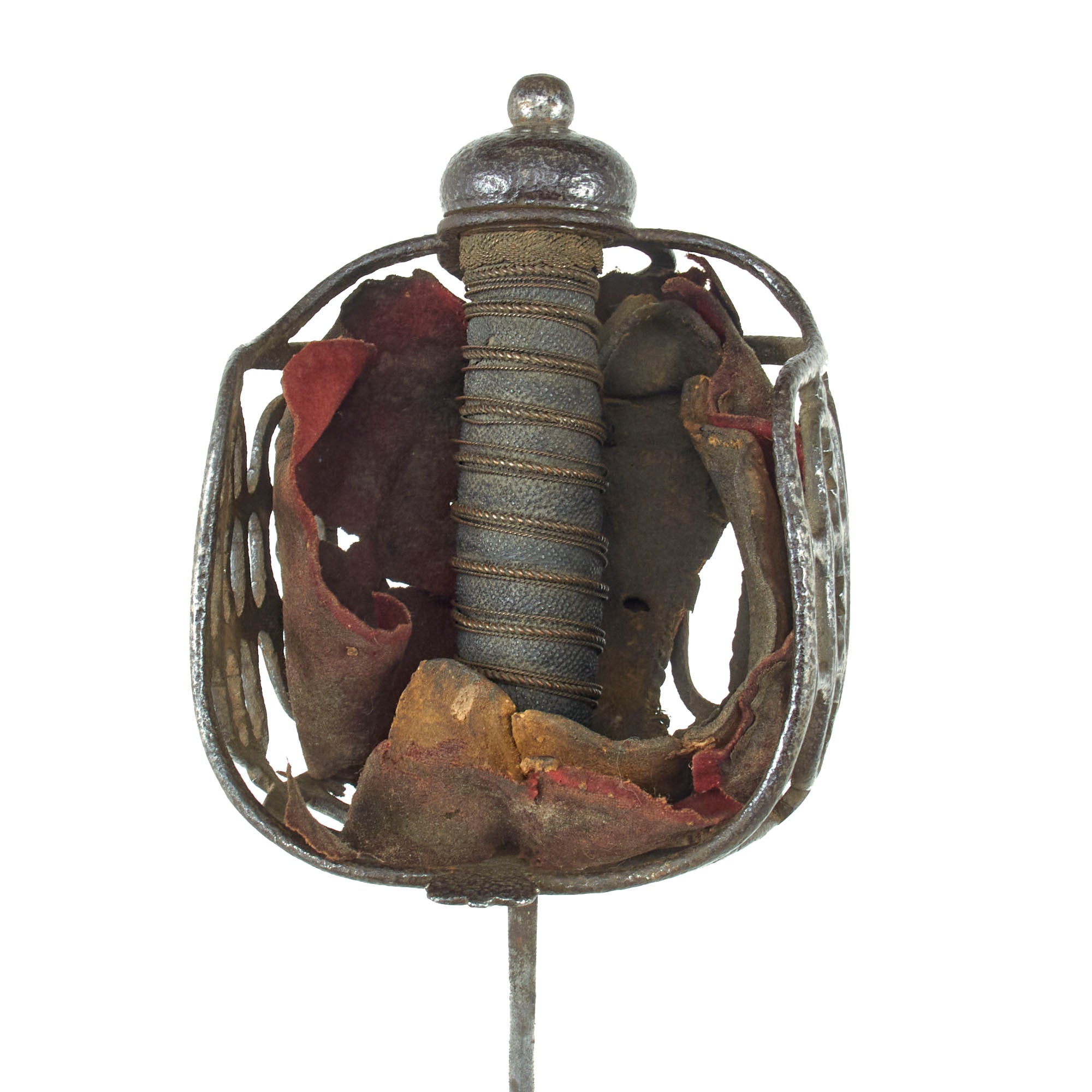This example bears several lovely designs in the basket, namely the oval sections with cross patterns, with one oval which is left empty with a corresponding hole stitched into the leather lining. Another interesting aspect of this basket is the separate heart-pierced forward guard which is attached with three screws. The hilt ends in a British bun pommel with an integral capstan. Rarer still, this example miraculously has retained its original leather blade buffer.
