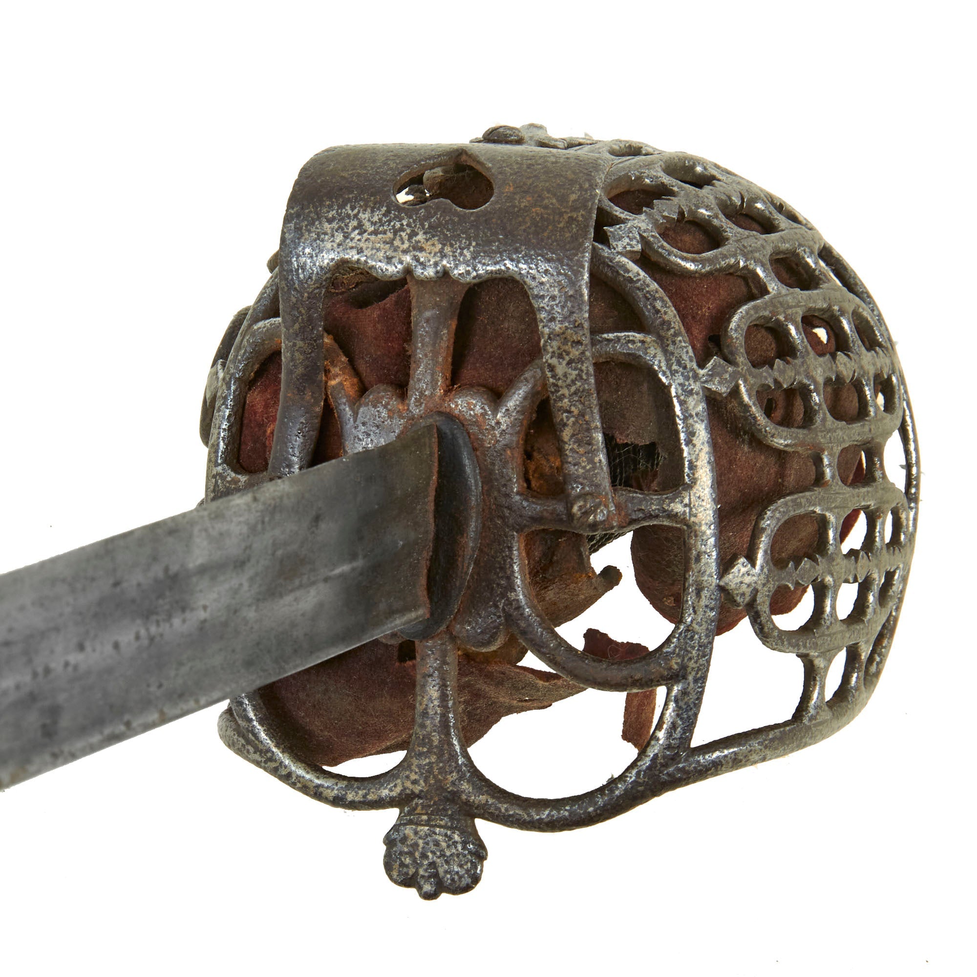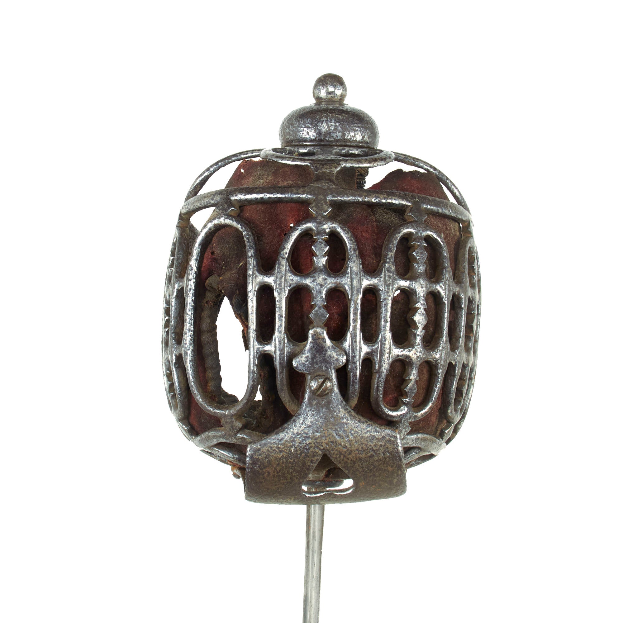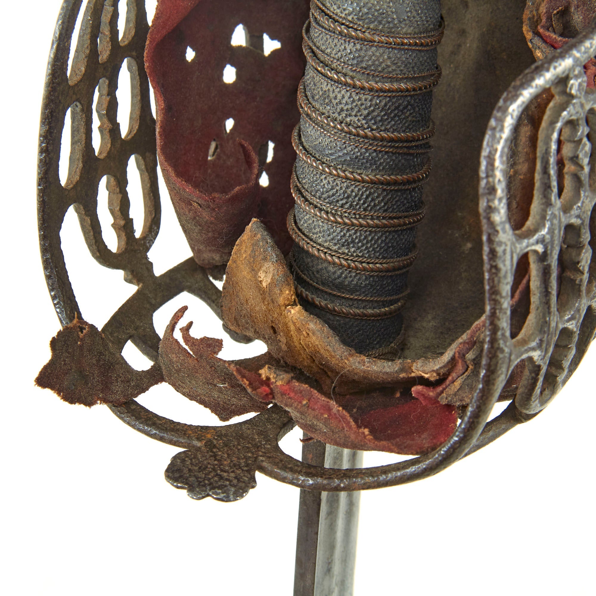 This example bears several lovely designs in the basket, namely the oval sections with cross patterns, with one oval which is left empty with a corresponding hole stitched into the leather lining. Another interesting aspect of this basket is the separate heart-pierced forward guard which is attached with three screws. The hilt ends in a British bun pommel with an integral capstan. Rarer still, this example miraculously has retained its original leather blade buffer.