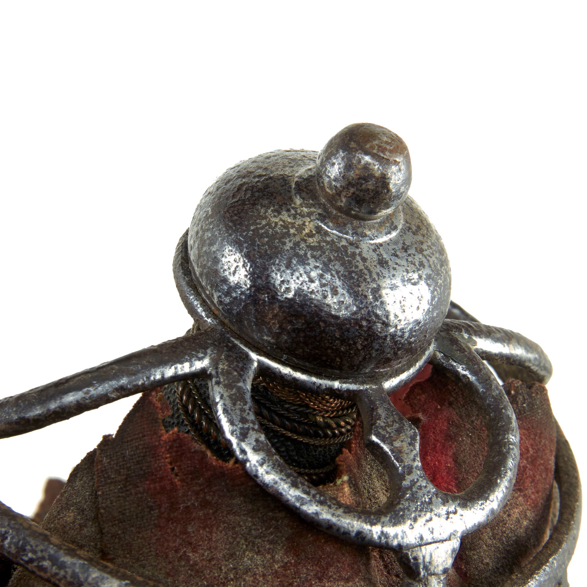 This is a tremendously preserved example of a Mid-18th Century Scottish Basket-Hilted Broadsword with a lovely sharkskin shagreen grip wrapped with three strands of twisted copper wire, with braided wire bushels at the top and bottom of the grip, otherwise known as Turk’s head knot ferrules. This example also retains much of the original red wool and leather interior liner in the basket, something we never see on examples this old. The absolute scarcest part of this sword is its original leather & iron-mounted scabbard, which is in great condition with the patterns still visible on the leather surface.