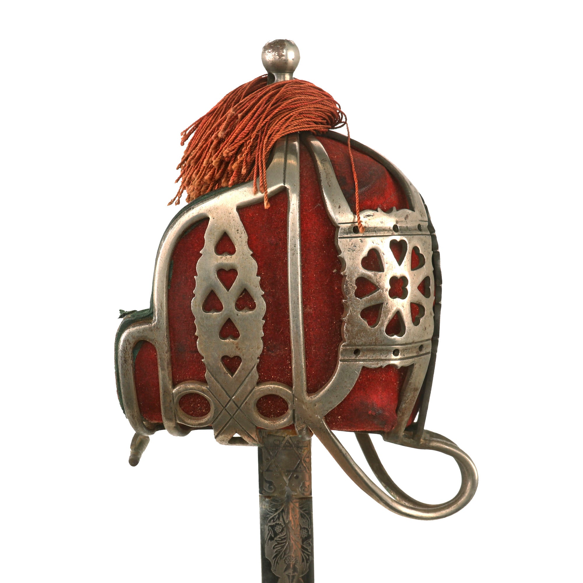 This straight blade has beautiful floral and patriotic motifs etched into the blade but remains unattributed or marked to an individual. The sword and basket are in excellent shape with no major deficiencies. There is minor tarnishing present, as well as some discoloration to the inside and outside of the red “padding” inside of the basket.