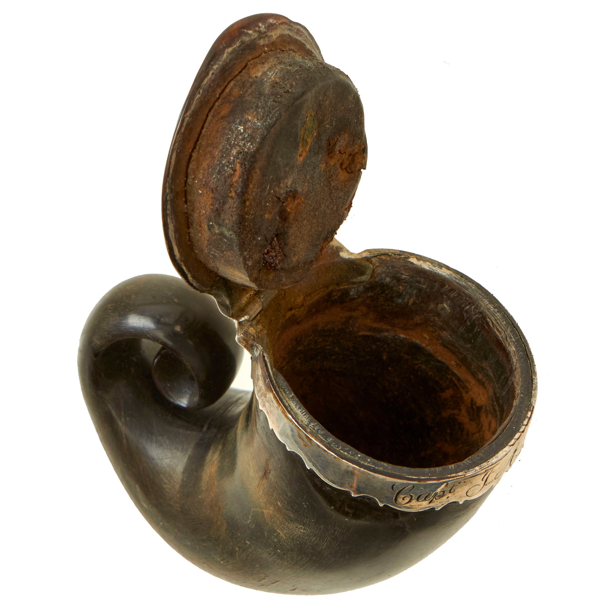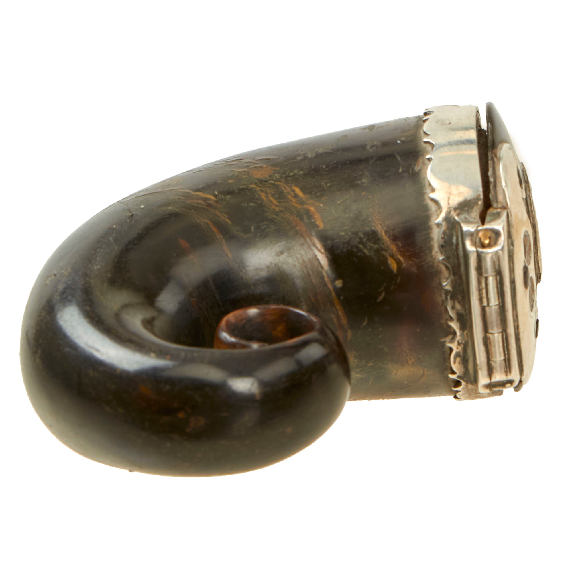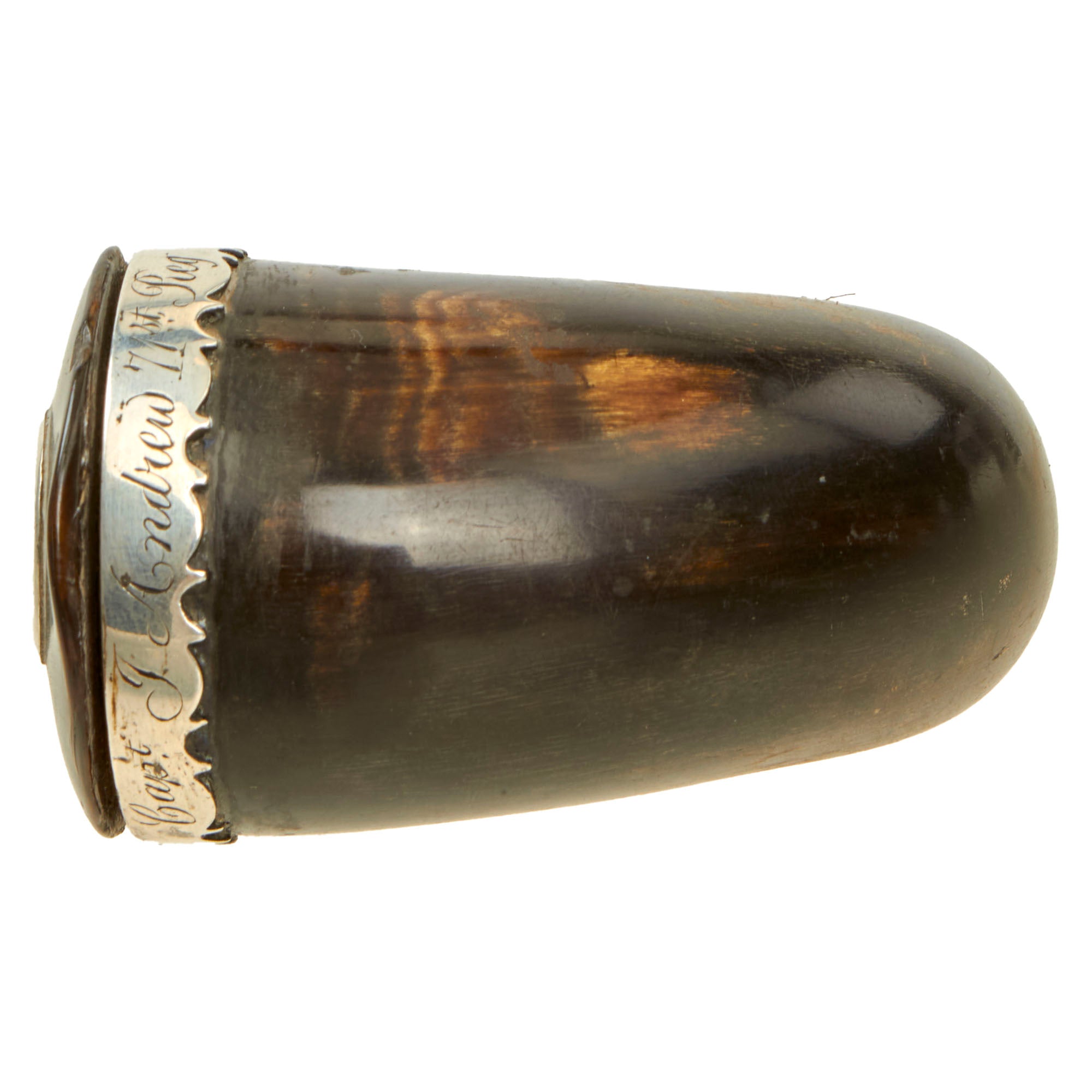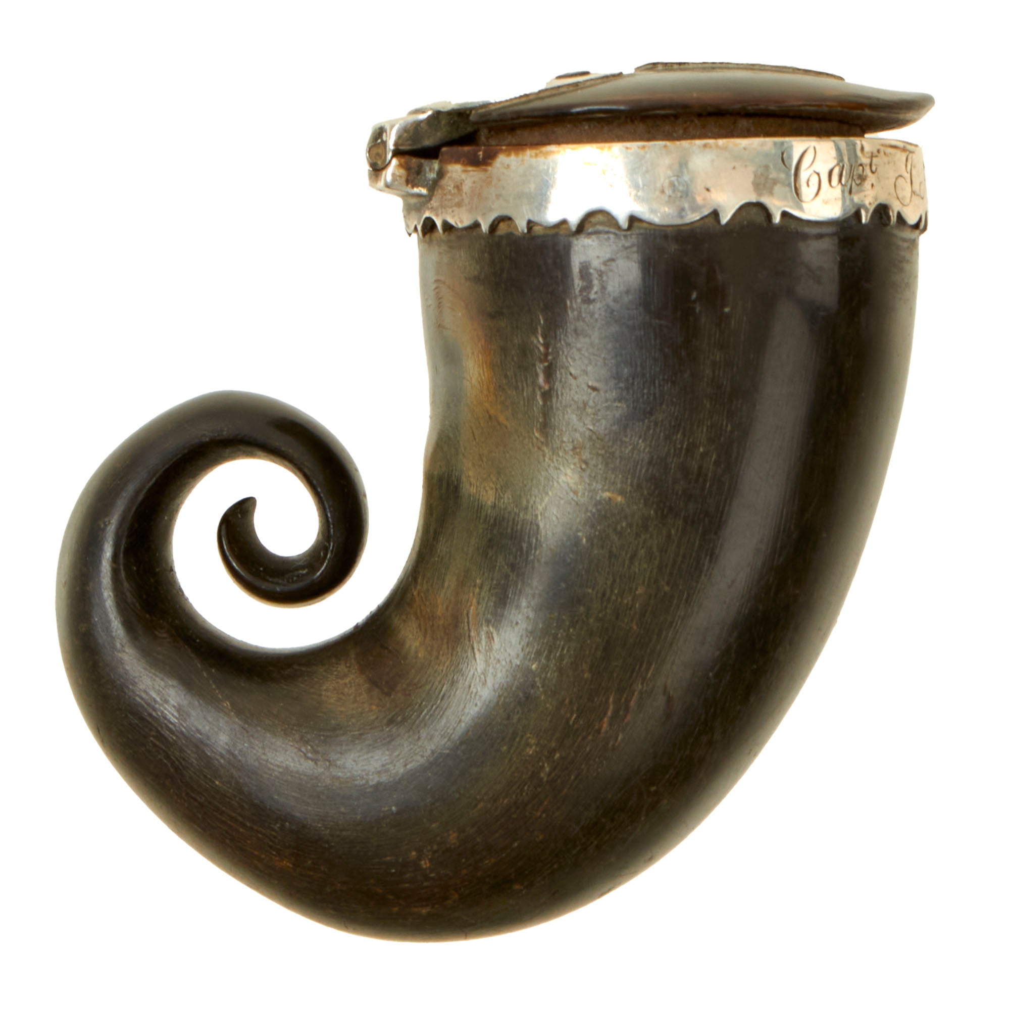 Original Item: One of a Kind. This is just lovely, a well carved wood Ram's Horn Snuff Mull with sterling silver hinged lid engraved Cap’t J. Andrew 71st Reg’t, with the initials J.A. engraved on the top. Measures approximately 2 1/2” x 2 5/8” x 1 1/2”, and is in really great shape. The lid still closes securely, and has a lovely worn look. The lid is decorated with silver.