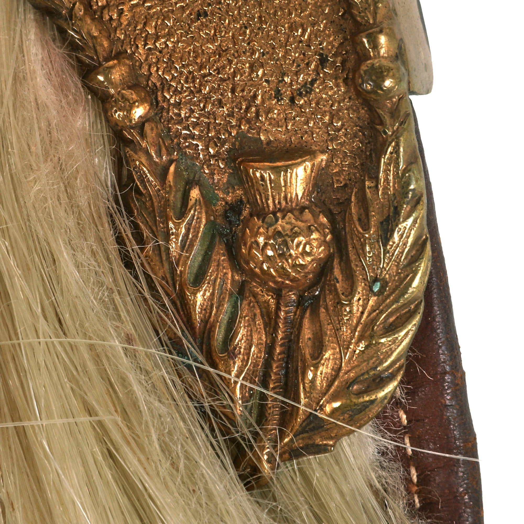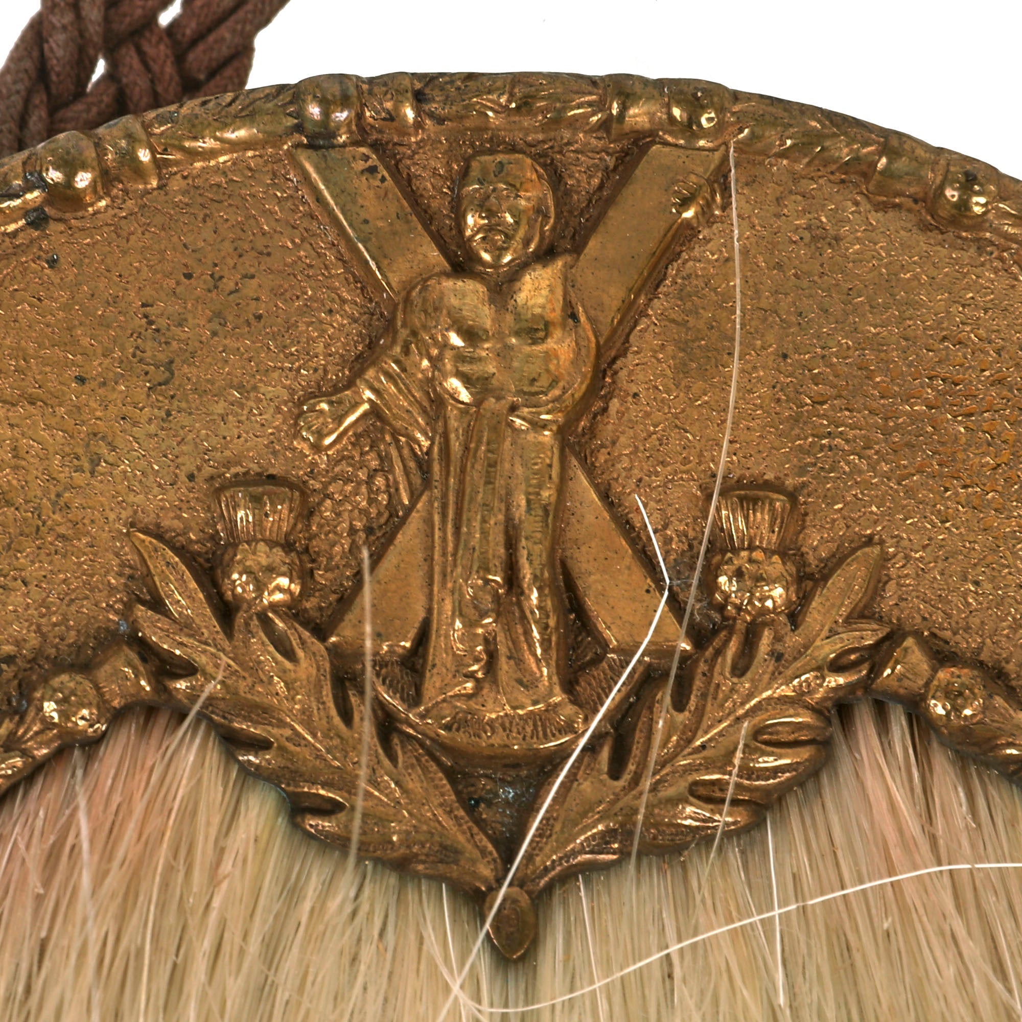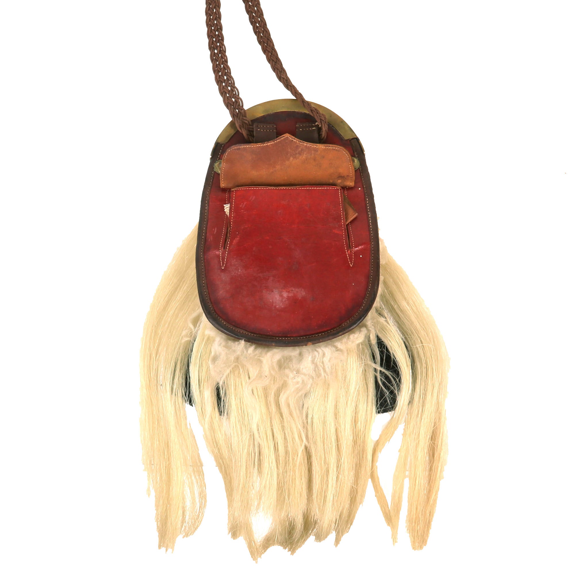 Original Item. Only One Available. This is an extremely scarce WWI Scottish sporran for the Black Watch, one of the most famous regiments in Scottish history. The sporran has gilt cantle with raised thistle edge and St Andrew to the center, a white horses hair body with five black horses hair tassels, emerging from plain black patent leather bells. Red leather backing and pocket to reverse, with a knotted belt sat in the belt loops. For its age, this example is in great condition.
