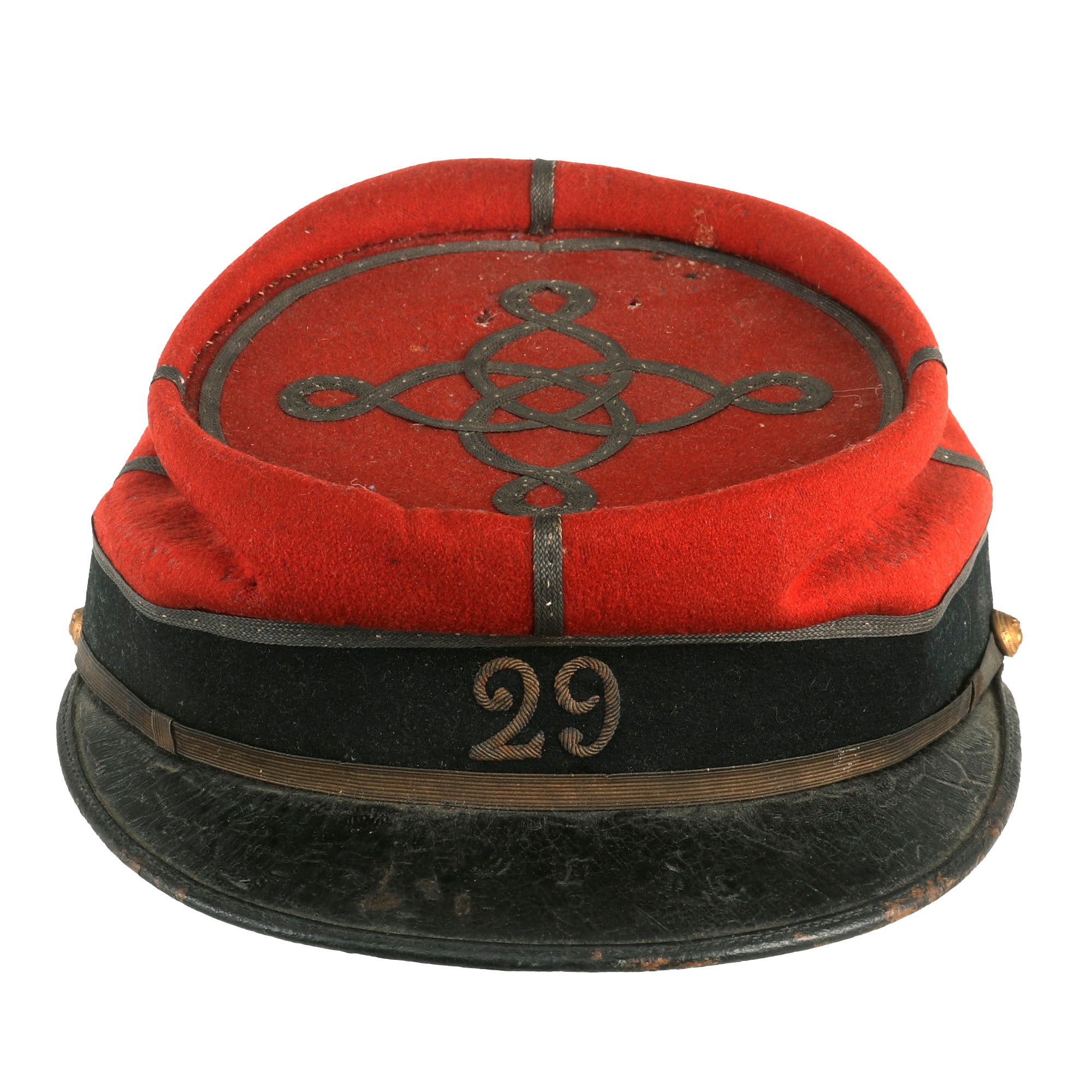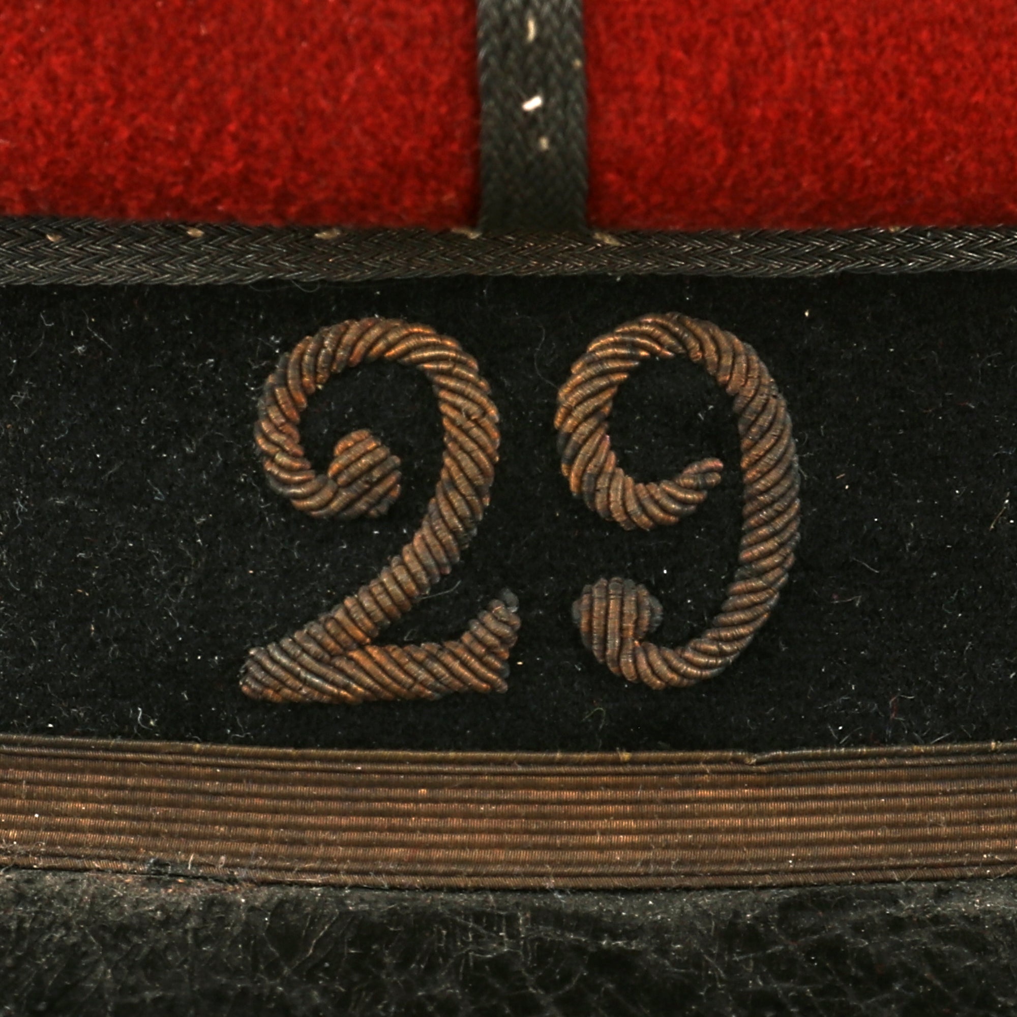 The body of the cap is constructed of red wool known as Madder Red. The body of the kepi does have some rather extensive moth nips scattered throughout, some formed into holes while the others are more in the surface. The black band has the number 29 on the front in lovely gold bullion thread. The ‘29’ is for the 29th Line Infantry Regiment of the 1st Brigade, 3rd Infantry Division.
