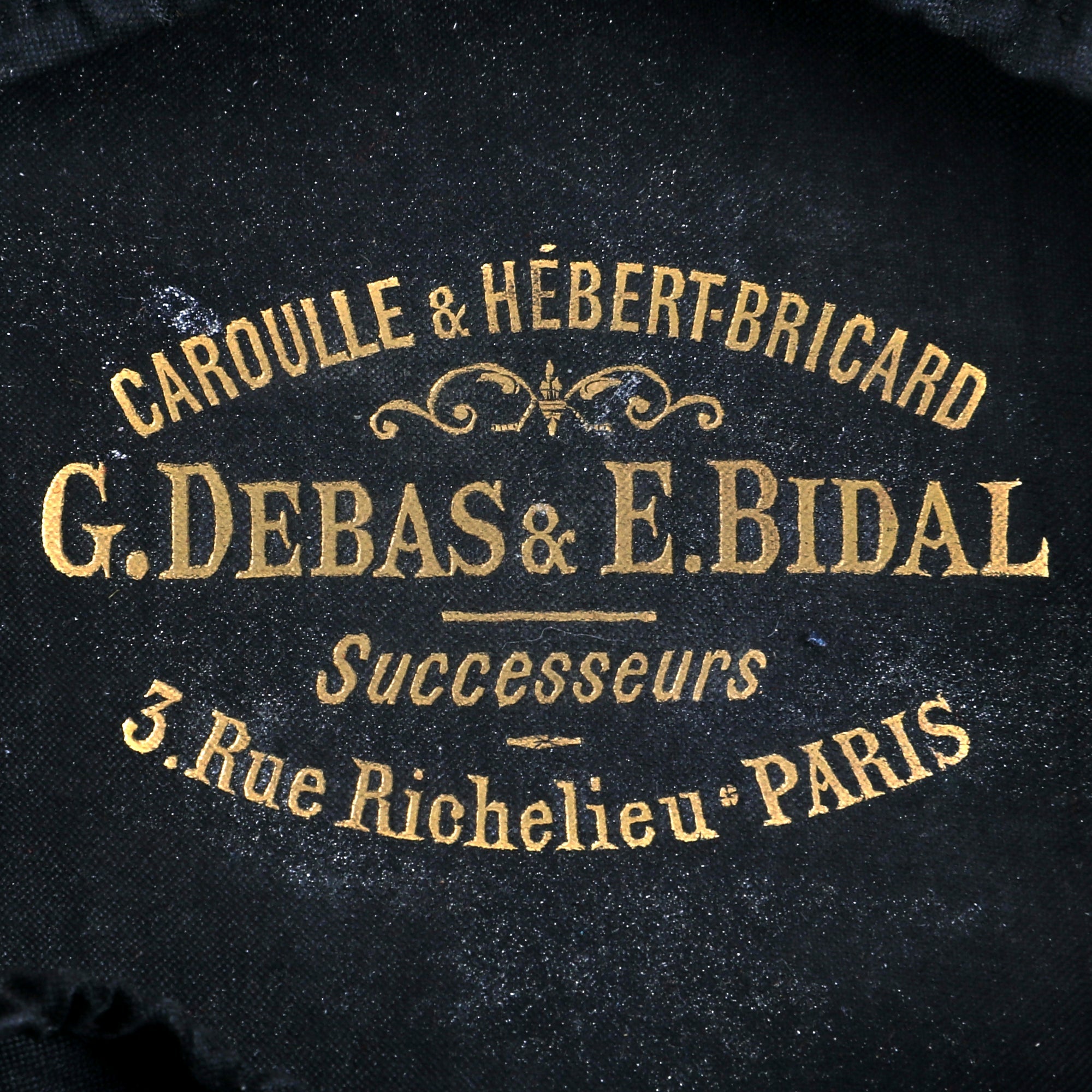 The interior of the kepi still retains a lovely black polished cotton skullcap lining and worn brown leather sweatband. The top rigid disc still has a very clear manufacturer marking in gold: