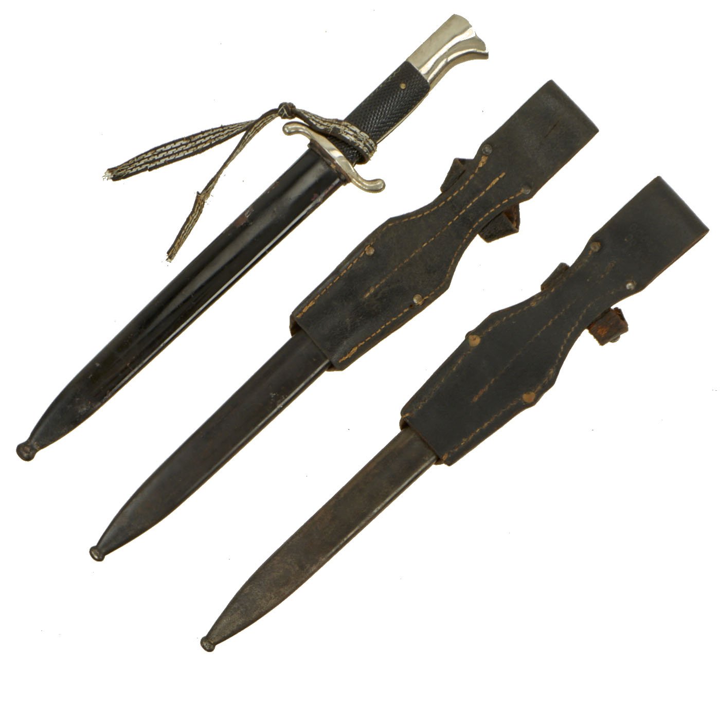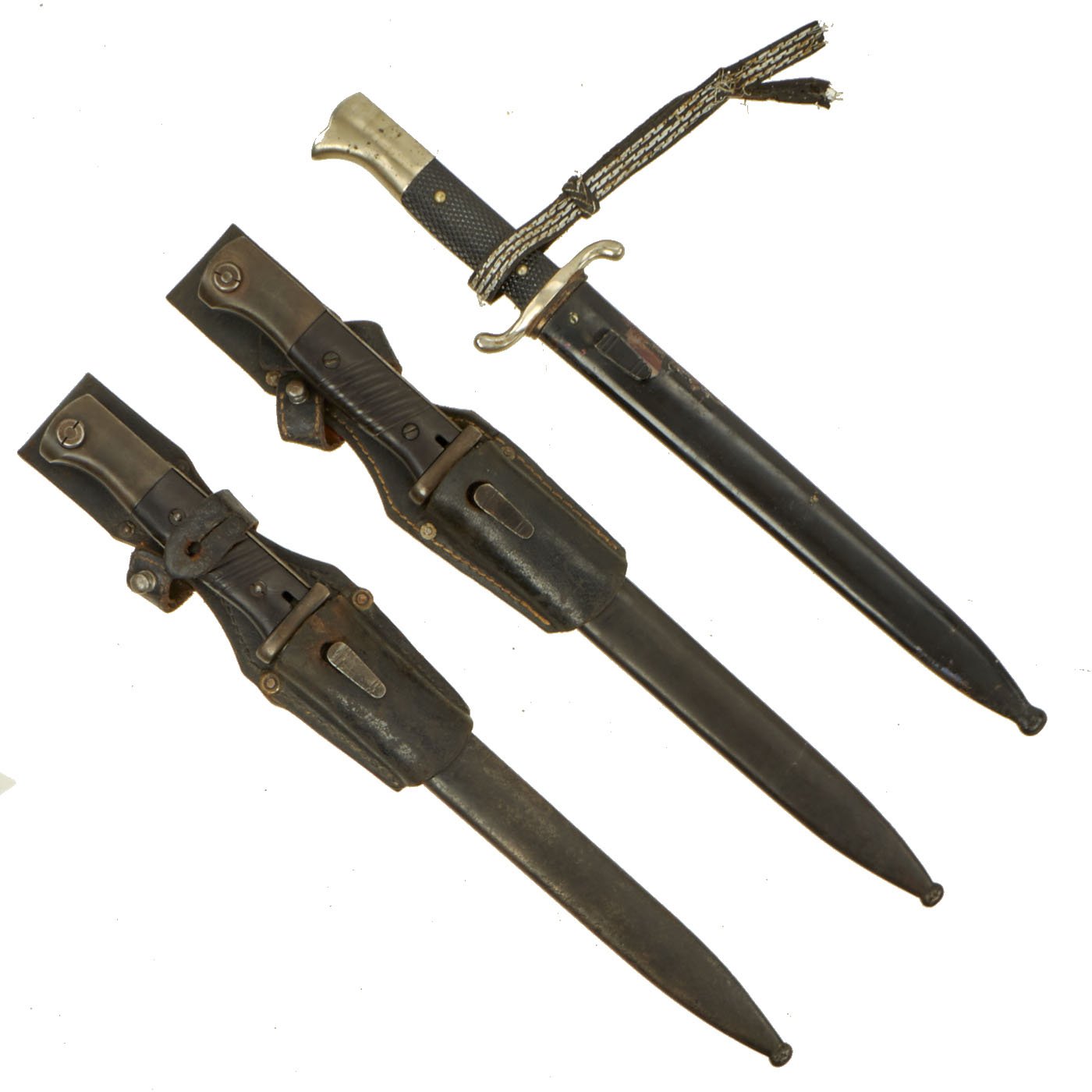 This is a very nice set of three bayonets with scabbards for the K98k rifle, one of which is a long nickel plated "parade" version. They make a nice set, representing a pre-war bayonet, a wartime dress bayonet, and a mid war bayonet.
