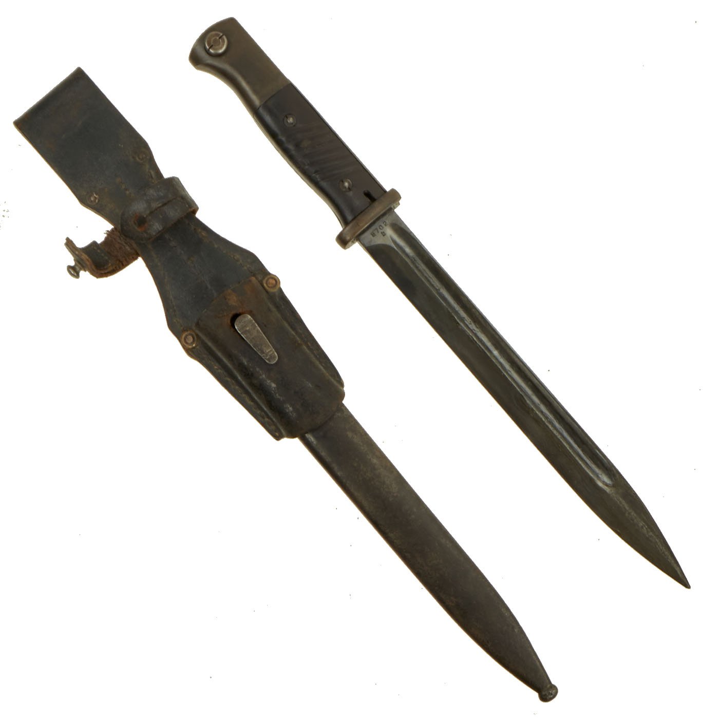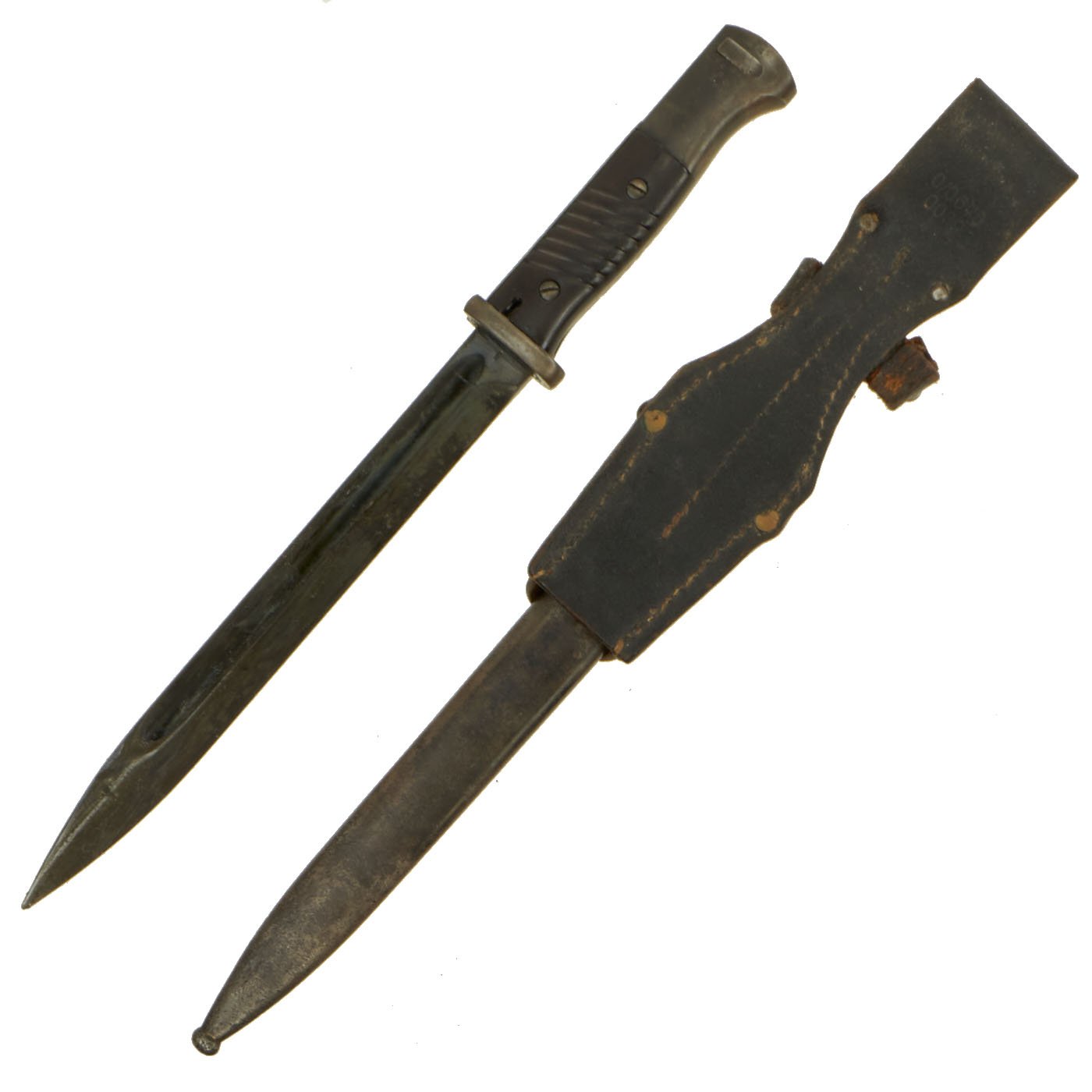 The total length of the K98 bayonet was 15.2 inches, far shorter than the 20 inch long GEW98 bayonet. The blade was also straighter in shape and the hand guard was omitted. The K98 bayonet was carried in a leather frog, or Seitengewehrtragetasche, on the left side on the equipment belt in combination with the shovel and its carrier. The maker marks on k98 bayonets where stamped onto the top of the blade. On the reverse the batch number and suffix were stamped.