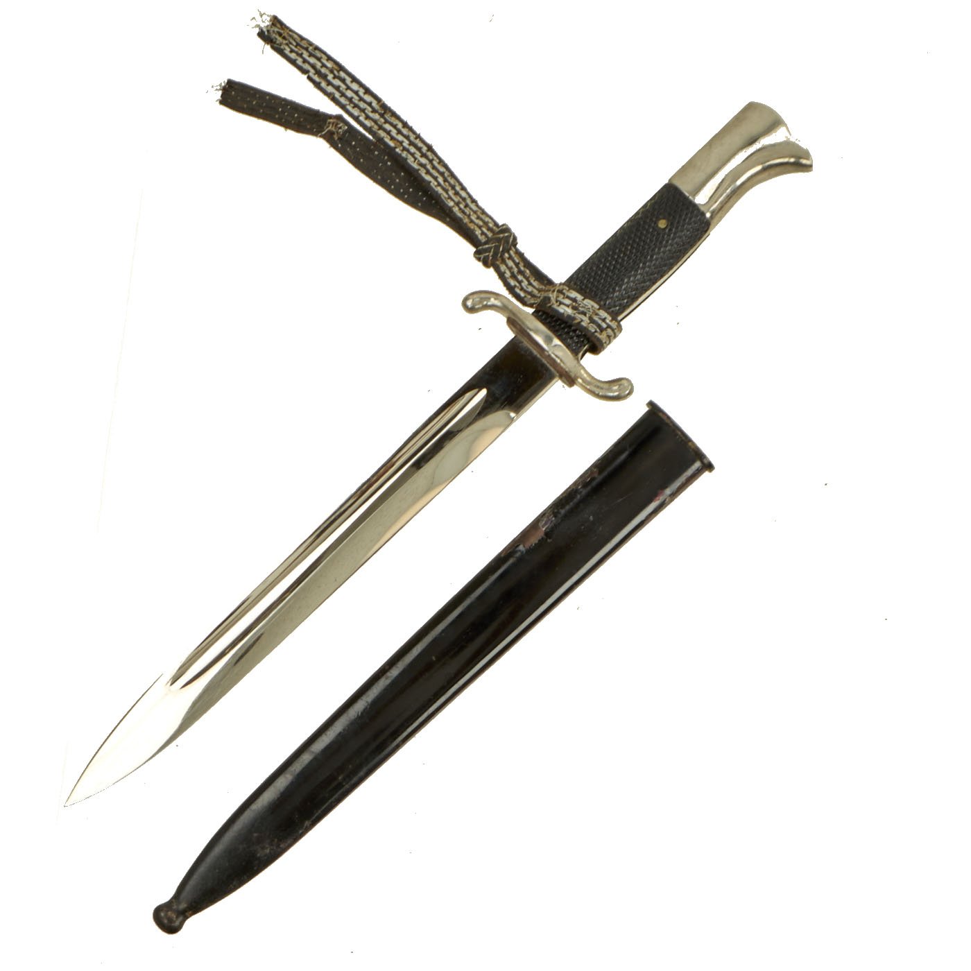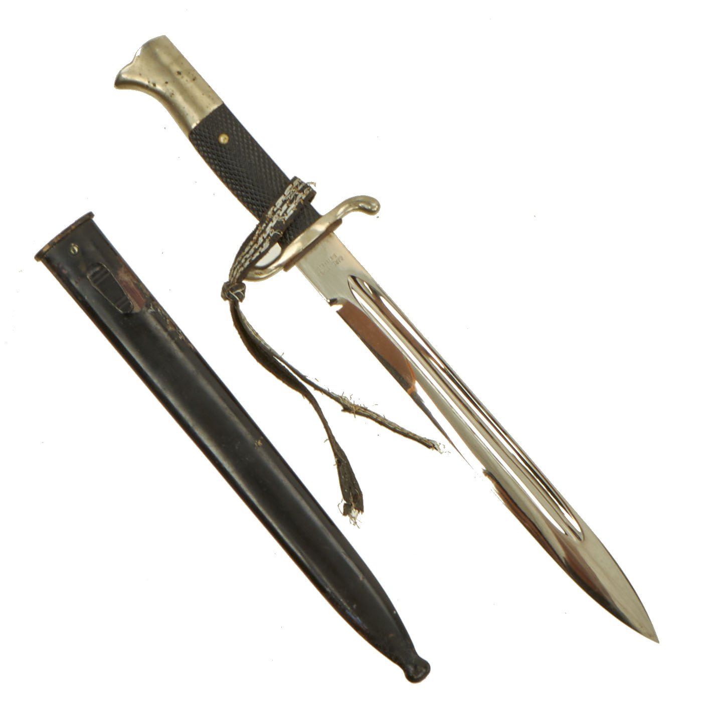 The second bayonet in the set is a nickel-plated firemans "dress" example, marked CARL HENKEL BIELEFELD. It is a typical fireman's style dress bayonet, with an "S" shaped crossguard, and checkered bakelite grips. It has no bayonet catch at all, and comes in an unmarked steel scabbard. The remains of a troddel knot strap are still attached to the handle.