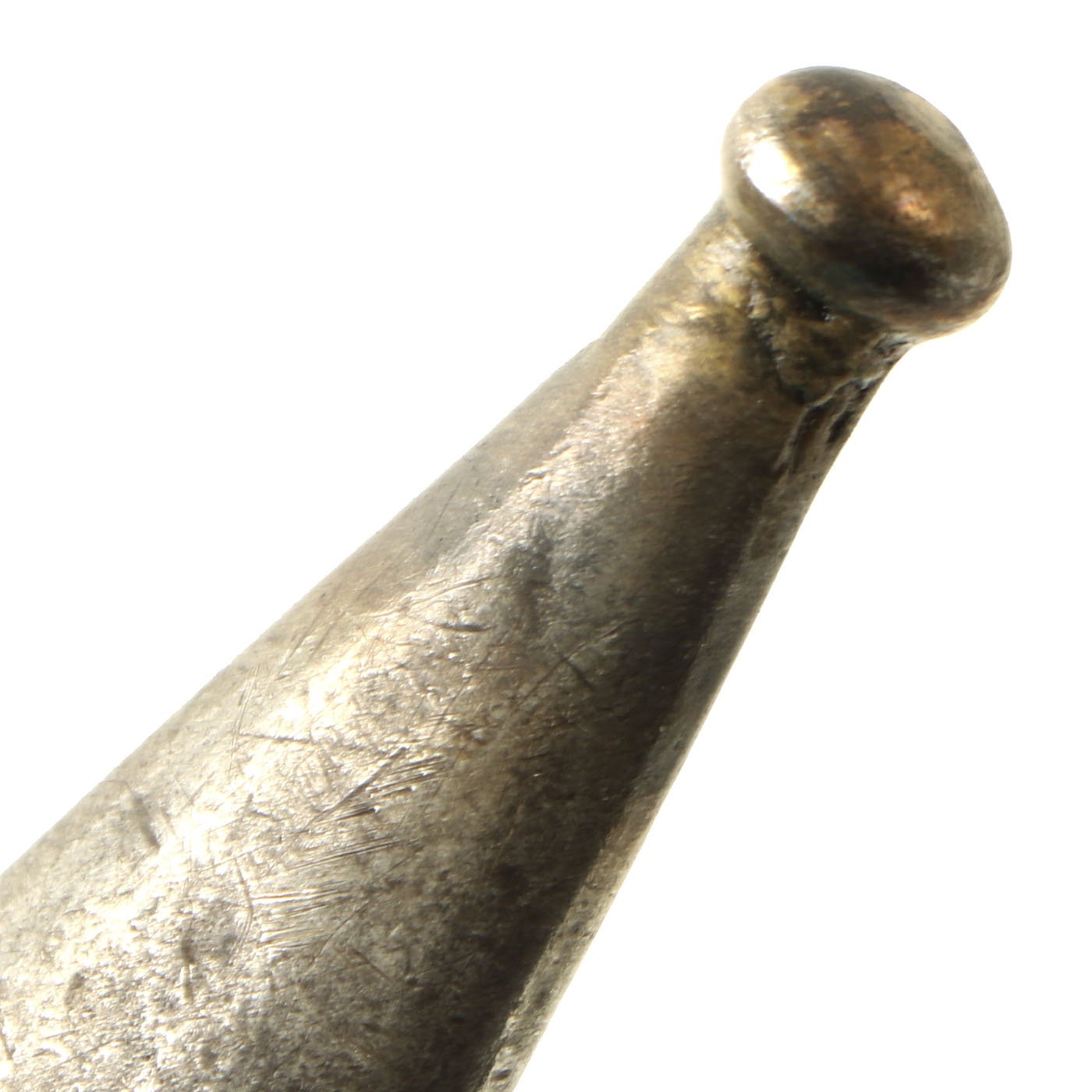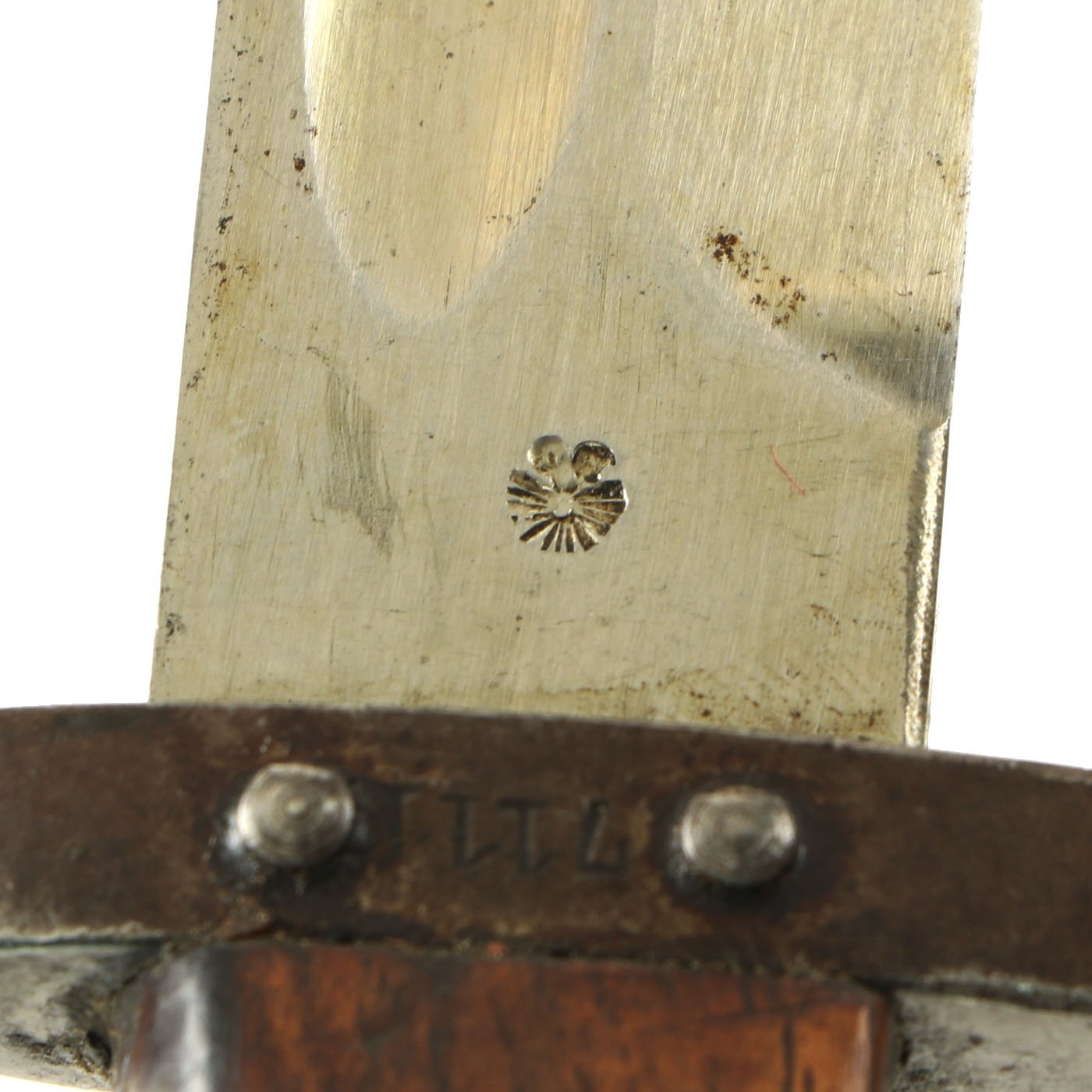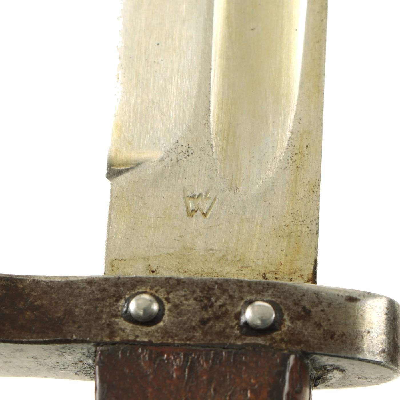 As with many Ersatz bayonets, this example was then officially shortened to 10 inches and shipped to WWI Ally Turkey. There, either during or after the conflict, it was further shortened to 8 inches, and given a profile much more like a fighting knife than a bayonet. Condition is good, but does snow much wear.