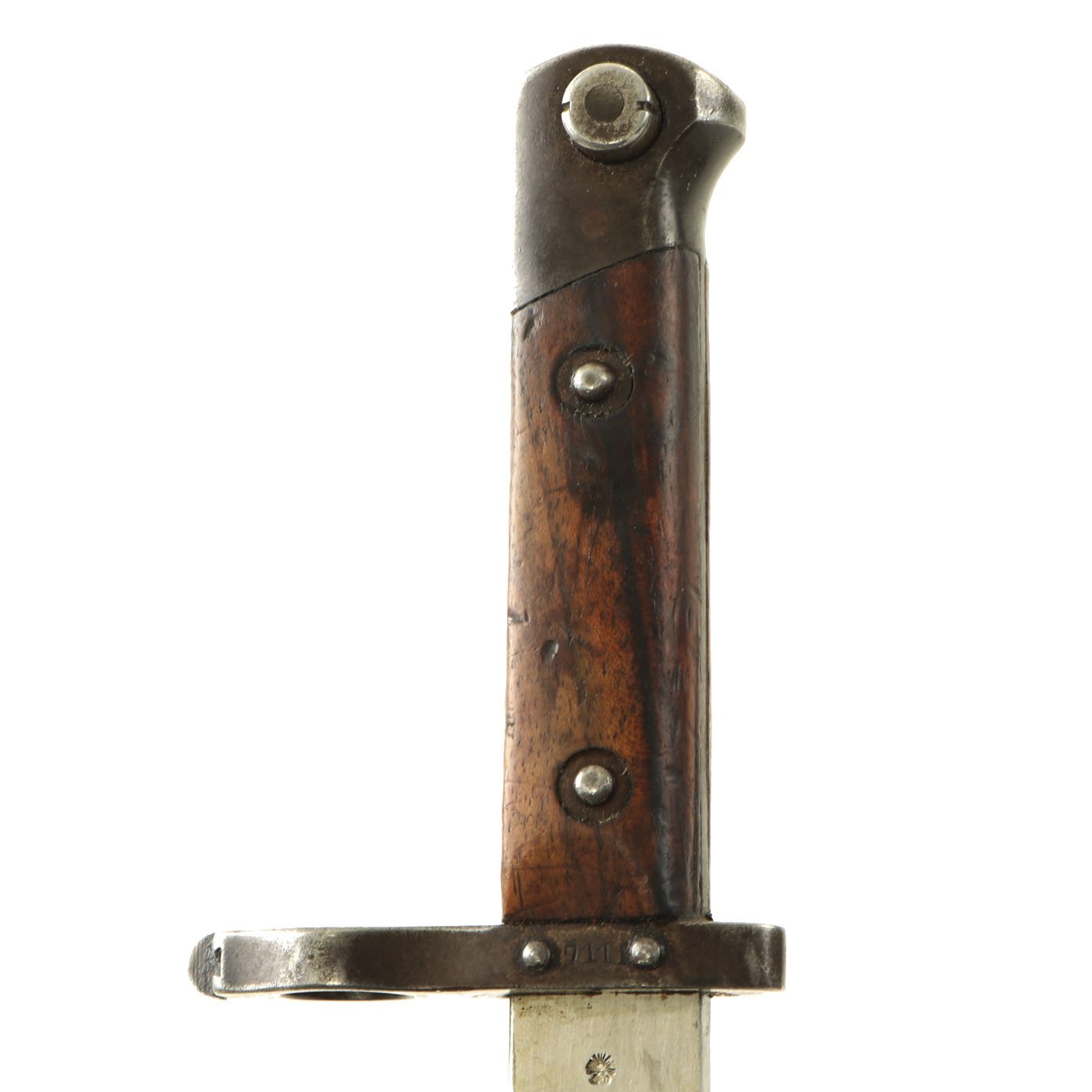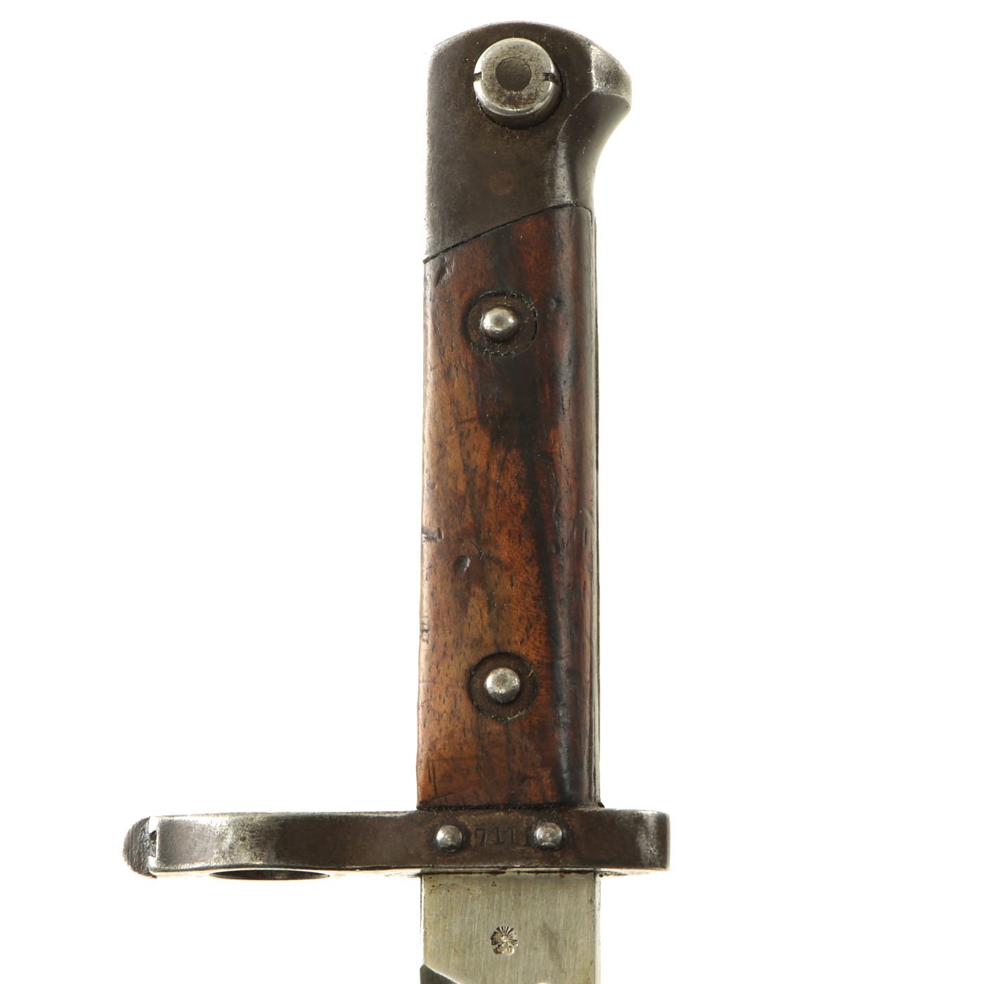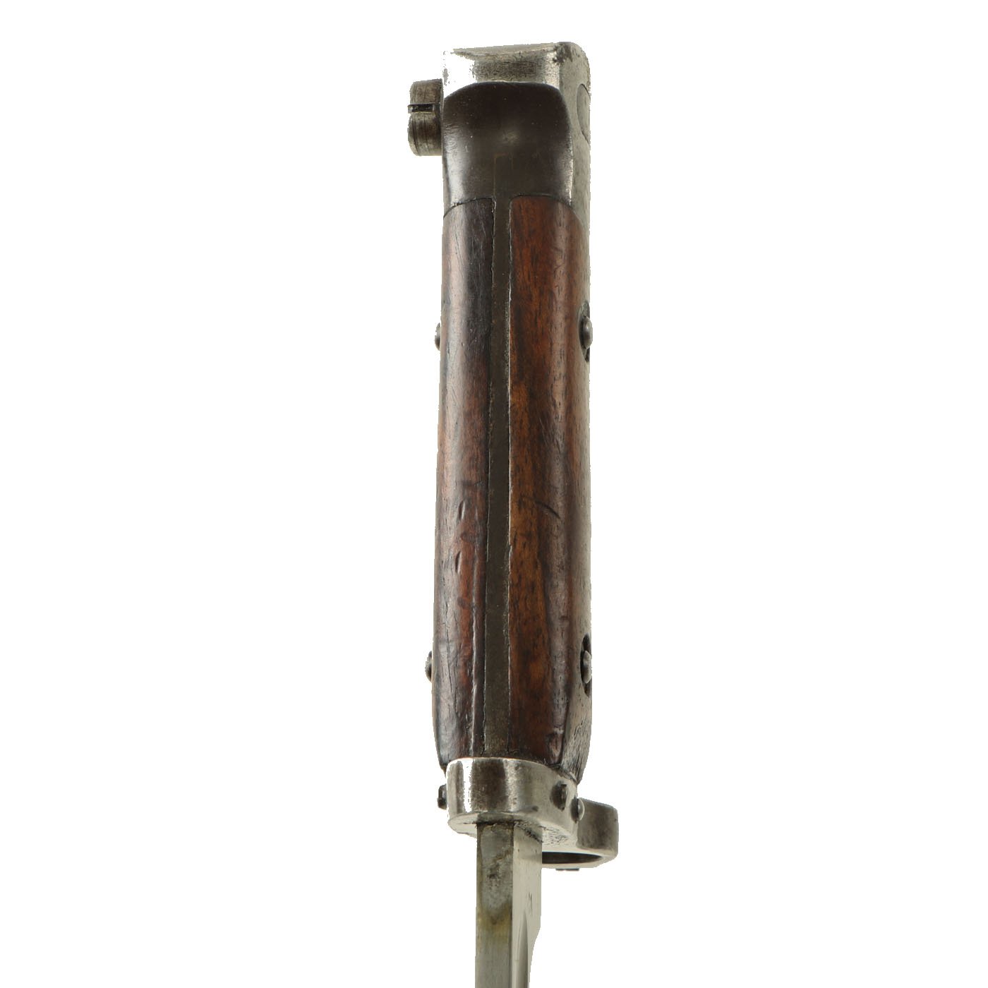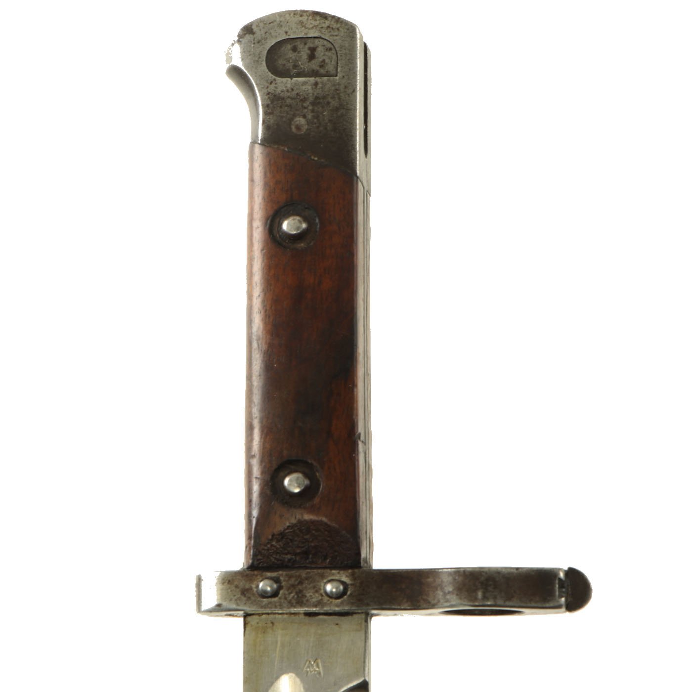 The first is an Austrian-made bayonet made to fit the Austro-Hungarian Empire's Mannlicher M1895 straight pull bolt action Rifle, which was the principal Rifle of the first World War for the Austrian Empire. It is a rather standard bayonet design, however this particular example has a front sight fitted on top of the bayonet crossguard. This is a very rare version used with the Mannlicher M1895 Cavalry Carbine.