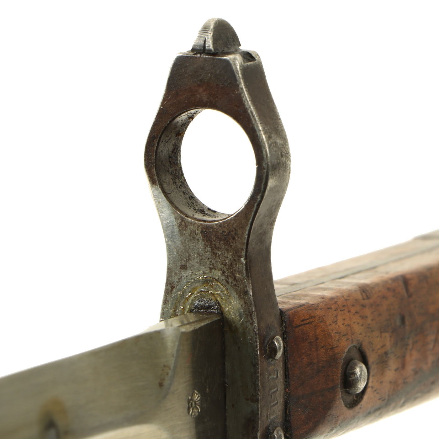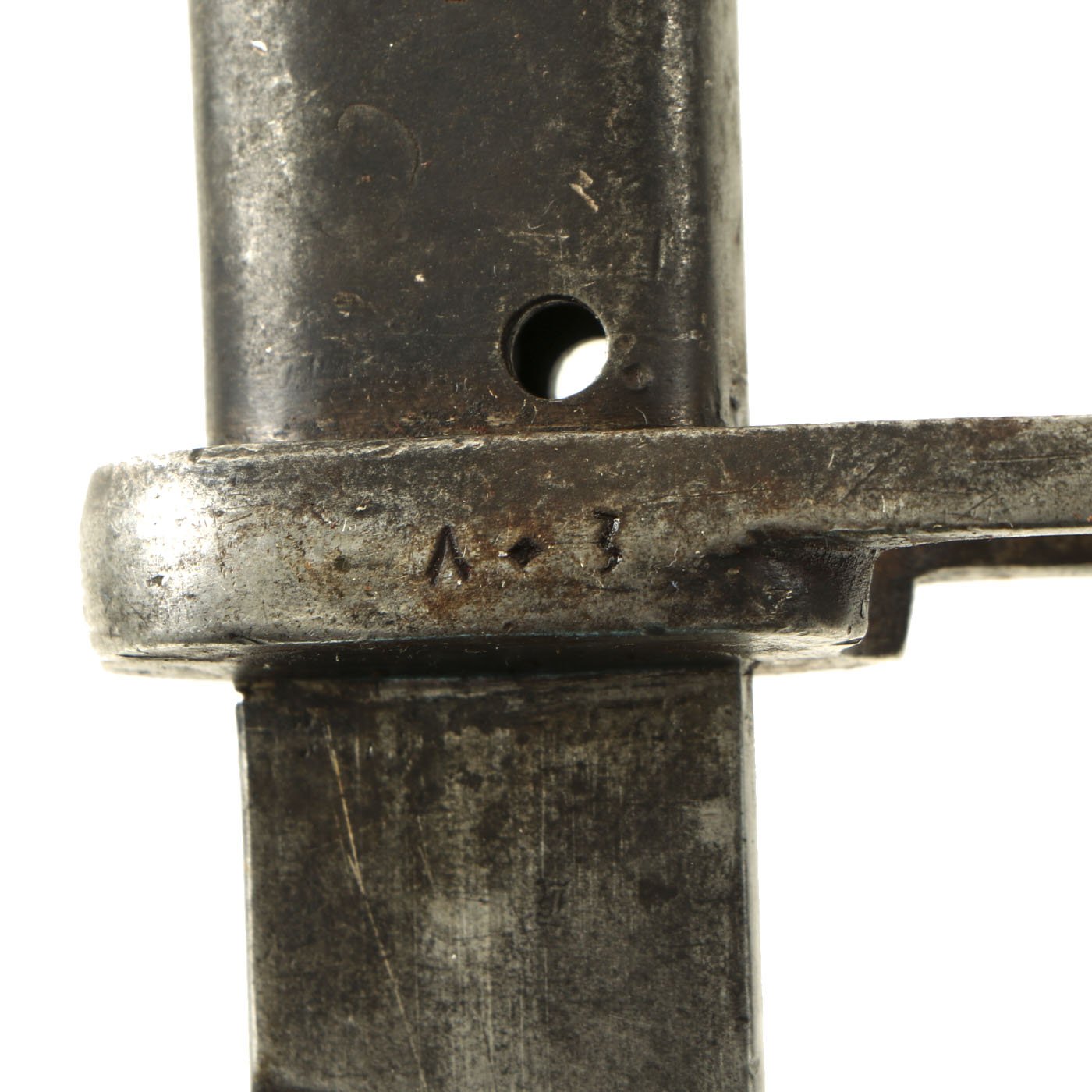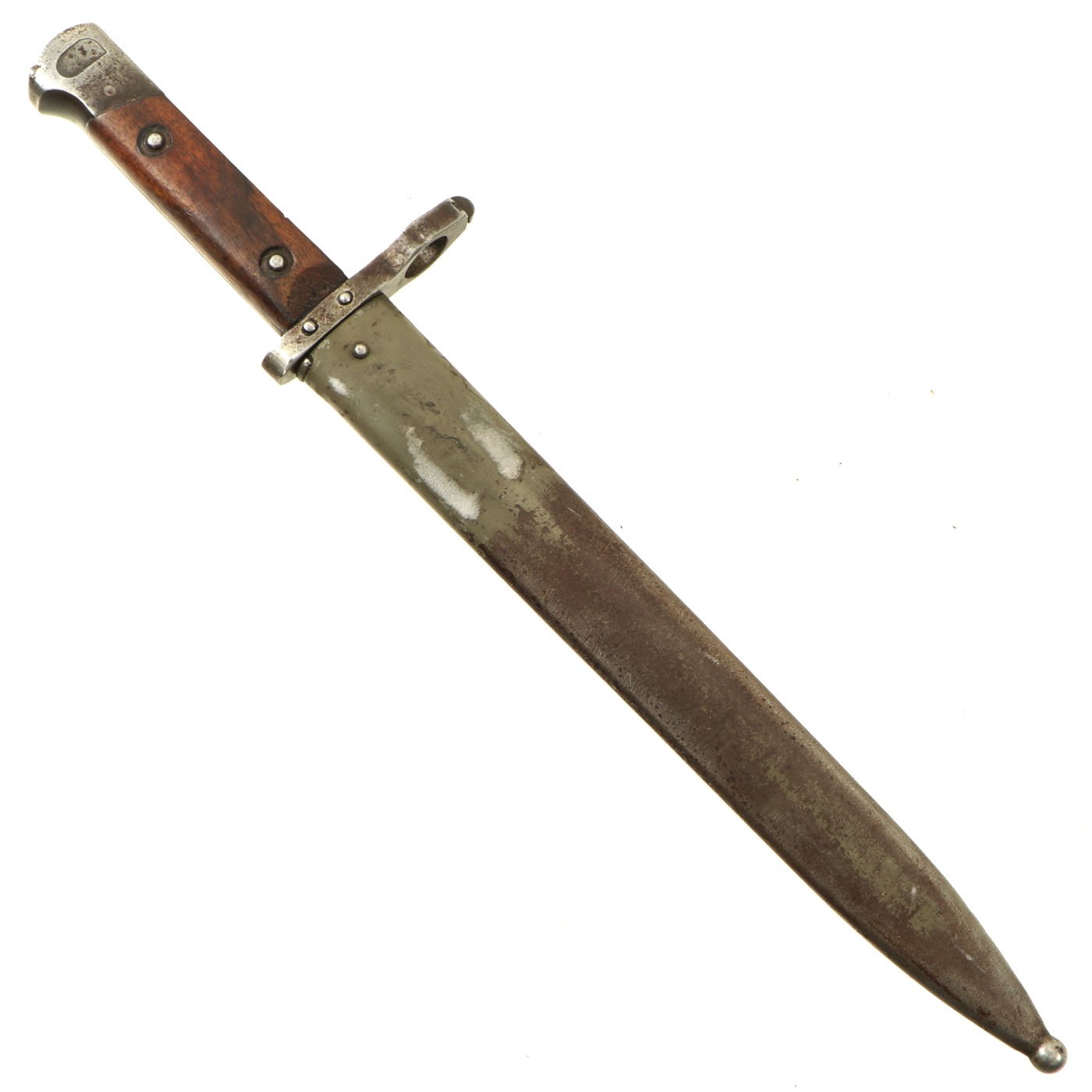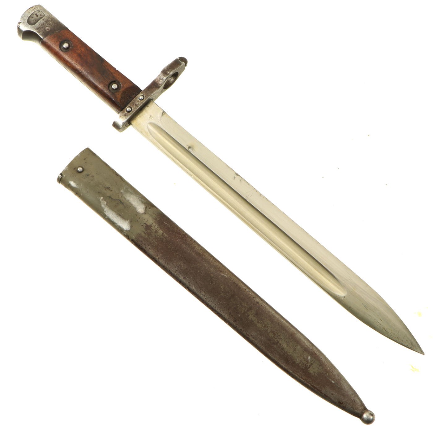 The first is an Austrian-made bayonet made to fit the Austro-Hungarian Empire's Mannlicher M1895 straight pull bolt action Rifle, which was the principal Rifle of the first World War for the Austrian Empire. It is a rather standard bayonet design, however this particular example has a front sight fitted on top of the bayonet crossguard. This is a very rare version used with the Mannlicher M1895 Cavalry Carbine.