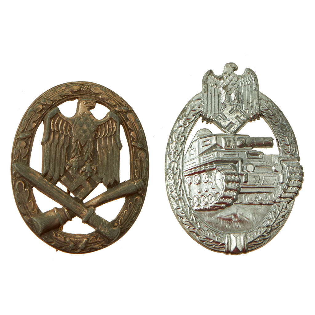 Original Items: One Set of Two Available. Here we have a very nice set of twoGerman WWII badges, representing a nice range of the types of awards given during the war. Both have damaged or missing pin catches, but still display very nicely, so this represents a great chance to add two different badges to your collection.