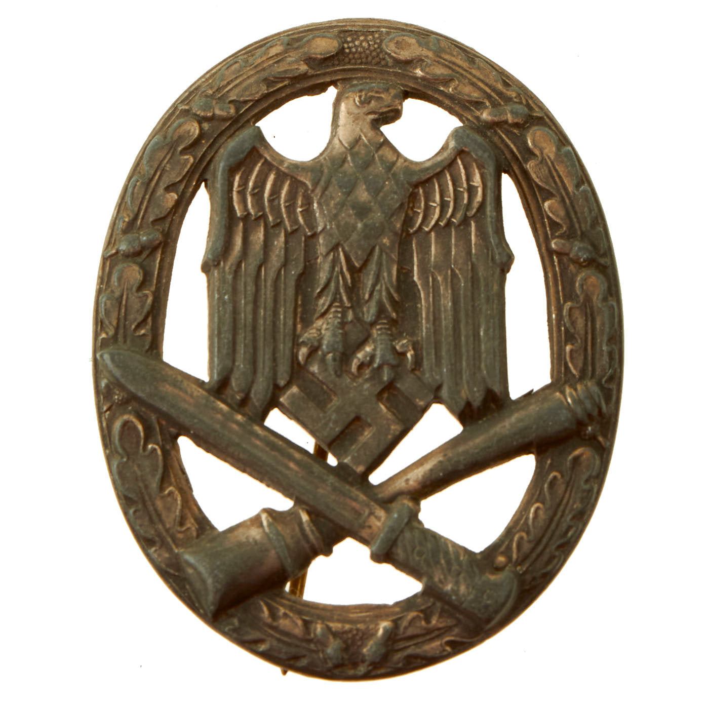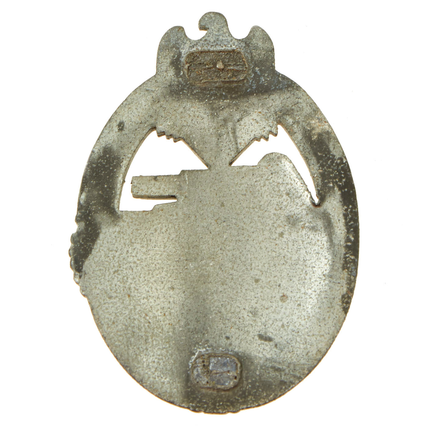 The second badge is a silver zinc General Assault badge, which shows more wear and oxidation. It still has the attachment pin and hinge, but is missing the catch, and is also not maker marked.