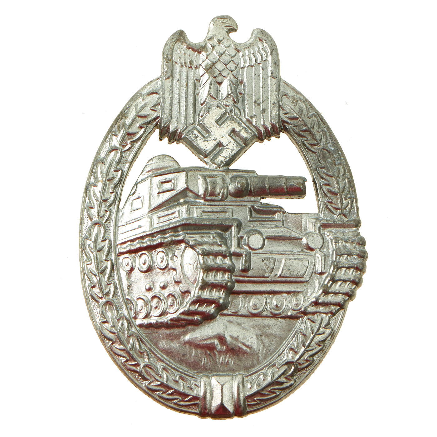 Badges were originally made from silvered Tomak alloy, later moving to silvered zinc and other cheaper alloys. The design is iconic, the front has a border of oak leaves tied at the base, a Heer-style national eagle clutching a mobile swas (hook cross) perches at the top of the wreath, a Panzerkampfwagen IV superimposed in the center on grassy ground, with its left tank track extending over the edge of the badge. Measuring 1.64 inches (41.65 mm) W x 2.36 (60.06 mm) H.