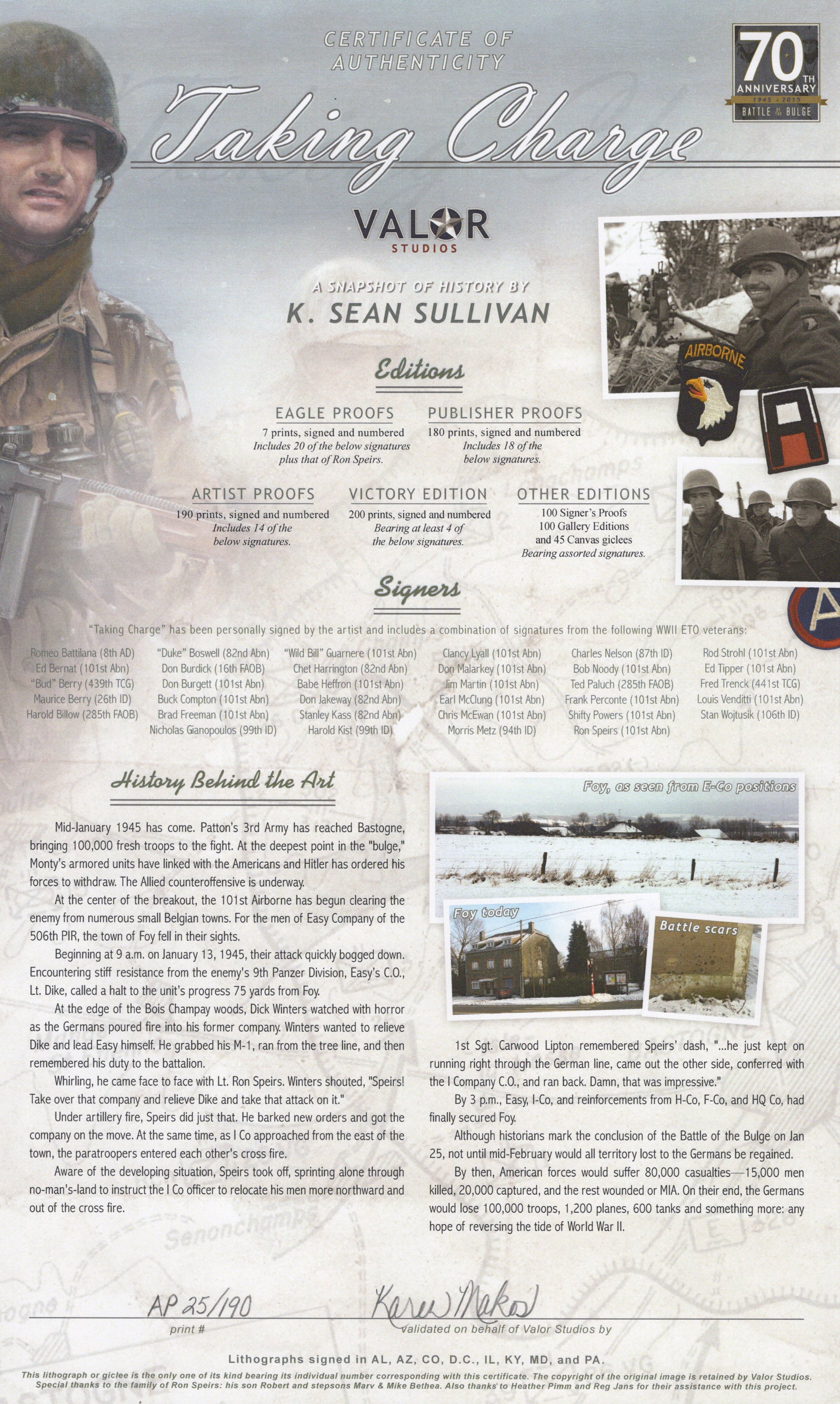 There are 21 signatures of veterans total, 9 of whom are members of Easy Company and one of whom was the commander of the 101st Airborne Division. The set comes with its original Certificate of Authenticity which matches to the print, being Artist Proof Number 25 out of 190.